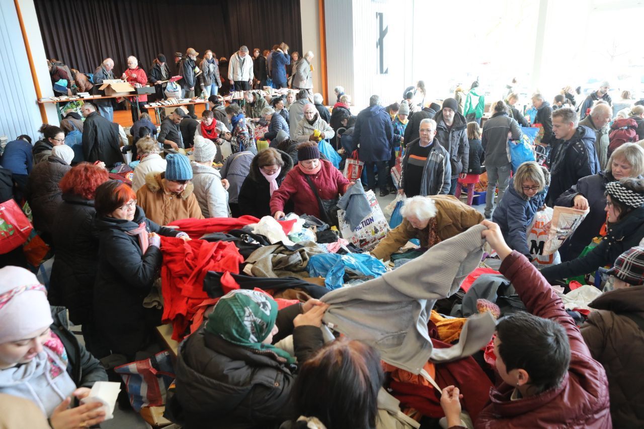 Waiblingen-Hegnach. Vor der Hartwaldhalle stehen ein Paar Skistiefel, eine Stehlampe und ein CD-Kassettengerät aus der Ära vor den Streamingdiensten auf dem Bürgersteig. Die Besitzerin leert ihren Kastenwagen, stellt zwei weitere Umzugskartons und eine Tasche mit Wäsche dazu. „Das muss alles da rein“, zeigt sie auf die Eingangstür, die von einer Menschenmenge belagert ist.