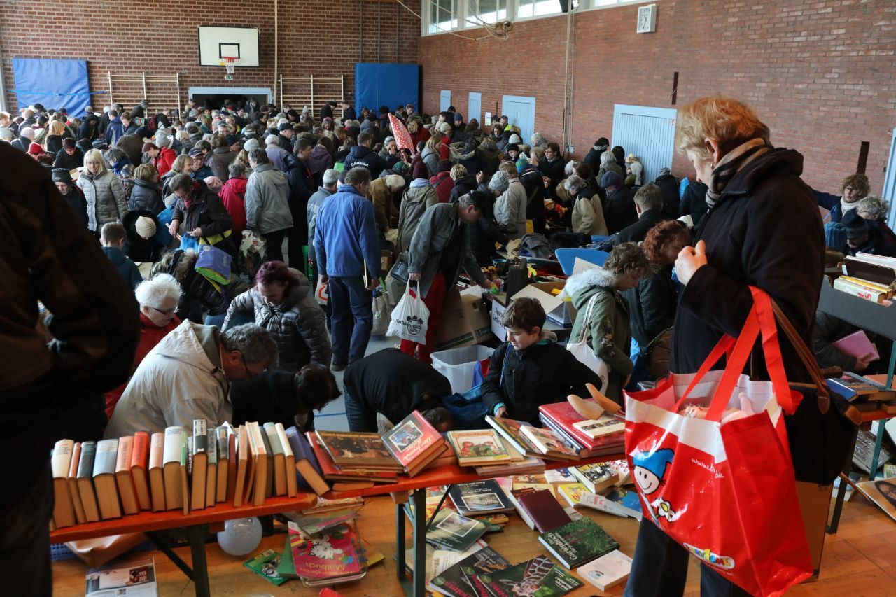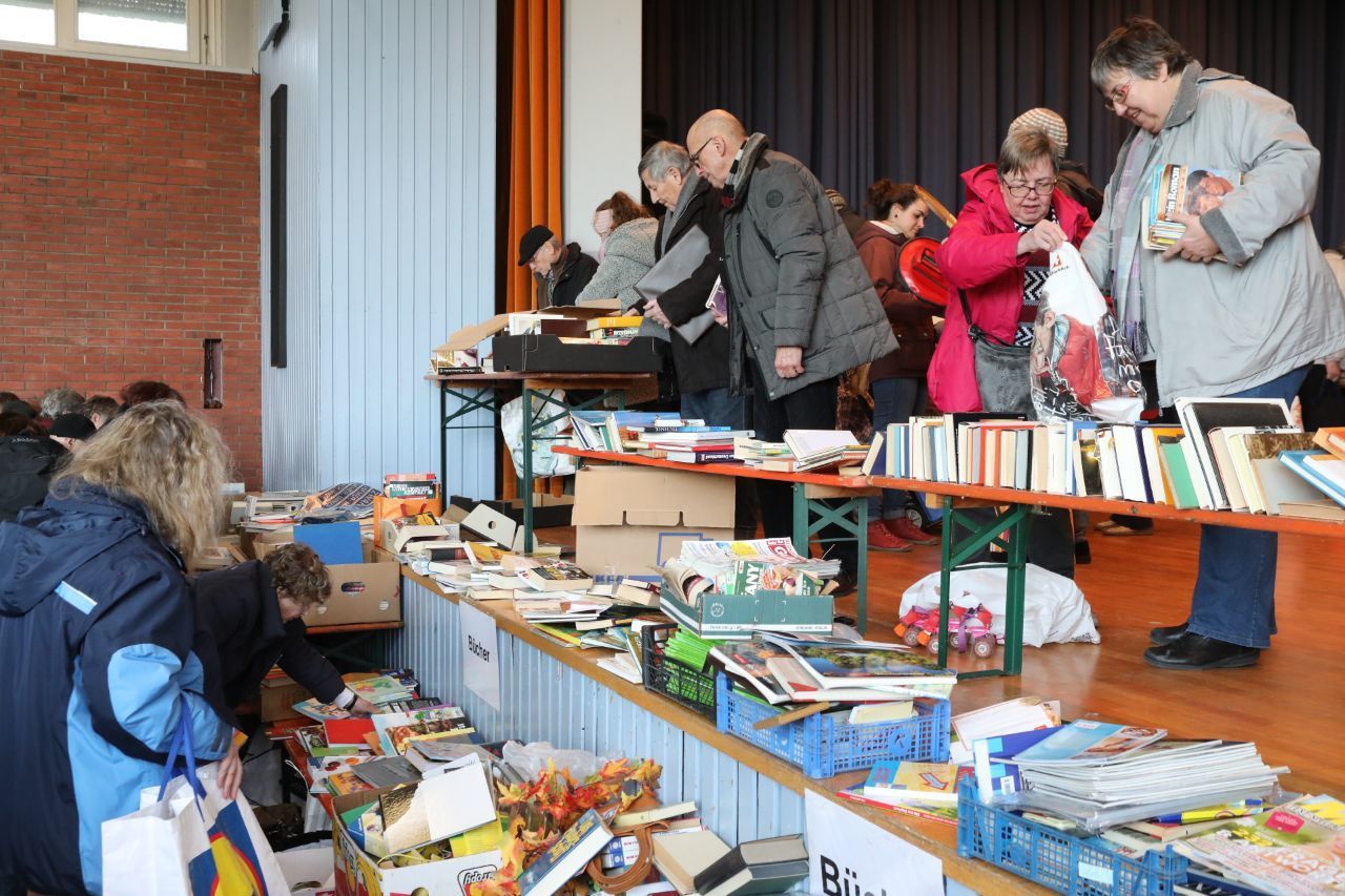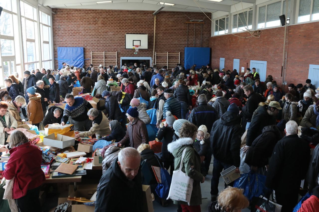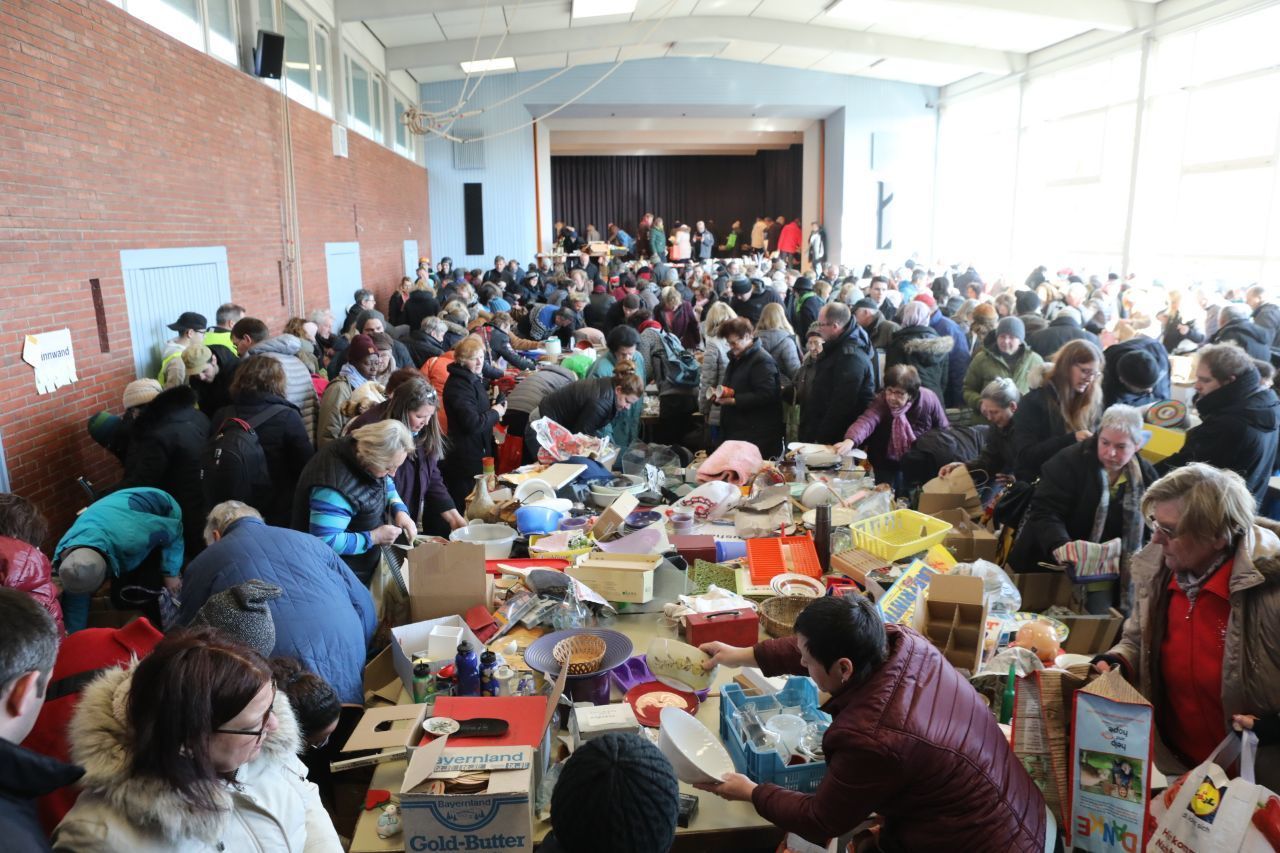 Die Halle wird geöffnet, die Tische sind freigegeben, ein Schauspiel bricht los: Einige rennen, um als Erste am Tisch zu stehen. Hände greifen nach Spielen, Töpfen, Lampenschirmen, Mixern, Kaffeemaschinen. Läpple ist überrascht, „wie viel zusammengekommen ist und wie viele Leute etwas davon haben“.