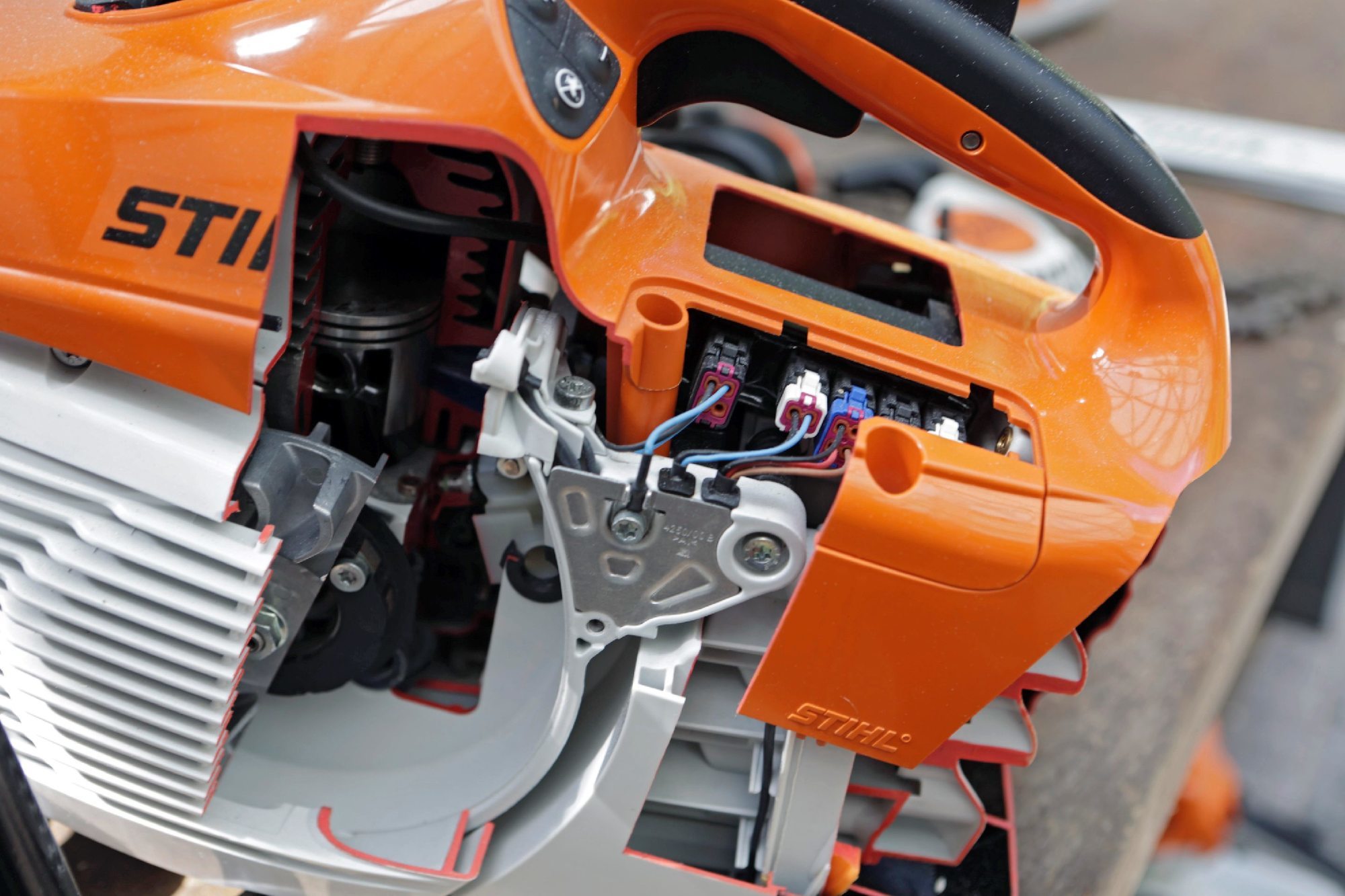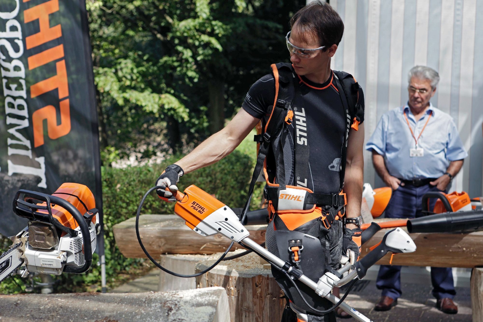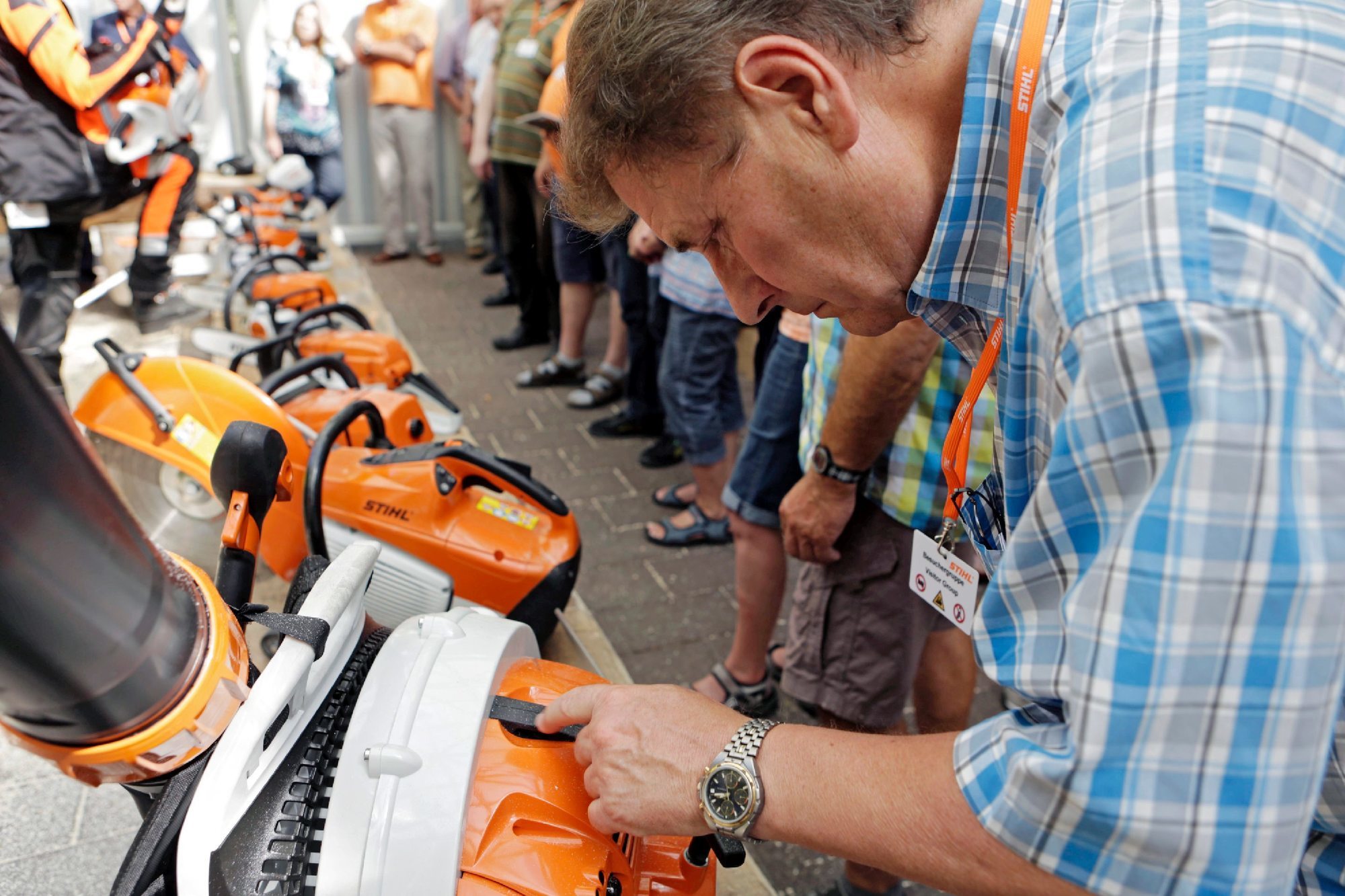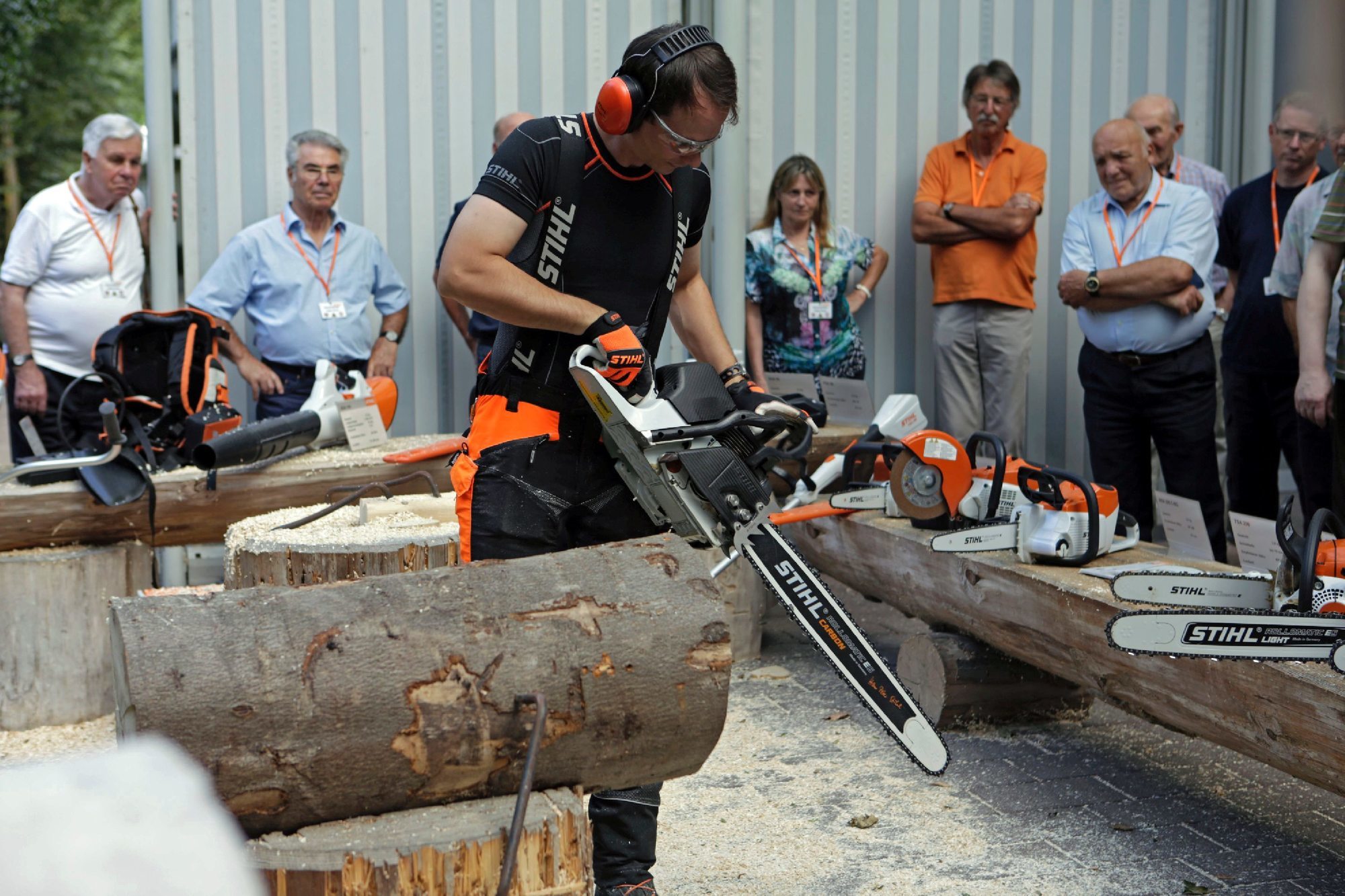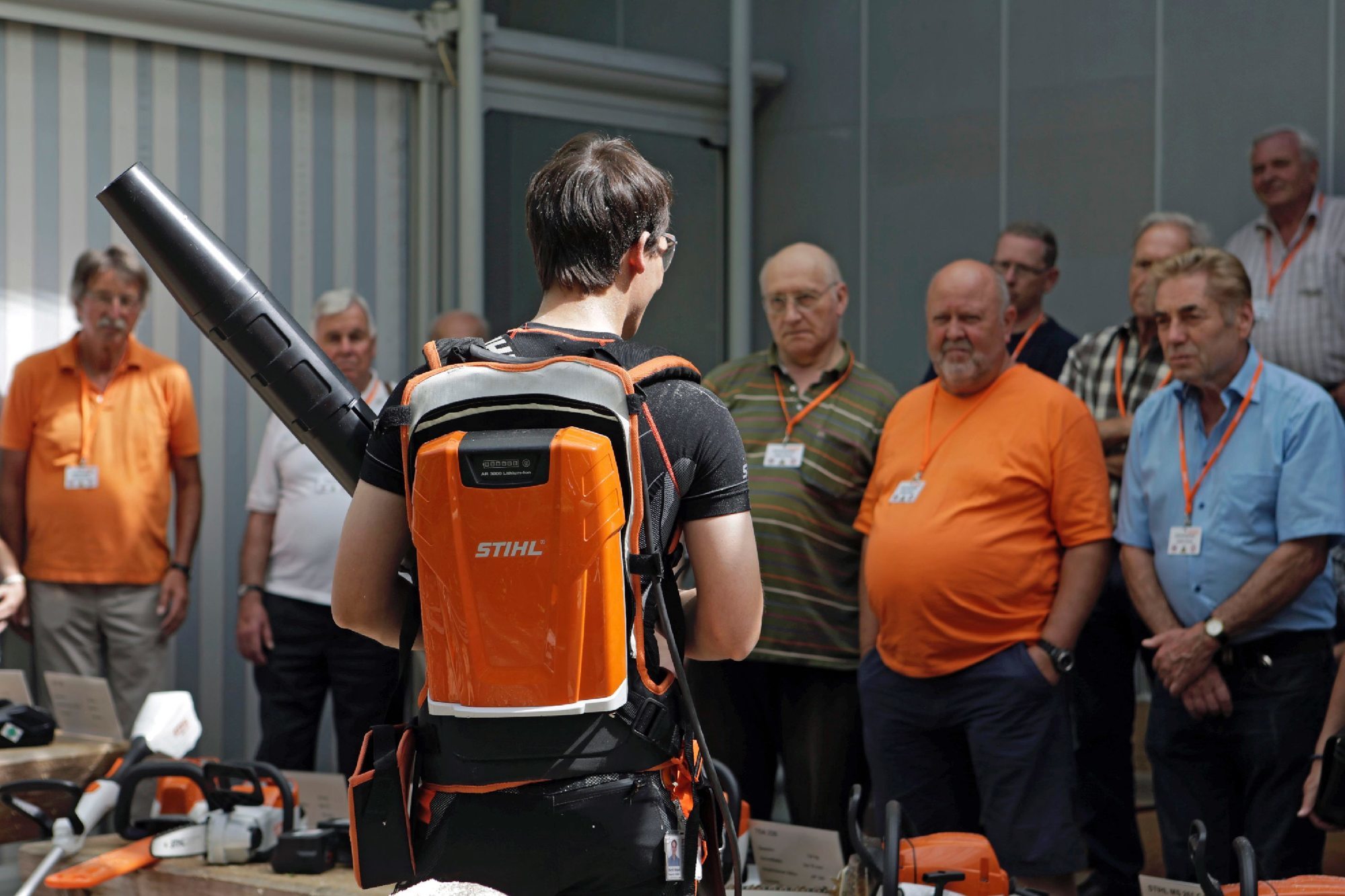 Stihl-Produkte bekommt man ausschließlich über den Fachhandel, betont Kommunikationschef Stefan Caspari in seiner Begrüßung. Daher sind vor allem Profis Kunden des Unternehmens und „anspruchsvolle Privatanwender“ entweder mit großem Garten oder kleinem Waldstück. Unter den Besuchern scheint es einige zu geben. Als Caspari fragt, wer ein Stihl-Gerät zu Hause hat, gehen zahlreiche Finger hoch. Mit der E-Mobilisierung der Produktpallette hofft das Unternehmen, noch viele neue „anspruchsvolle Privatanwender“ als Kunden gewinnen zu können.