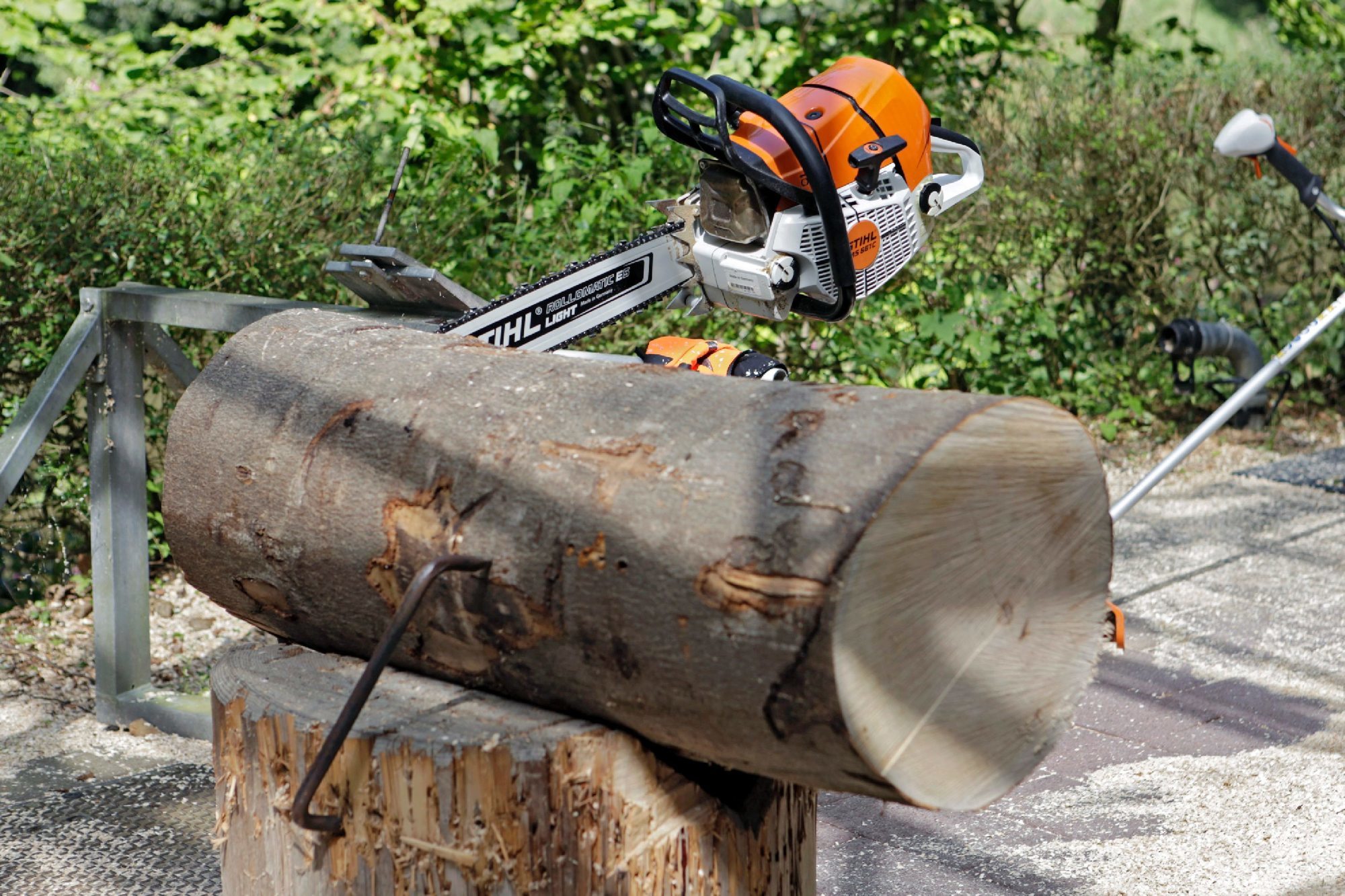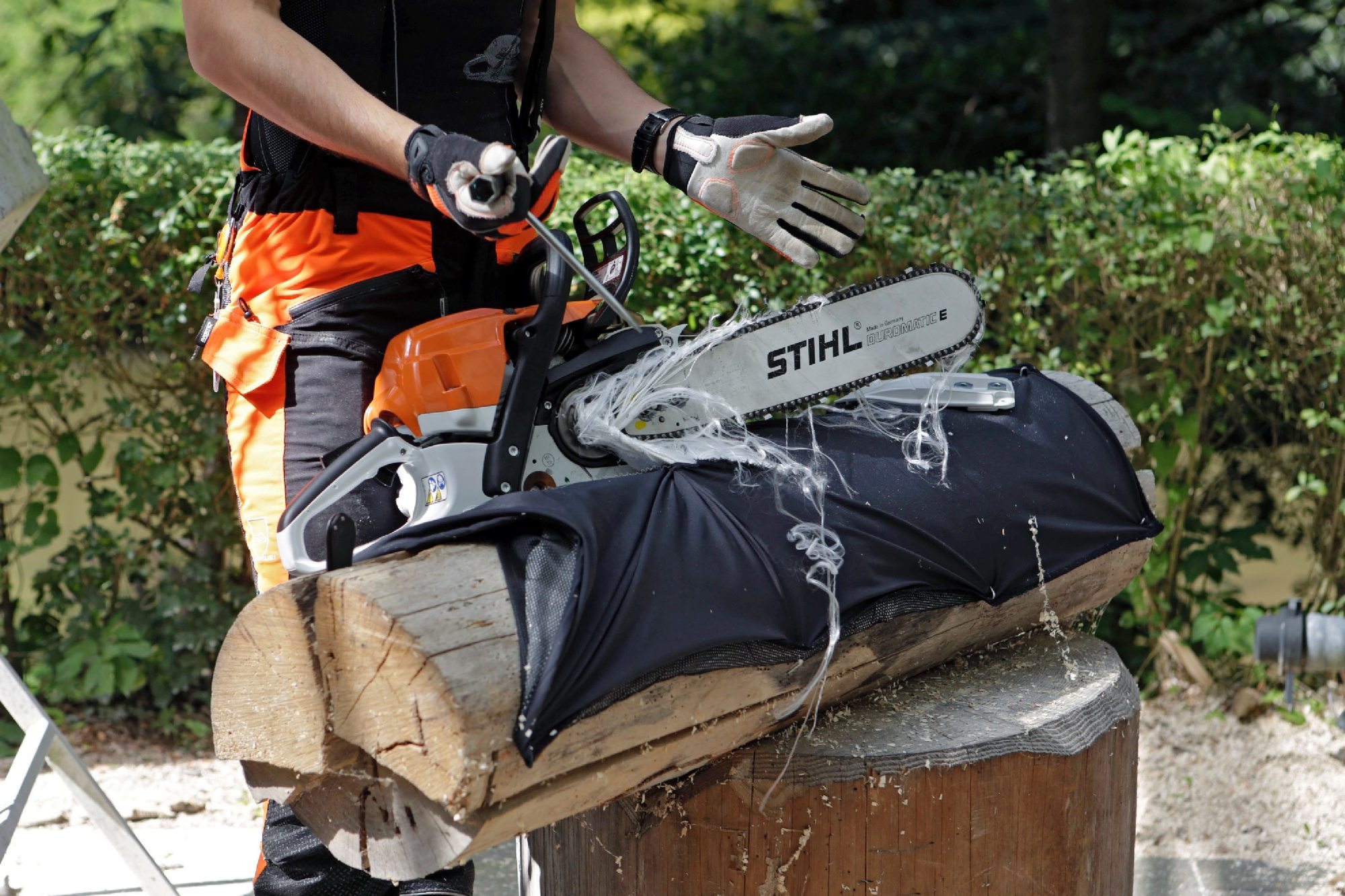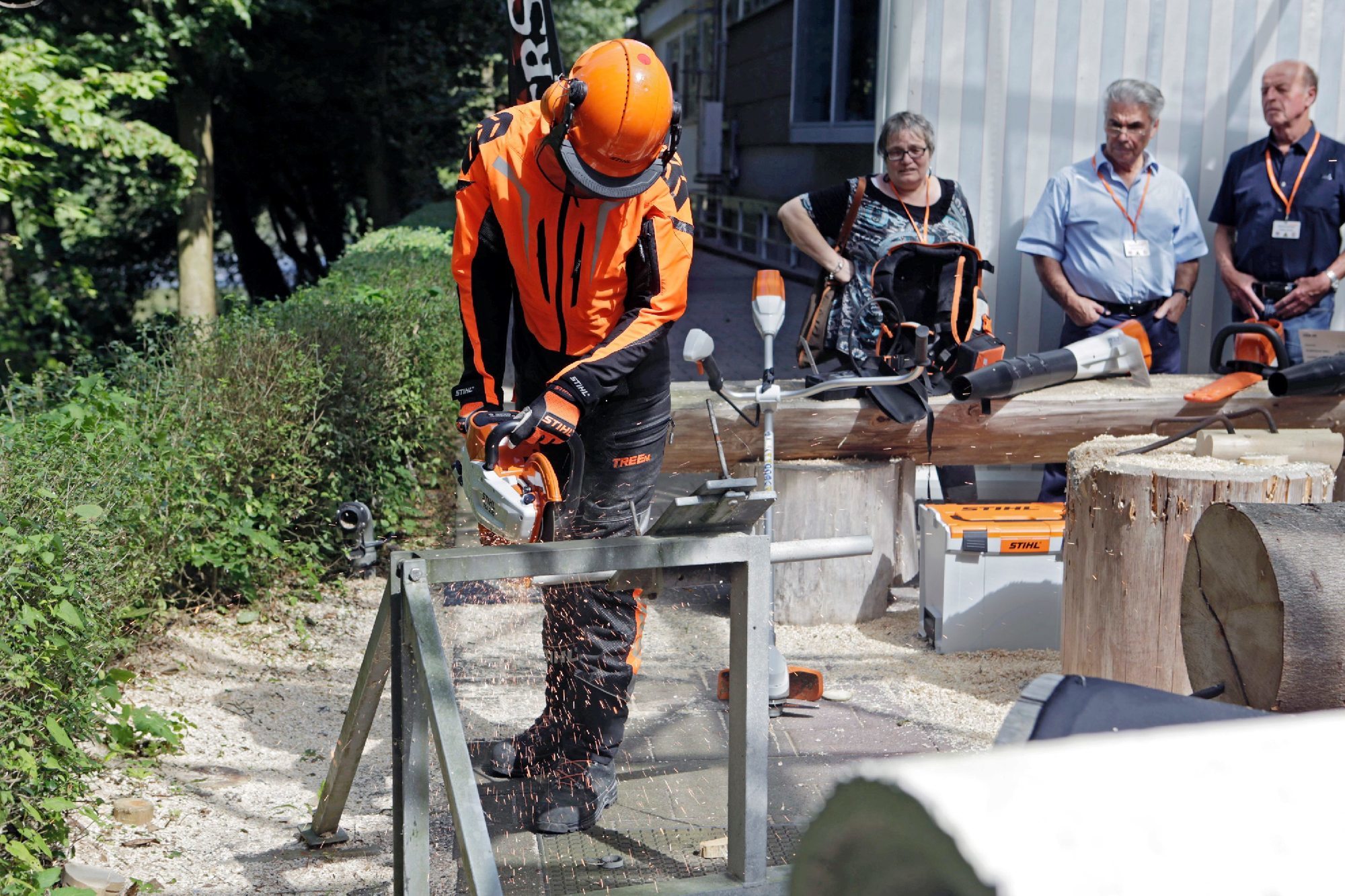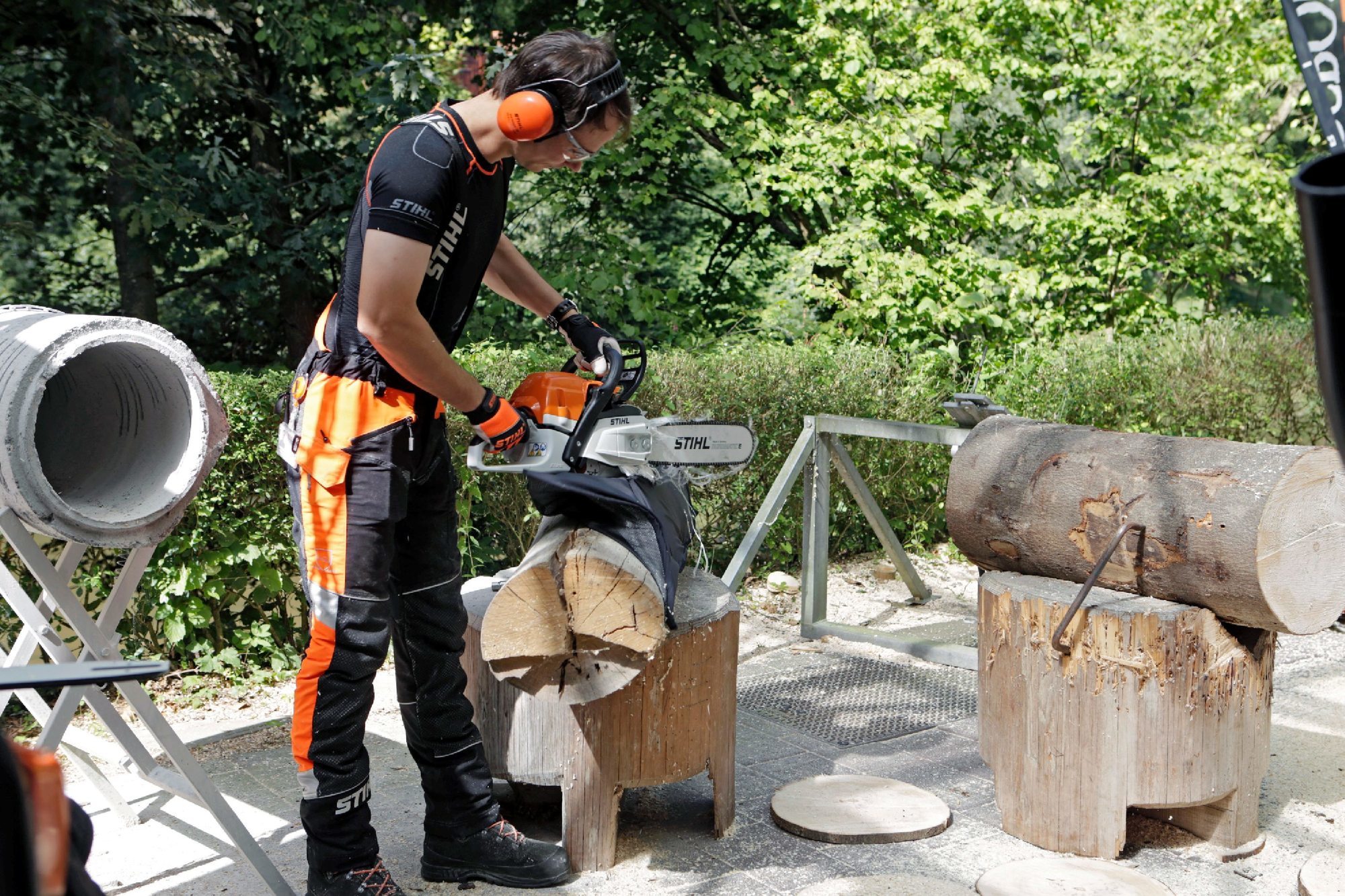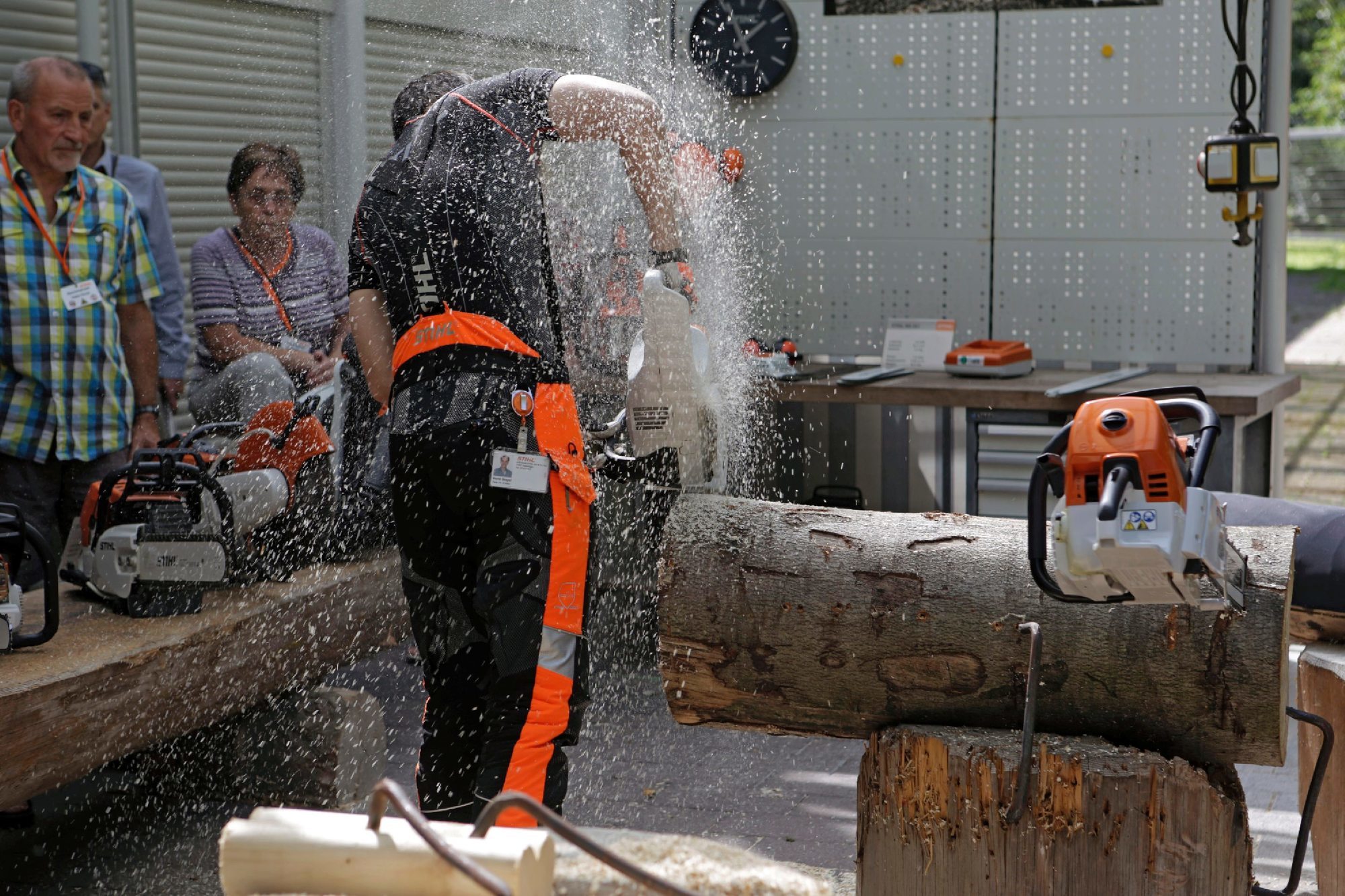 Bertil Stapel darf demonstrieren, welche Kraft in den Stihl-Geräten steckt. Insbesondere einigen männlichen Besuchern zuckt es in den Fingern. Sie würden ihm die Arbeit sicher gerne abnehmen und mit großem Vergnügen den Baumstamm in handliche Scheiben sägen. Aber selbst testen, geht leider nicht. Dafür ist ausreichend Schutzkleidung notwendig – angefangen von einer Brille bis zu den Sicherheitsschuhen mit der Stahlkappe im Zehenbereich.