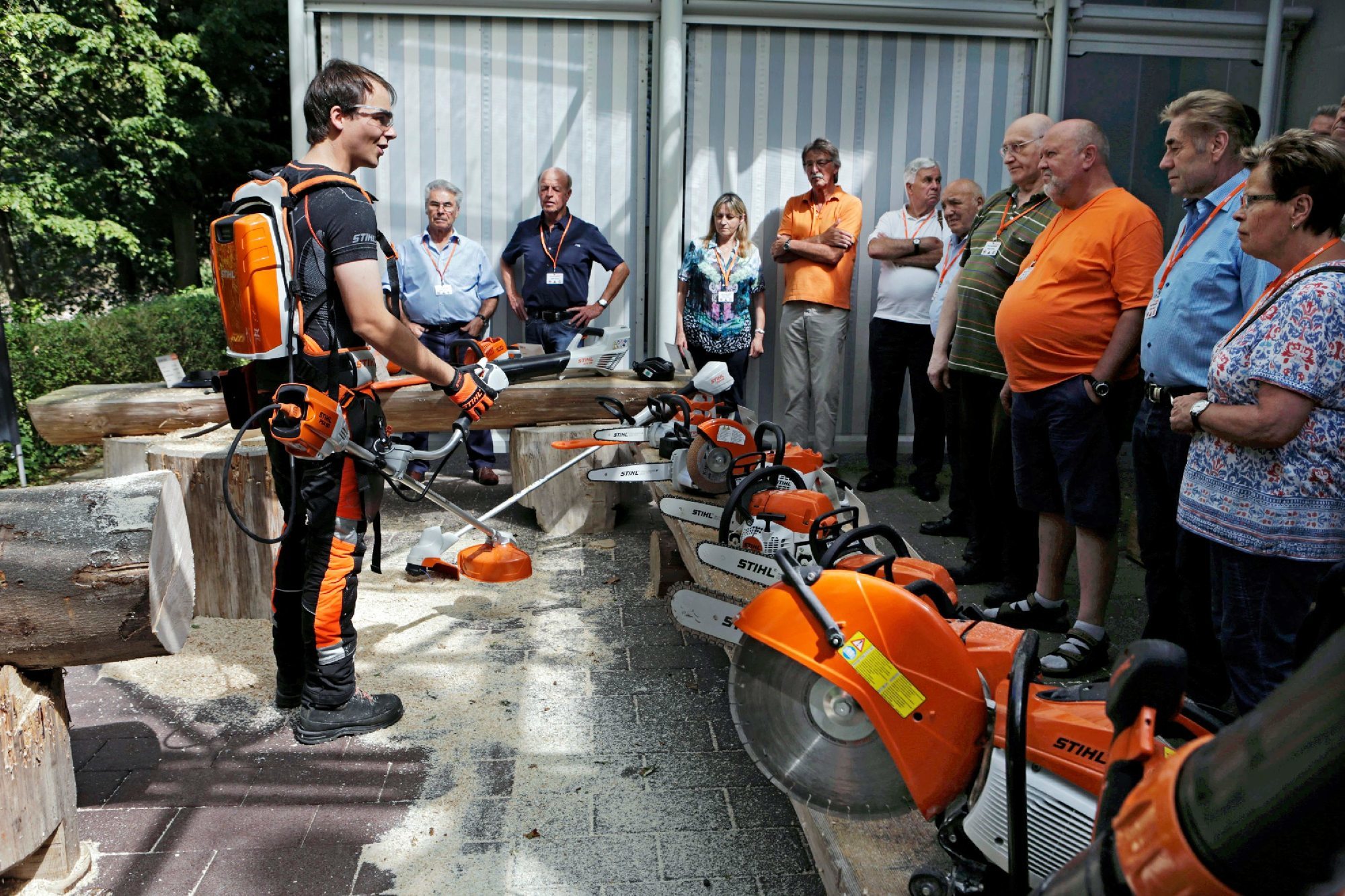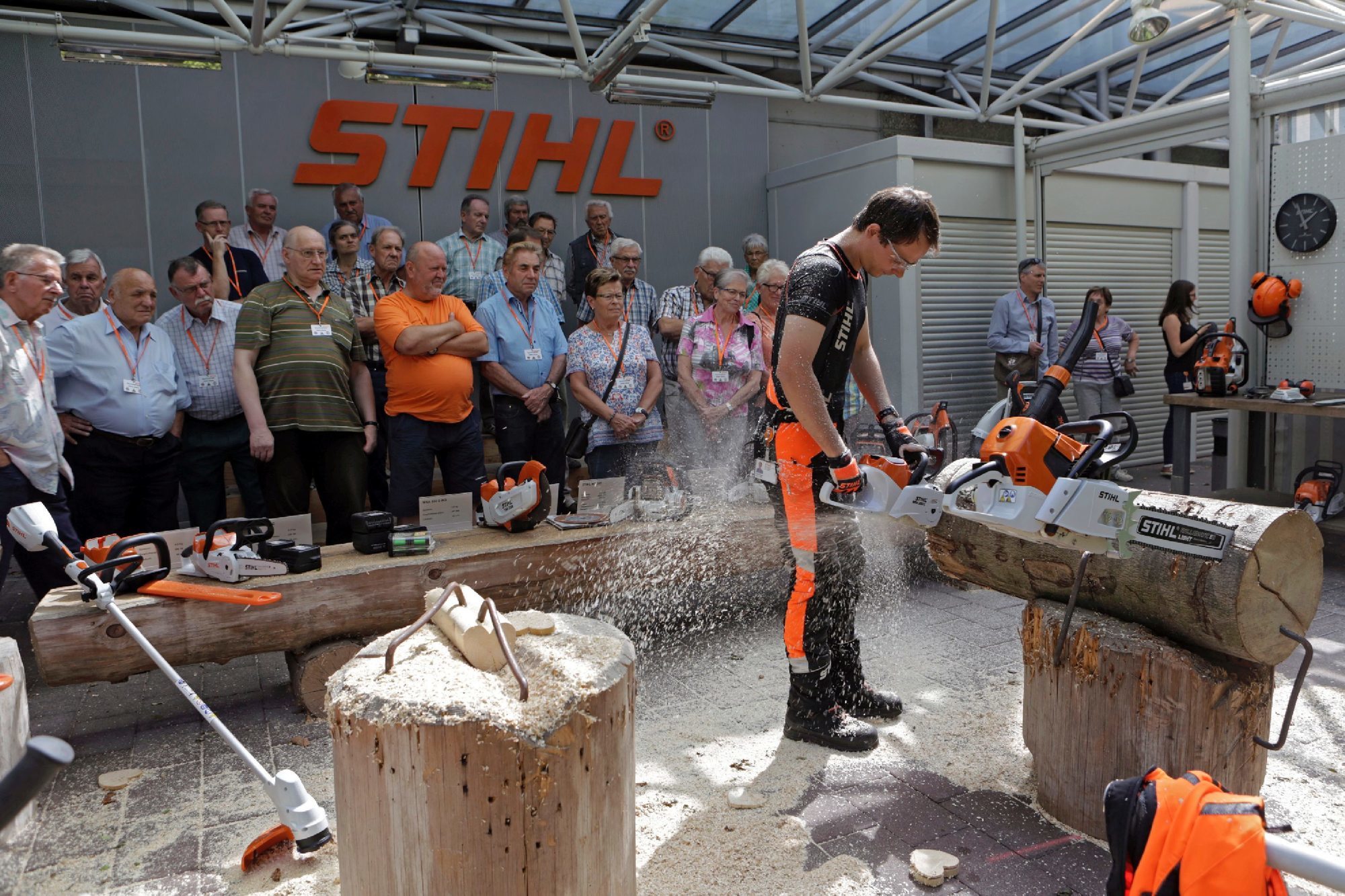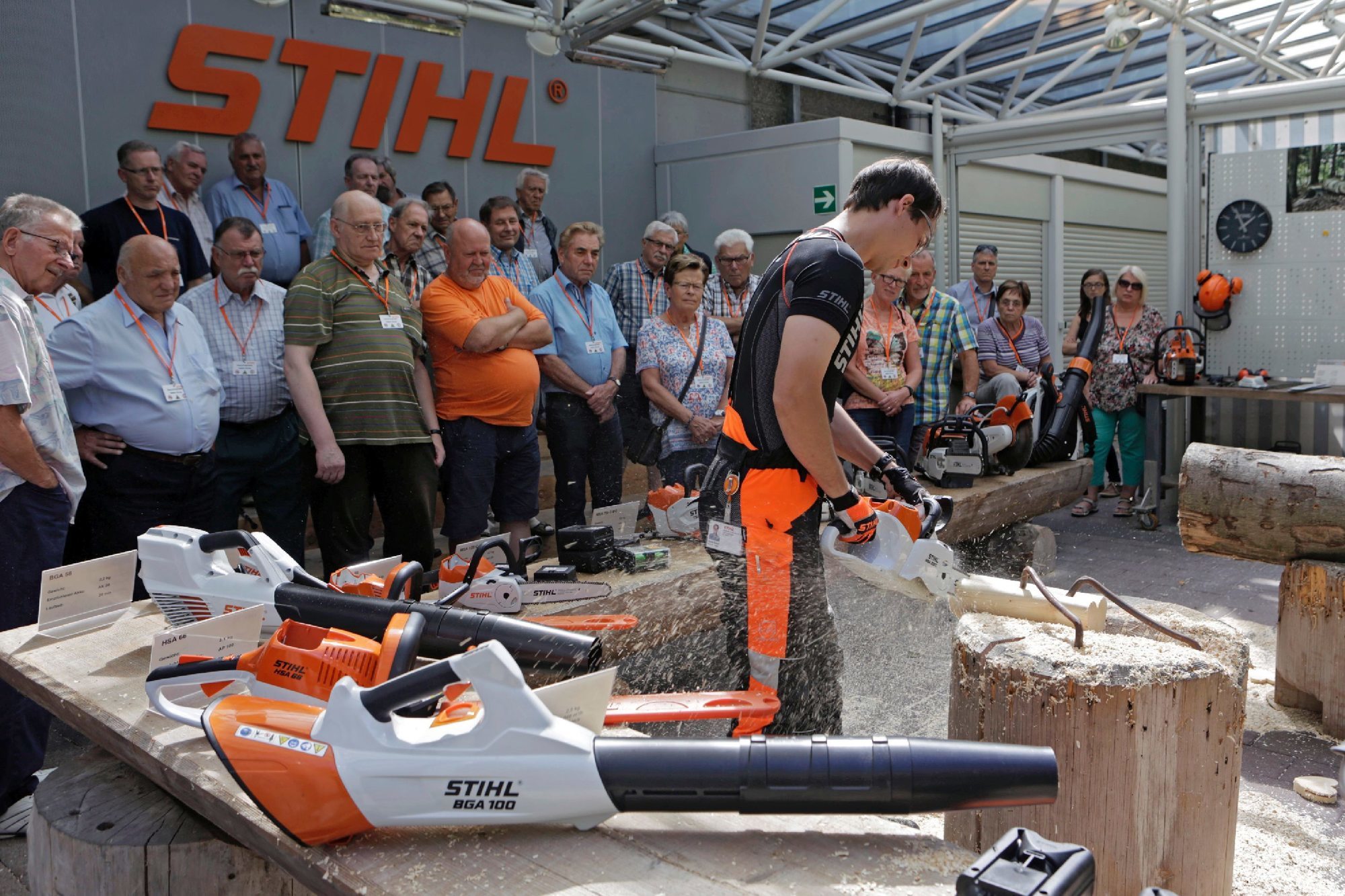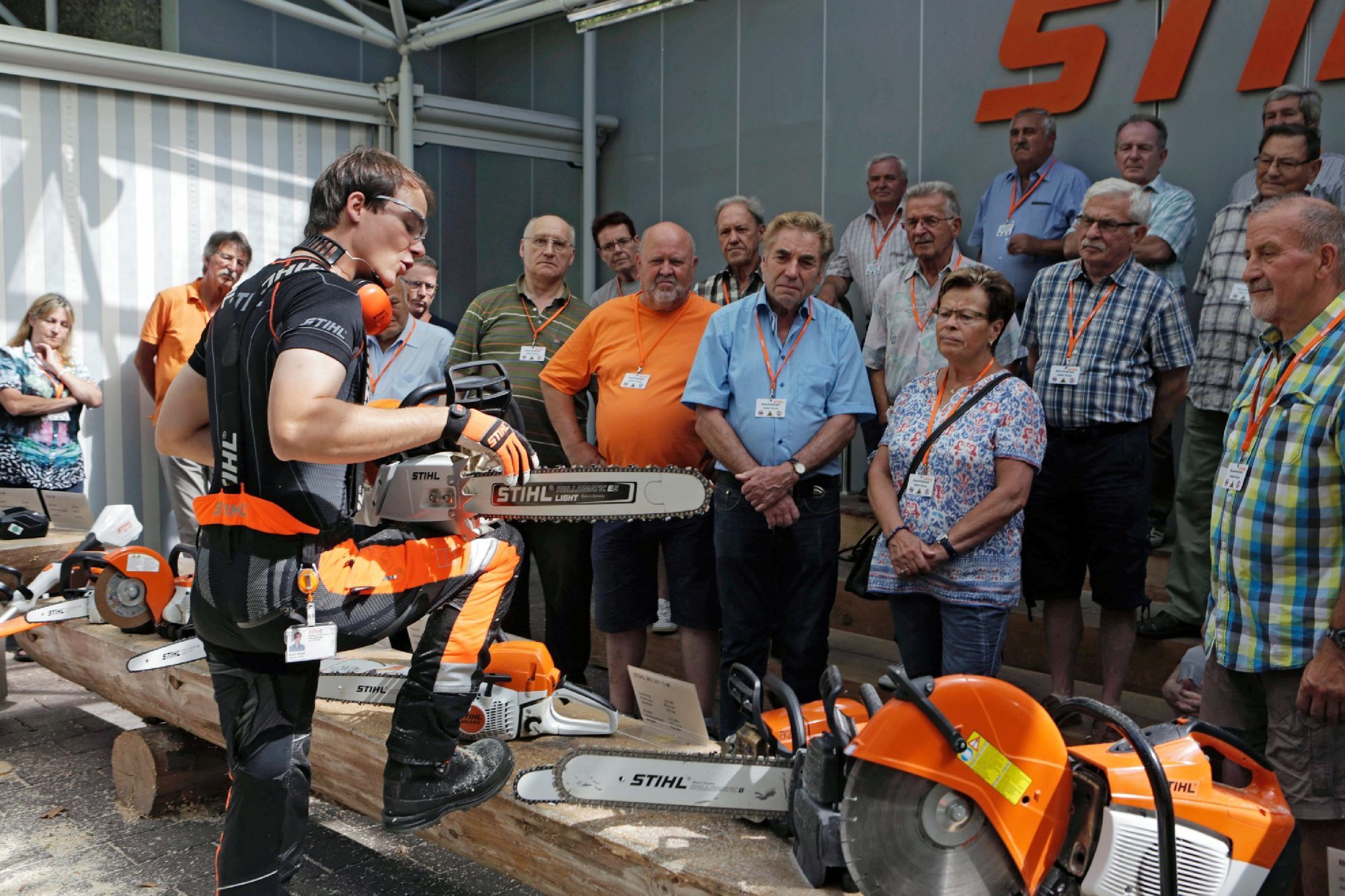 Einen der schönsten Arbeitsplätze hat ganz sicher Bertil Stapel. Den lernen die Leser aus dem Verbreitungsgebiet des Zeitungsverlags Waiblingen zum Abschluss ihrer insgesamt sechsstündigen geführten Tour in Werk 1 kennen. Die Aufgabe des jungen Manns ist die Produktpräsentation, und die macht er im Grünen hinter dem Firmenmuseum. Statt Fabriklärm sind Vögel zu hören. Hinter seinem Arbeitsplatz fließt idyllisch die Rems, vor ihm hat er einige Stücke Holz und die wichtigsten Motorgeräte aufgebaut, und alle sie sind betriebsbereit.