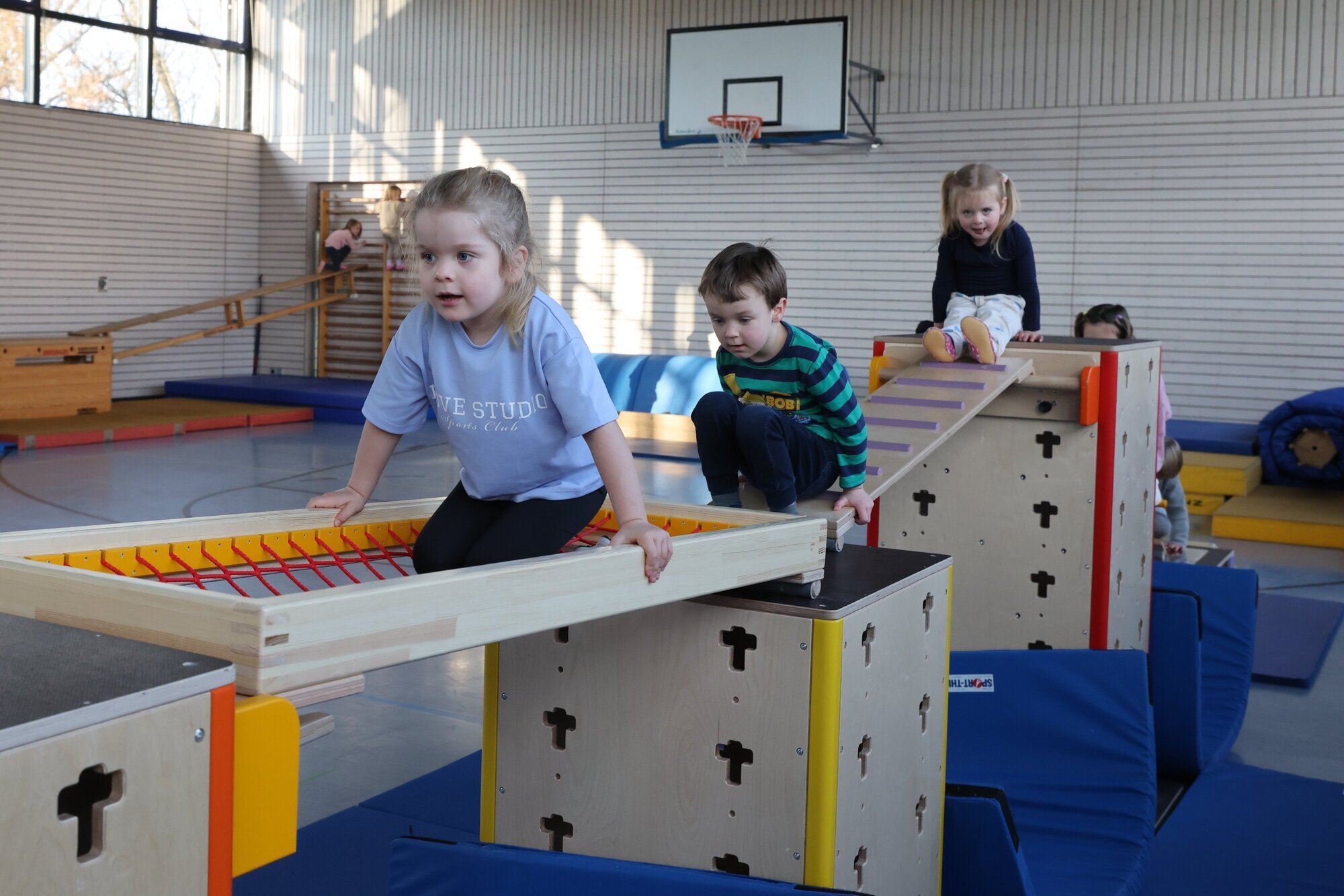 Waiblingen. Vorsichtig tasten sich die kleinen Klettermeister in der VfL-Turnhalle an das Hindernis: Erst geht es über ein Gitternetz nach oben auf einen Kasten, dann weiter über eine Sprossenleiter auf einen höheren Kasten. Es folgen eine Seilgitterbrücke und eine Balancierstange, bevor es dann per Rutsche auf das große Trampolin geht. Seit November 2025 gibt es in der Turnhalle des VfL-Waiblingen unterschiedliche neue Elemente für den Bereich Kindersport, die in der