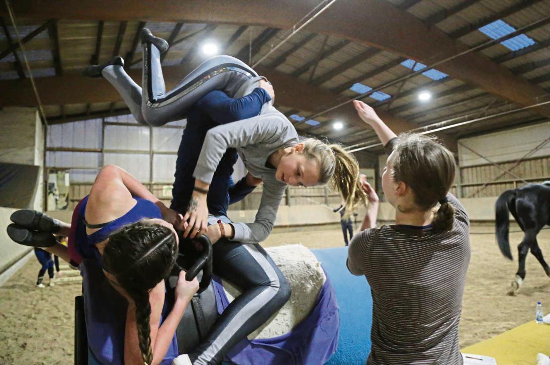 Die Faszination des Sports mache auch das Zusammenspiel zwischen Mensch, Pferd und innerhalb der Gruppe aus, sagt die 15-jährige Helen. „Und es ist kein normaler Sport, wie Fußball oder so. Das macht nicht jeder“, ergänzt Hannah, ebenfalls 15 Jahre alt. „Ganz ungefährlich ist es aber auch nicht.“ Und tatsächlich: Jede der Voltigiererinnen hat schon von mehr oder weniger schweren Verletzungen zu berichten. Gerissene Kreuzbänder, gebrochene Sprunggelenke oder Mittelfüße – nur eine nicht, die Älteste in der Mädelstruppe, die 29-jährige Christin. „Ich voltigiere seit 20 Jahren und mir ist noch nie etwas passiert“, sagt sie. Und durch die komplexen Bewegungsabläufe, fügt sie hinzu, „fördert Voltigieren auch das Hirn“.