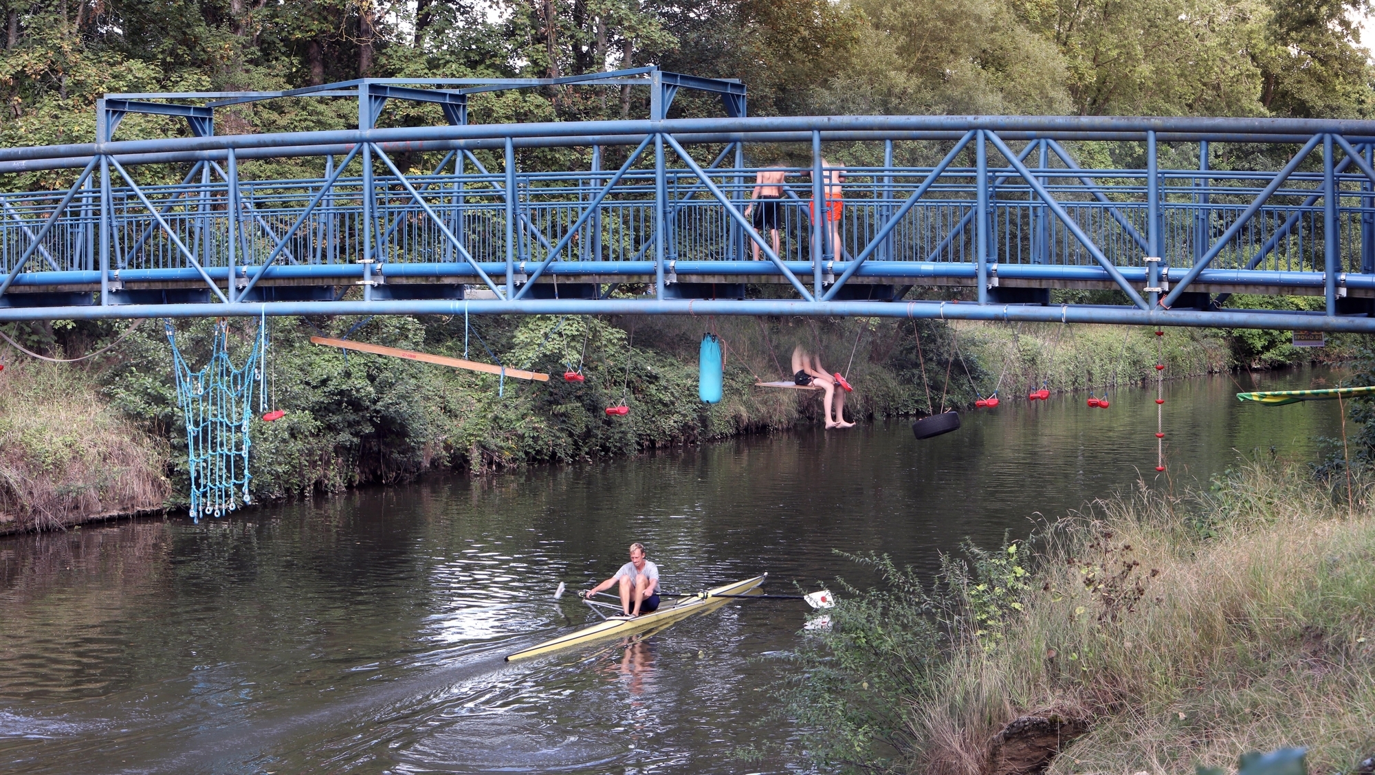 Um 17.30 Uhr ist es immer noch ziemlich heiß. Über die Fußgängerbrücke, die von der Rundsporthalle aus Richtung Freibad und VfL-Gelände über die Rems führt, flanieren sommerlich bekleidete Menschen. Zwischen ihnen rennen einige etwa 13-jährige Jungs in Badehosen umher, blödeln herum, beschimpfen sich gegenseitig, lachen. Sie springen von der Brücke ins nur brusttiefe Wasser, planschen in der Rems, klettern den unter der Brücke aufgehängten Parcours entlang und lassen sich von dort wieder in