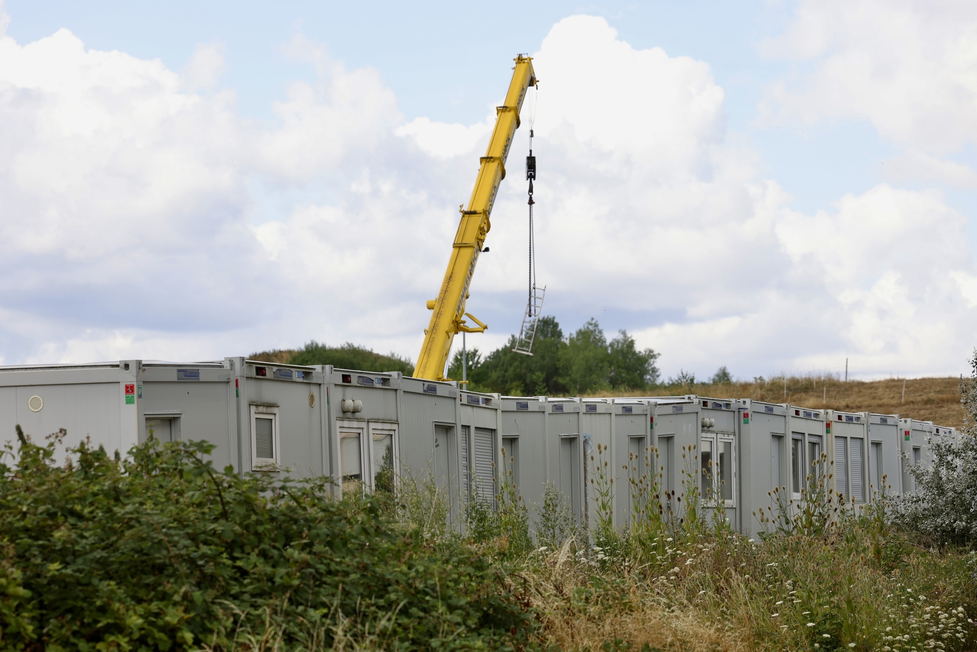 Die mit Türen und Fenstern ausgestatteten Container stehen dort ordentlich aufgereiht nebeneinander, abgestellt von einem Kranfahrzeug der Waiblinger Kran- und Spezialtransportfirma Winkelhock,