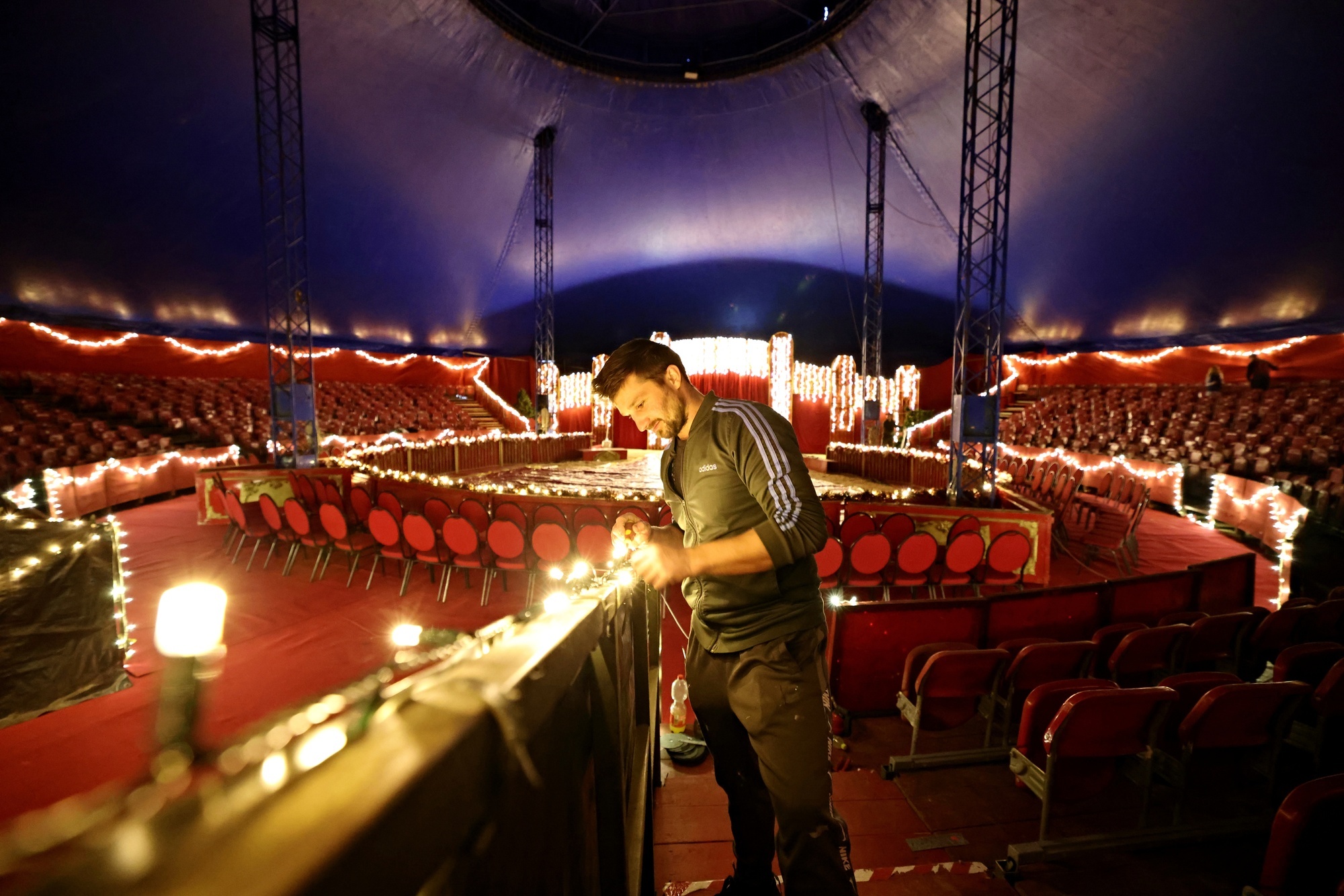 Kevin Sperlich und Miguel Weißert stehen mitten im Zirkuszelt des Waiblinger Weihnachtscircus. Sie montieren gerade die Loge - sozusagen die