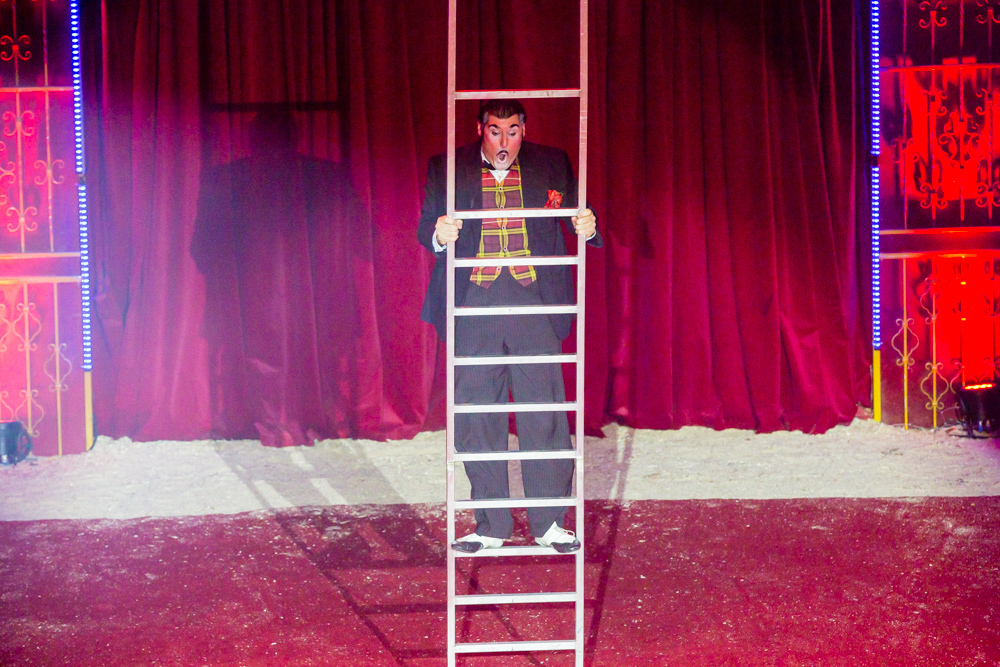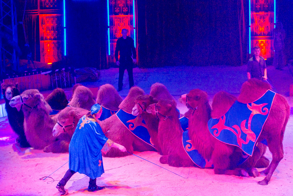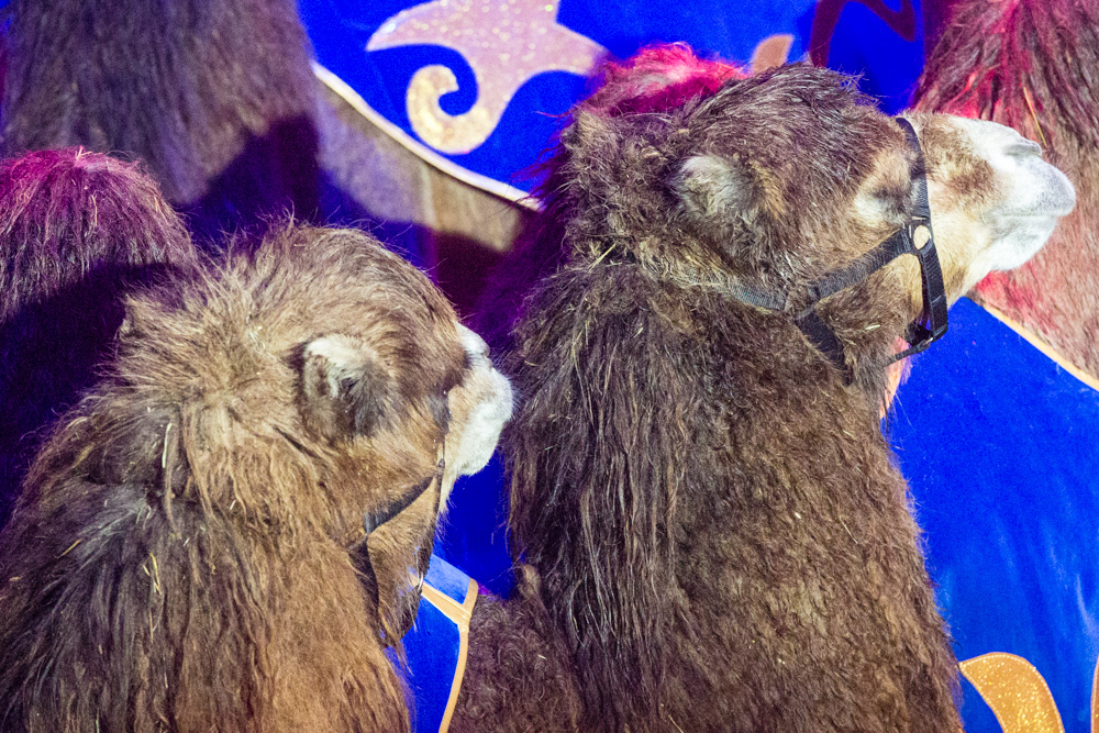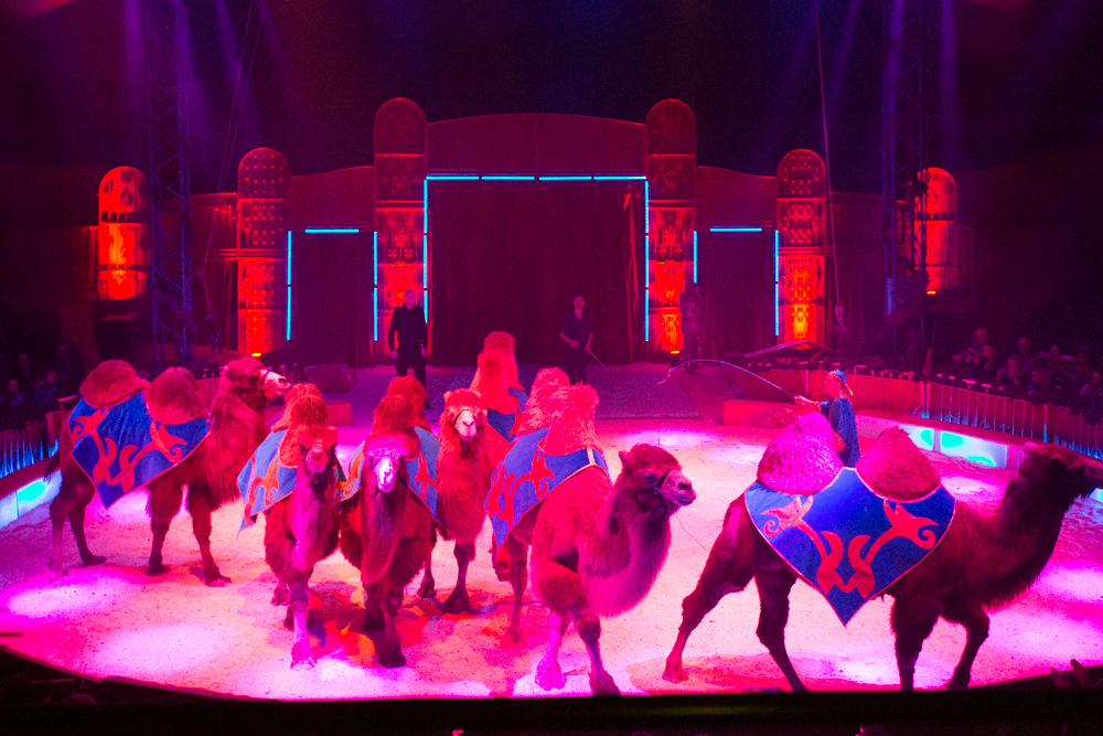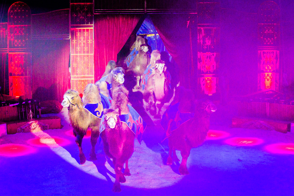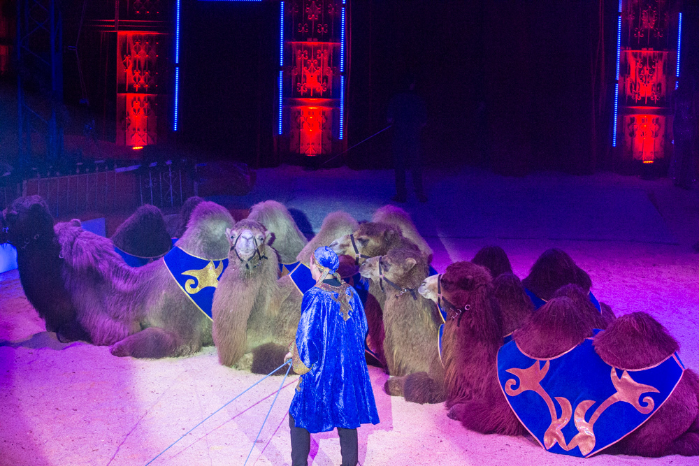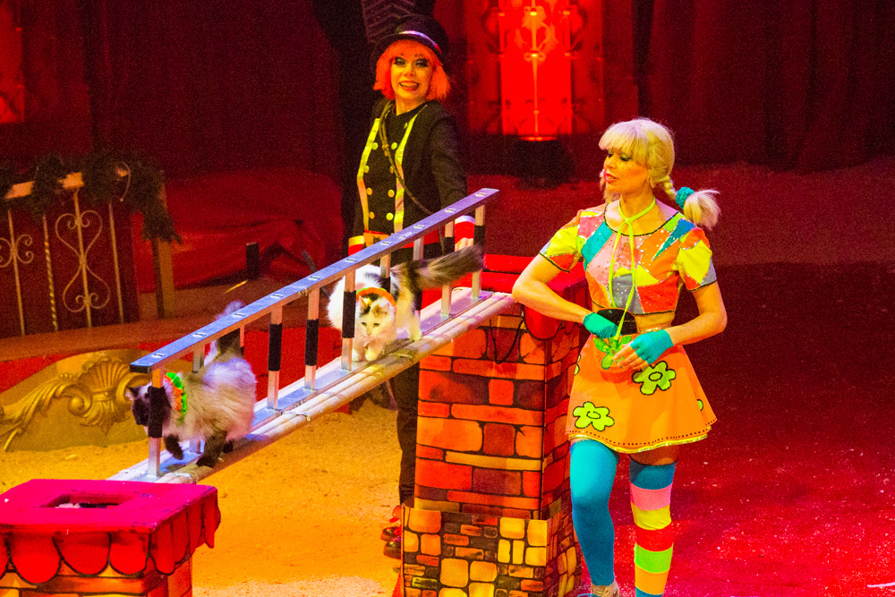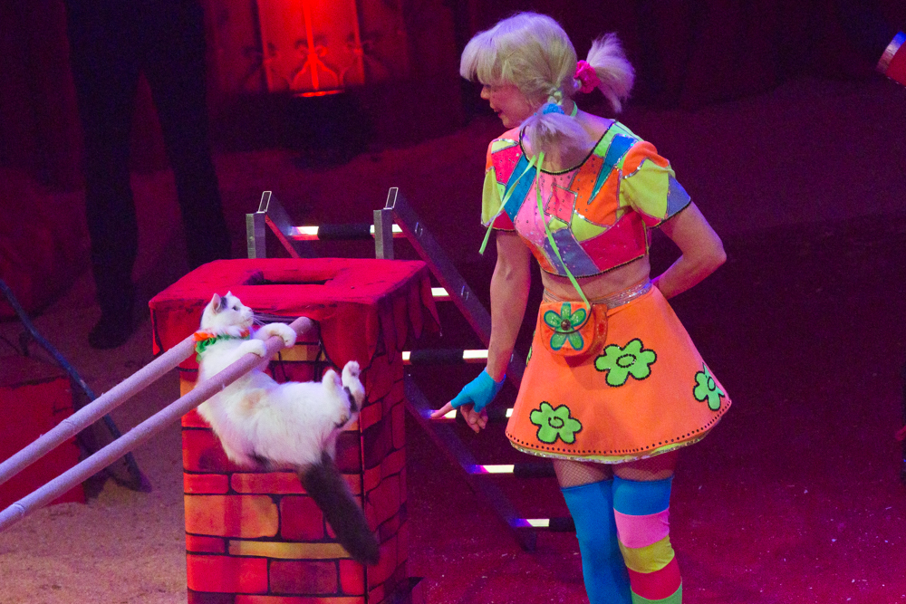 Dann ist die Manege frei für die sechs Wüstenkamele, die nicht immer ganz sortiert, aber immer nett anzuschauen ihre Kreise um ihren Dompteur ziehen. Angekündigt wird jede Nummer nicht von einem Zirkusdirektor, sondern von einer Direktorin, mal im goldenen Glitzer-Dress, mal rot funkelnd oder grün changierend. Auf einer frei stehenden Leiter zeigt der Italo-Clown sein artistisches Geschick, zwei andere Artisten zeigen ihres auf breiten Pferderücken und wieder andere auf Fahrrädern. Dass nicht nur Hunde, sondern auch Katzen sich dressieren lassen, demonstrieren zwei Clown-Frauen in bunten Kostümen.