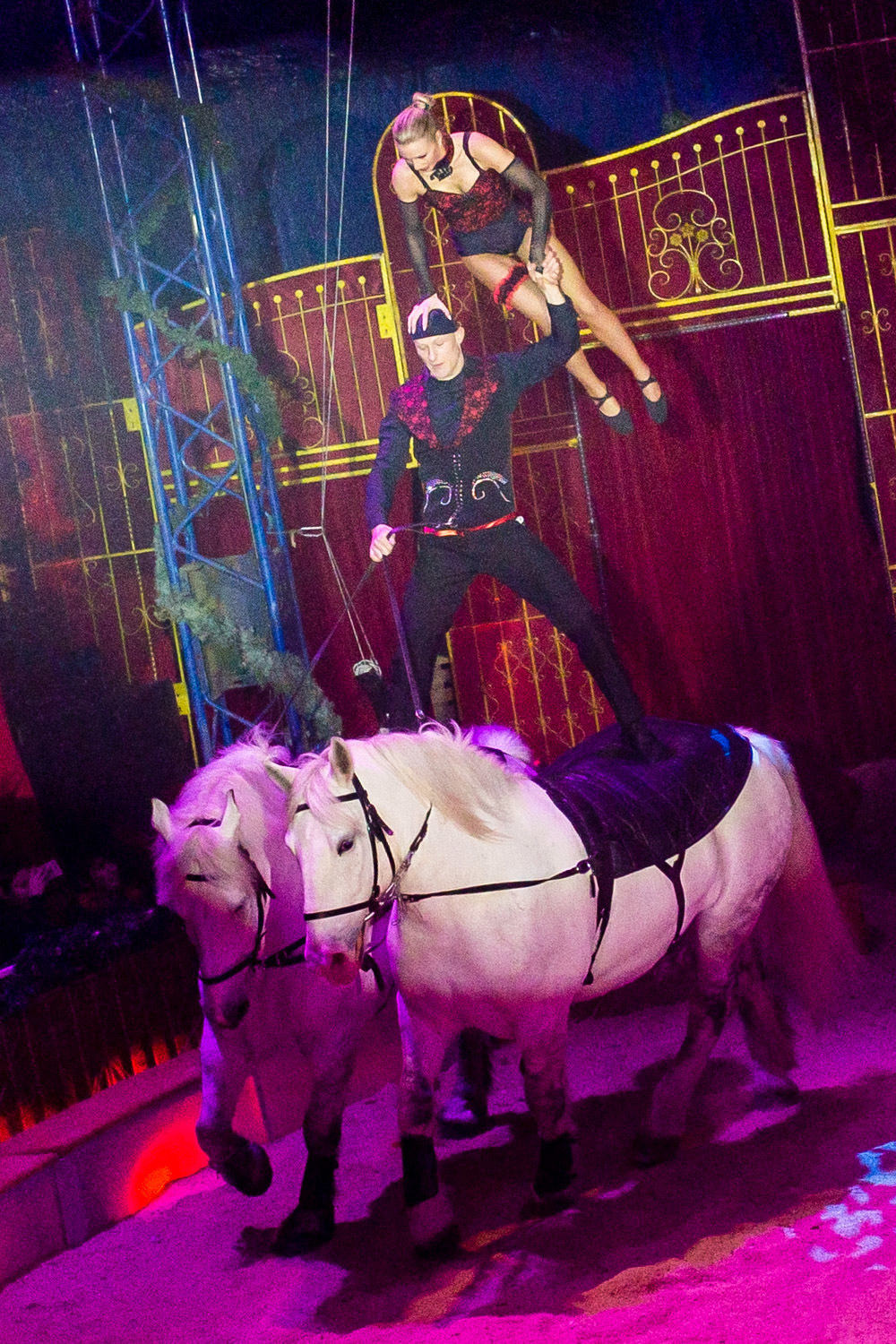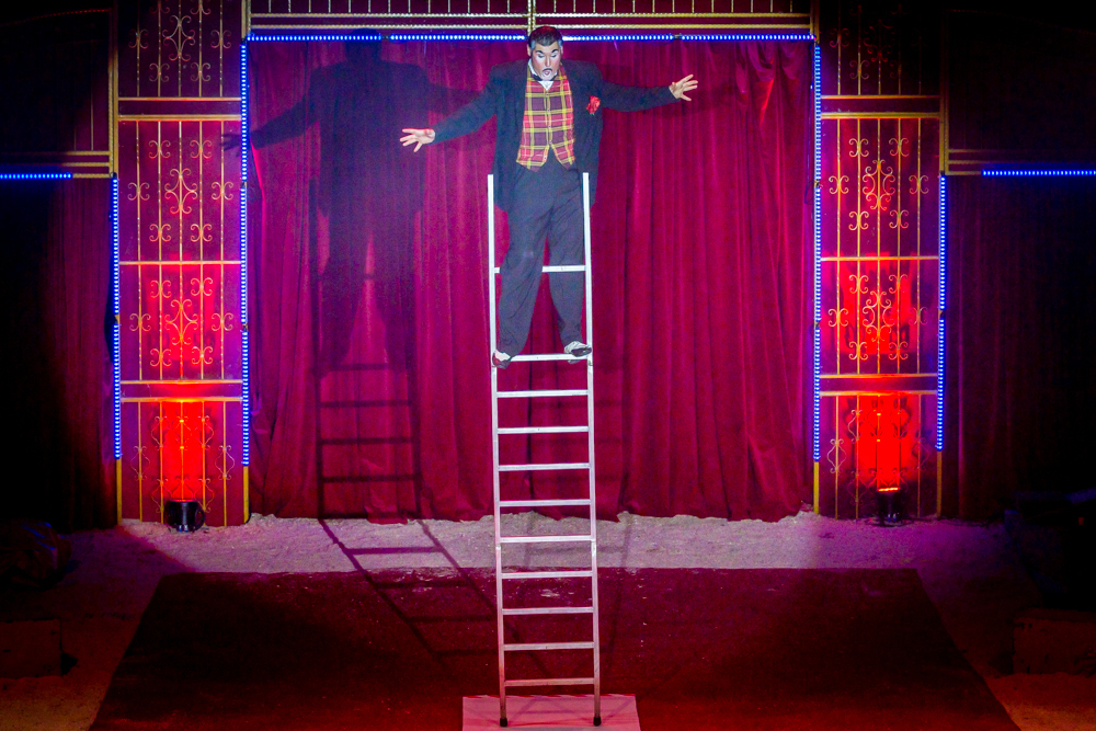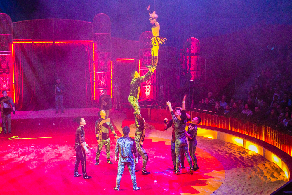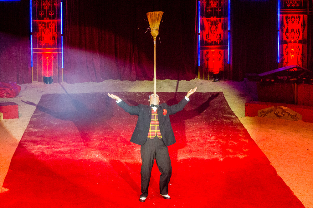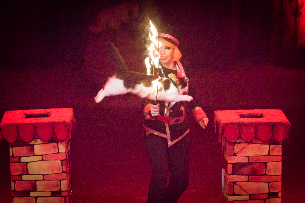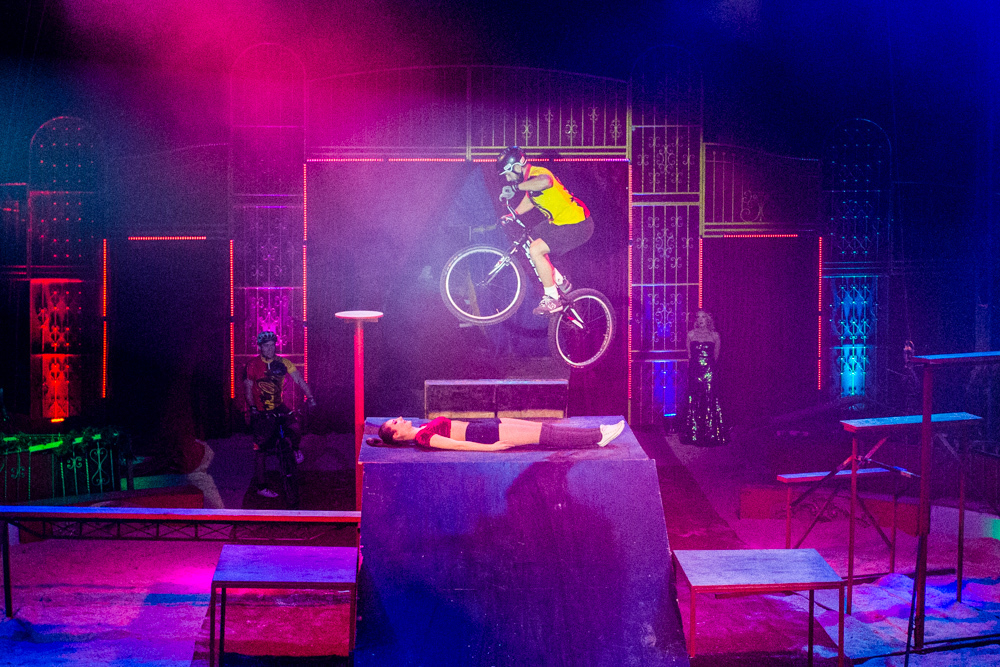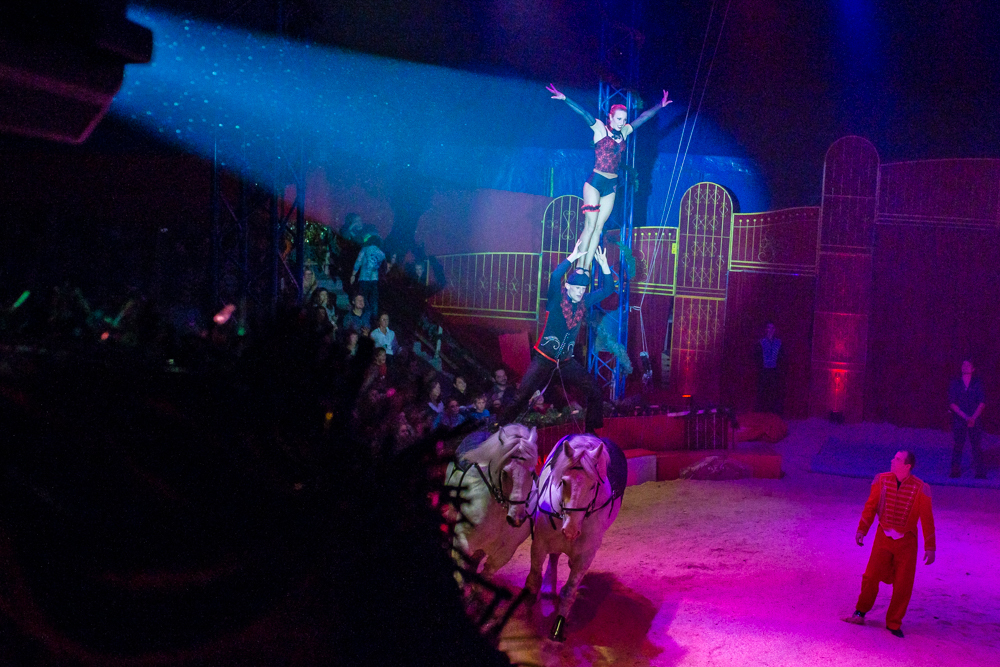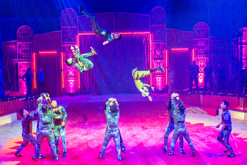 Dann ist die Manege frei für die sechs Wüstenkamele, die nicht immer ganz sortiert, aber immer nett anzuschauen ihre Kreise um ihren Dompteur ziehen. Angekündigt wird jede Nummer nicht von einem Zirkusdirektor, sondern von einer Direktorin, mal im goldenen Glitzer-Dress, mal rot funkelnd oder grün changierend. Auf einer frei stehenden Leiter zeigt der Italo-Clown sein artistisches Geschick, zwei andere Artisten zeigen ihres auf breiten Pferderücken und wieder andere auf Fahrrädern. Dass nicht nur Hunde, sondern auch Katzen sich dressieren lassen, demonstrieren zwei Clown-Frauen in bunten Kostümen.
