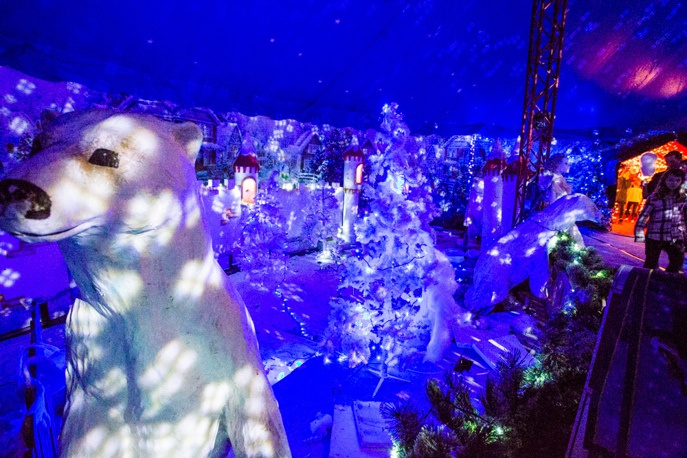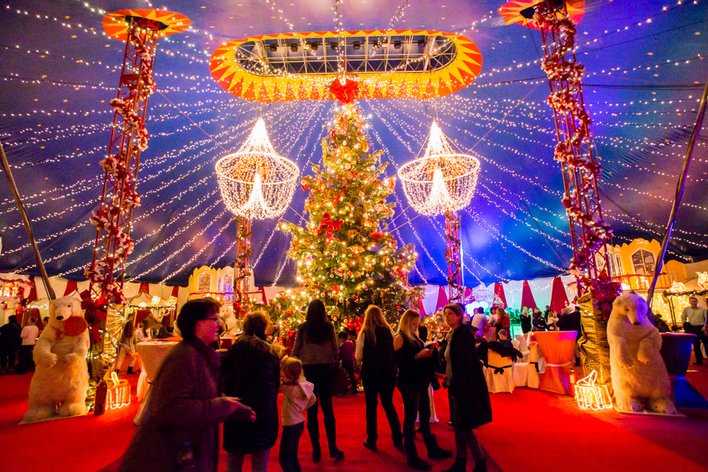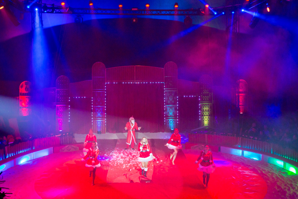 Das Zirkuszelt ist voll besetzt, und noch immer schieben sich die Massen durch ein blau blinkendes Winterwunderland in die nach Popcorn duftende Wärme des Vorzelts, in dessen Mitte ein riesiger, rot, grün und silbern geschmückter Weihnachtsbaum aufragt. Ein kleines blondes Mädchen hat sich auf dem roten Filzteppich niedergelassen. Andächtig sieht die Kleine einen fast lebensgroßen Plüscheisbären an, der gemächlich den Kopf von links nach rechts dreht, während eine Mutter mit Kopftuch ein Erinnerungsbild von ihrem kleinen Sohn im Arm ebendieses Bären macht.