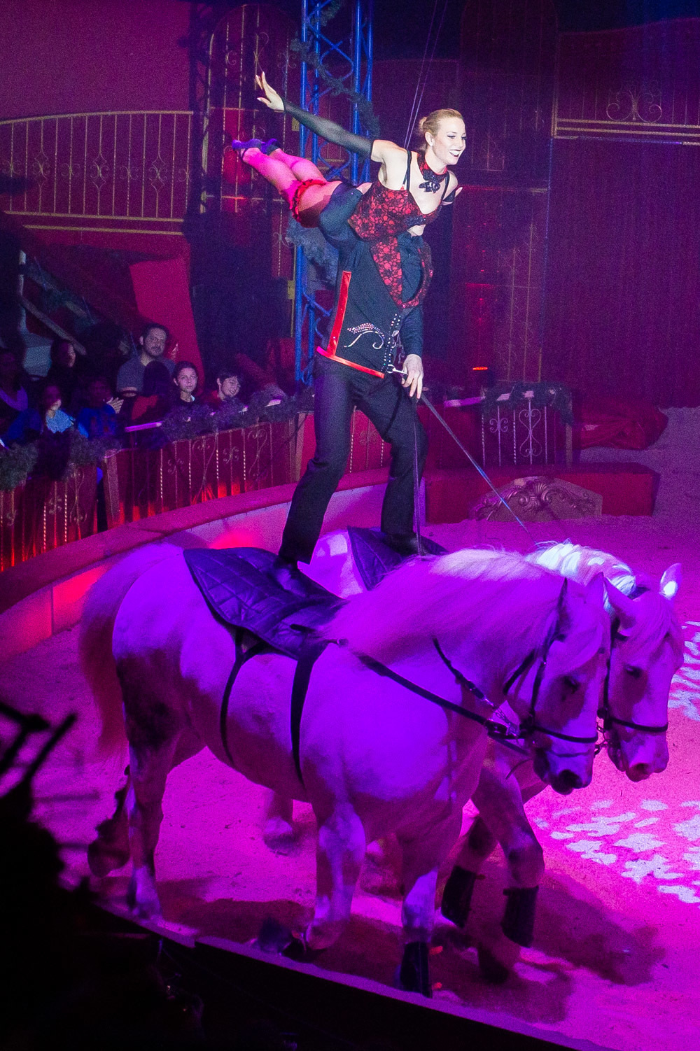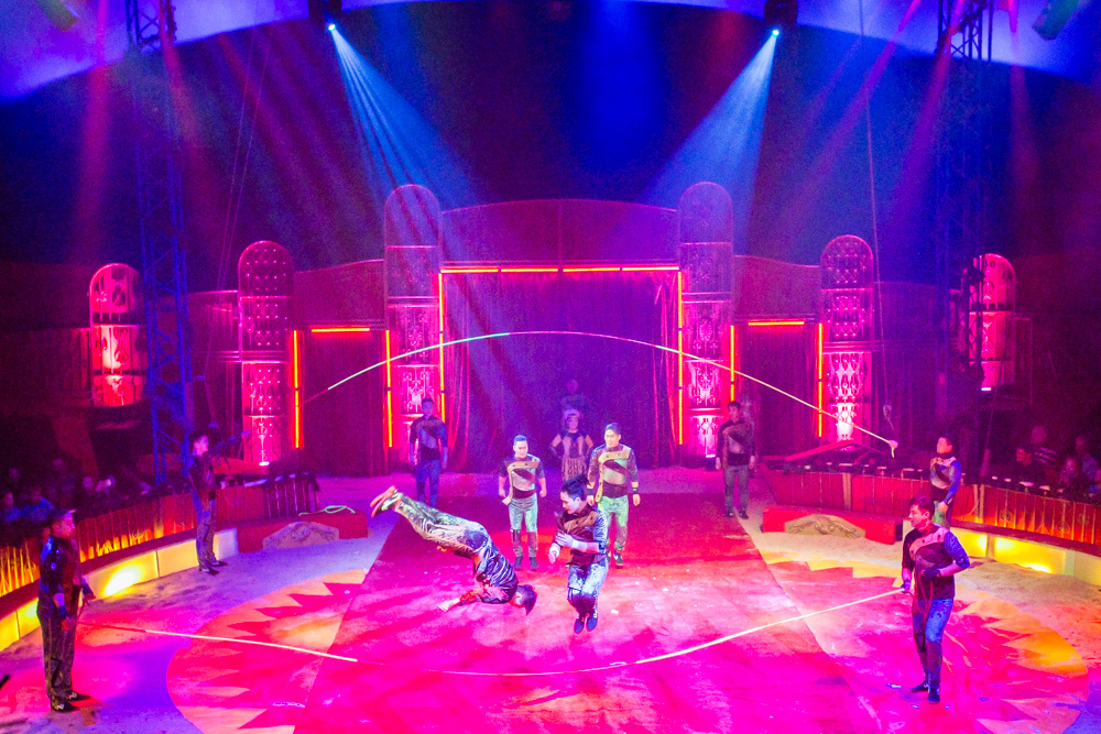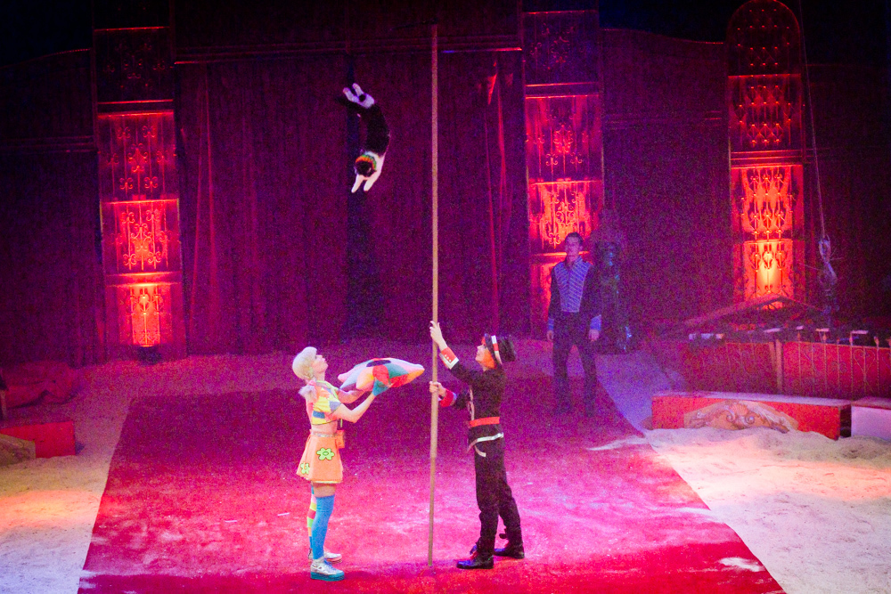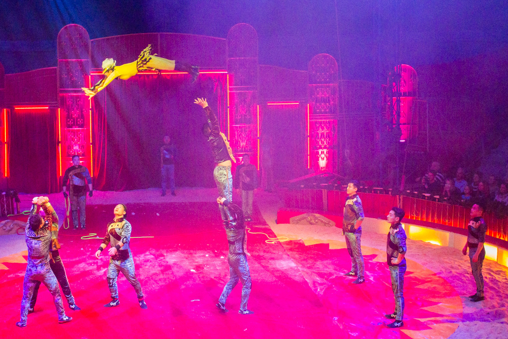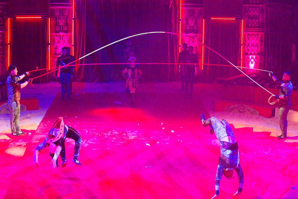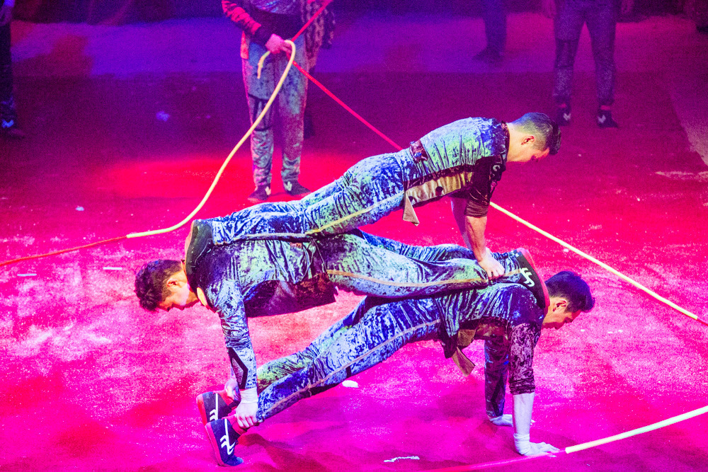 Schon wird es dunkel im Zelt, das aufgeregte Getuschel auf den Rängen verstummt, und die Vorstellung beginnt mit dem italienischen Clown, der das Publikum zum Wiener Walzer dirigiert, klatschen, Buh, Hah, und Bah rufen lässt. Nach den Nikoläusinnen, die in kurzen Mäntelchen mit viel Tüll und wenig Stoff „Jingle Bells“ in einer Rockversion aufführen, sind die ersten Artisten dran. Es ist eine Akrobatik-Truppe, die sich mit wildesten Verrenkungen, Salti und Rollen in alle möglichen und unmöglichen Richtungen durch erbarmungslos rotierende Springseile turnt, bevor sie waghalsige Menschenpyramiden baut – und am Ende sogar beides kombiniert, das Seilspringen und das Pyramidenbauen.