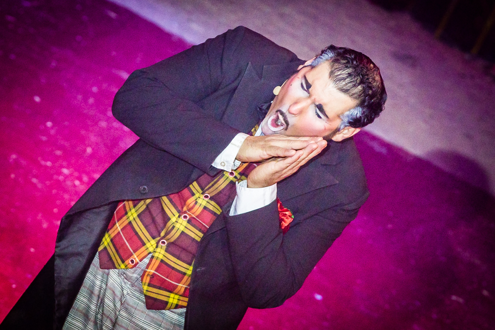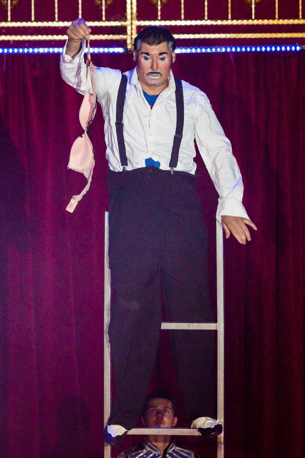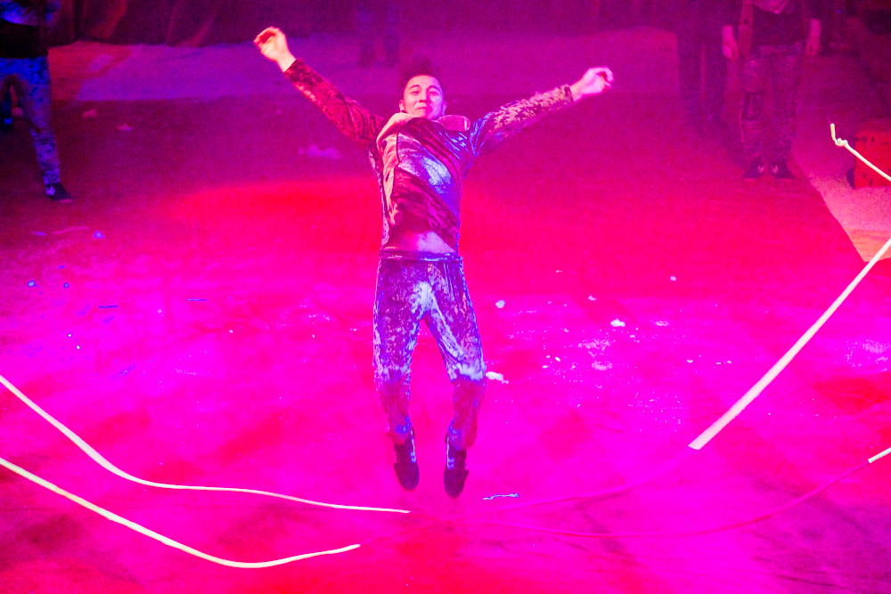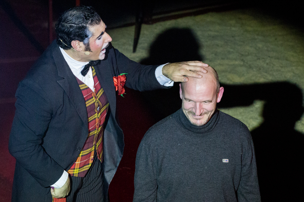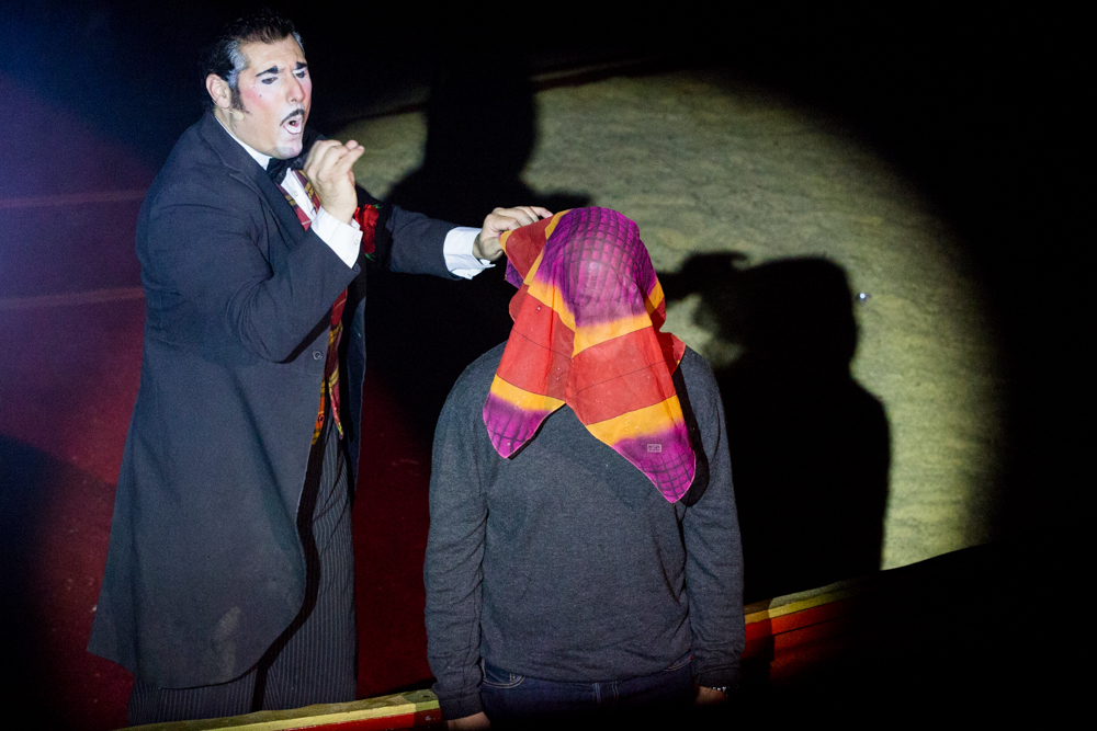 Schon wird es dunkel im Zelt, das aufgeregte Getuschel auf den Rängen verstummt, und die Vorstellung beginnt mit dem italienischen Clown, der das Publikum zum Wiener Walzer dirigiert, klatschen, Buh, Hah, und Bah rufen lässt. Nach den Nikoläusinnen, die in kurzen Mäntelchen mit viel Tüll und wenig Stoff „Jingle Bells“ in einer Rockversion aufführen, sind die ersten Artisten dran. Es ist eine Akrobatik-Truppe, die sich mit wildesten Verrenkungen, Salti und Rollen in alle möglichen und unmöglichen Richtungen durch erbarmungslos rotierende Springseile turnt, bevor sie waghalsige Menschenpyramiden baut – und am Ende sogar beides kombiniert, das Seilspringen und das Pyramidenbauen.