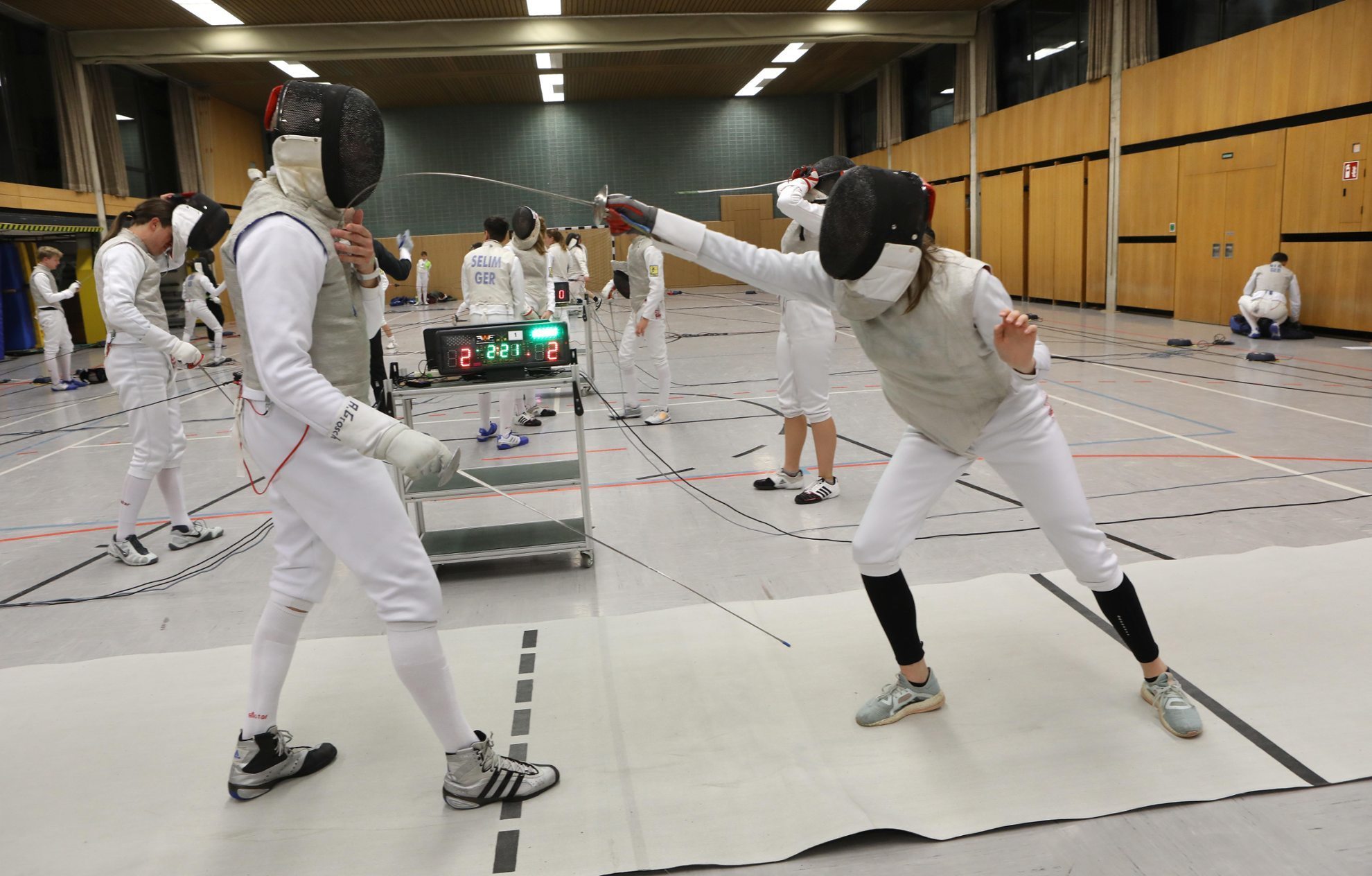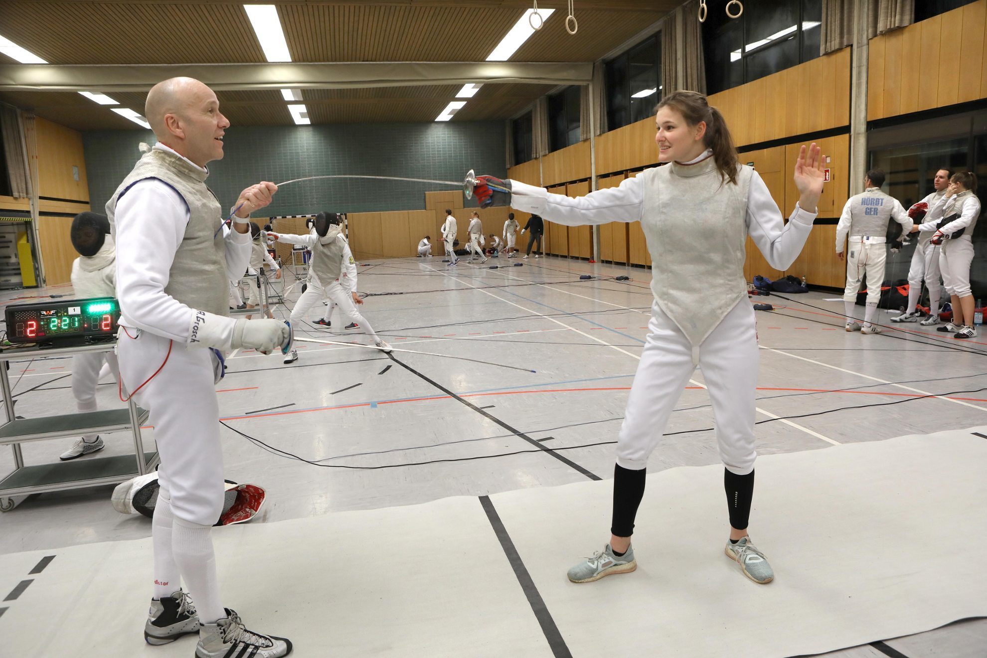 Schon beim Betreten der Halle sammle ich einige neue Eindrücke. Sportfechter in jedem Alter haben sich in der Halle aufgeteilt. Auf 14 Meter langen Bahnen kämpfen sie gegeneinander. Ob kämpfen das richtige Wort ist, frage ich mich. Zwar ist Fechten ein Kampfsport, er kommt mir aber viel graziler vor, als andere Kampfsportarten. Arnd Gosch, mein Trainer für heute, fragt mich: „Bist du bereit?“ Ich bin begeistert und gespannt – also auf ins Gefecht.