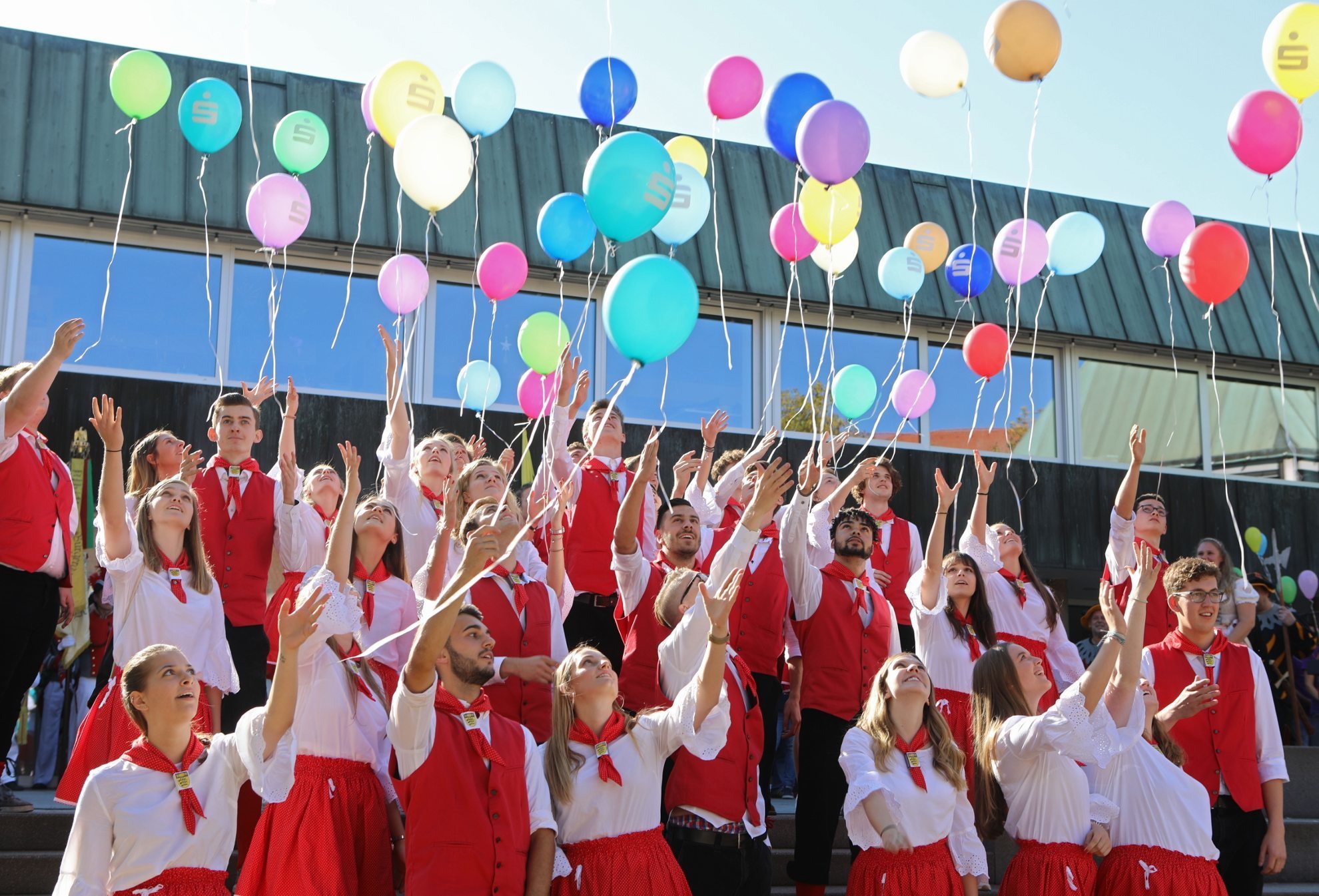 Die nächsten Rätschensalven brechen los. Die grünen Kirbejugendlichen – der letzte Jahrgang mit der Zahl „19“ im Geburtsjahr – präsentieren sich mit einer Tanzeinlage zu Nenas „99 Luftballons“. Am Ende steigt eine bunte Luftballontraube in den Himmel. Dann ziehen weit mehr als 99 Trauben alle Blicke auf sich: Das Zeremoniell des Traubenaufhängens fordert besonders zwei Jungs, die das schwere Traubengebilde mit vereinter Schulterkraft zwei Leitern hinaufstemmen dürfen.