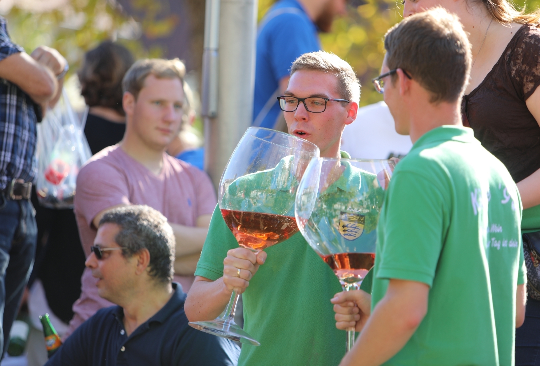 Gläser mit Beutelsbacher Wein gehen in der Menge hoch, als, begleitet von den „Oldies“, der grüne Kirbejahrgang 1999 einzieht. In den Farben Rot, Weiß und Schwarz sorgen Röcke, Blusen und Hosen für eine farbige Kulisse. Dazu lacht die Sonne.