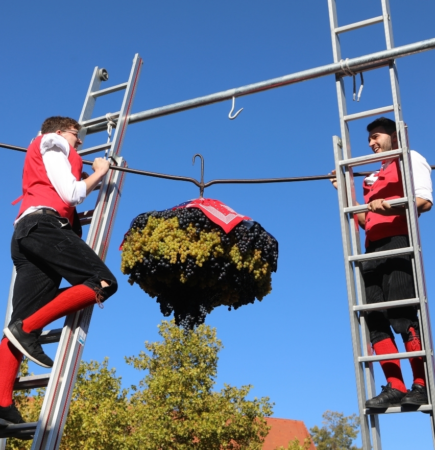 Passend zum Jahrgang soll er 99 Kilogramm schwer sein, verrät der OB. Zusammen mit der Stange verteilen sich 129 Kilogramm auf den zwei Schultern, und alles jubelt und rätscht, als der prächtige Trauben unter blauem Himmel vor dem Rathaus am Haken hängt.