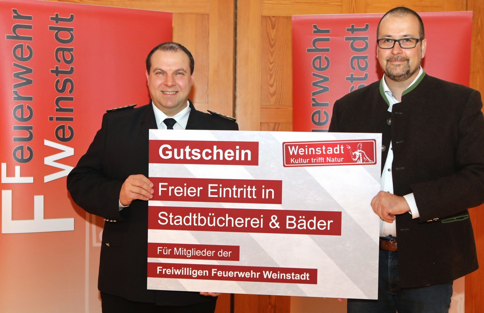 So war es kein Wunder, dass in der Jahnhalle die Feuerwehr und ihre Angehörigen im Mittelpunkt standen. Als Zeichen der Wertschätzung und Anerkennung brachte Oberbürgermeister Michael Scharmann die Ankündigung und einen symbolischen Gutschein mit, dass die 237 Aktiven der Einsatzabteilungen und ihre Angehörigen künftig kostenlos die Weinstädter Bäder und die Bücherei benutzen können. Dabei handle es sich um ein kleines Dankeschön auch an die Familien und Partner, die nur allzu oft und spontan auf die Feuerwehrleute verzichten müssen, erklärte Scharmann. „Auf diesem Wege sollen die Familien wieder etwas Familienzeit zurückbekommen. Wir dürfen nicht vergessen, dass die Feuerwehrleute in Weinstadt eine Pflichtaufgabe der Stadtverwaltung wahrnehmen.“