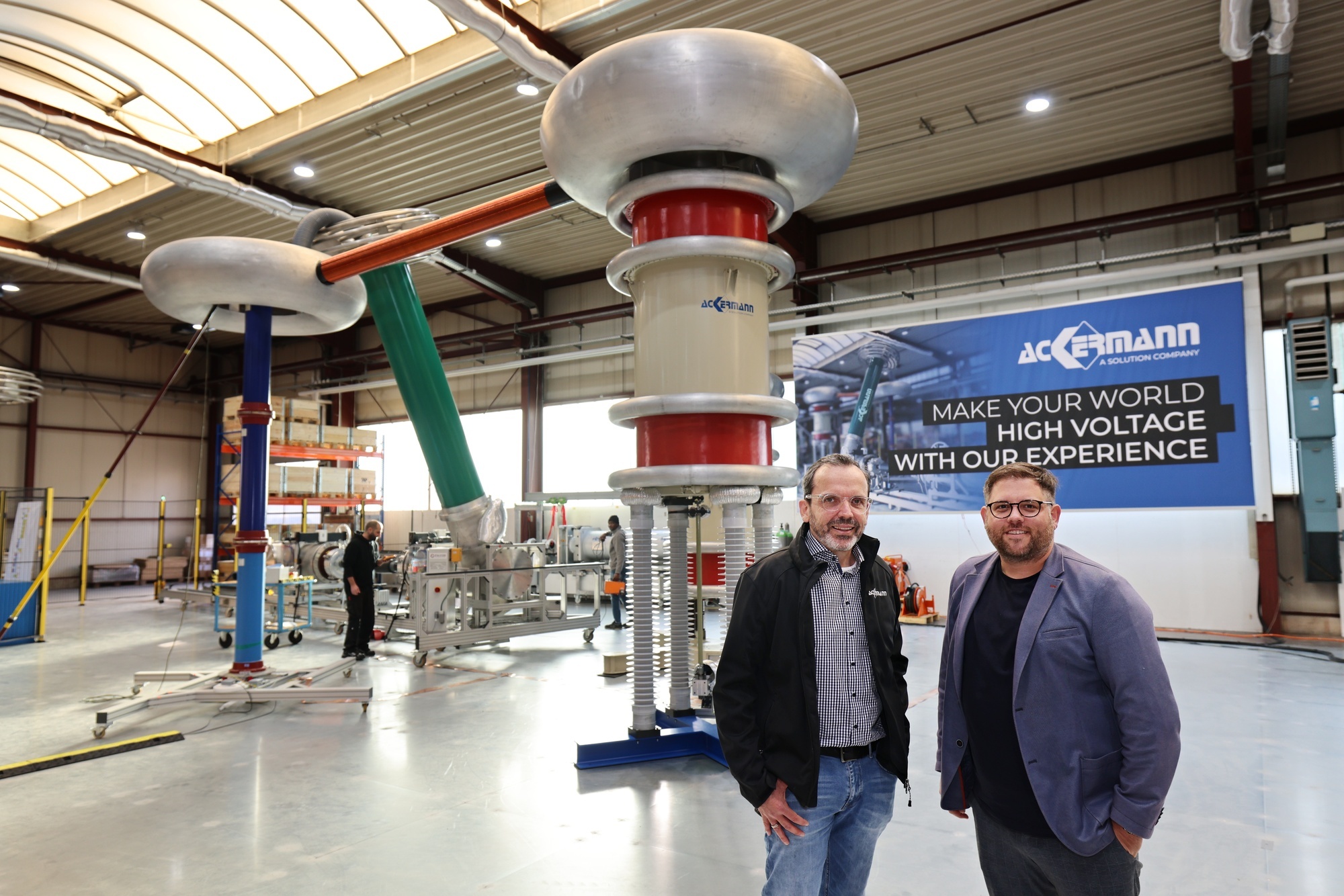 Weinstadt. Der Bereich Hochspannung boomt - und davon profitiert auch die Firma Ackermann aus Weinstadt -Endersbach. Im Vergleich zu 2023 hat das Unternehmen seinen Umsatz verdoppelt. Für weiteres Wachstum soll nun ein Prüffeld sorgen, das Spannungen bis zu 600.000 Volt schafft. Die 6,50 Meter hohe Anlage mit ihren beiden in Reihe geschalteten und jeweils vier Tonnen schweren Transformatoren befindet sich seit Oktober 2024 auf dem Firmensitz in der Werkstraße 29. Sie nimmt in der Halle mit