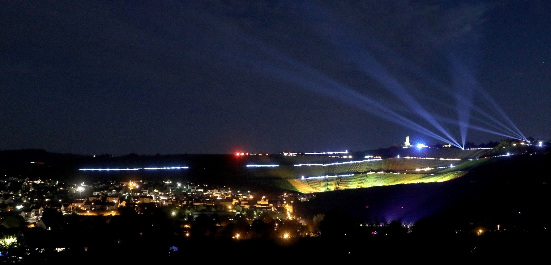 Der 14. Leuchtende Weinberg findet in Weinstadt am Samstag, 29. Juli 2023, von 18 bis 24 Uhr statt – unter anderem mit Livemusik, „Walk Acts“, Segway-Touren, LED-Shows, Weinen, Speisen und einem großen Abschluss-Feuerwerk. Unter dem Motto „Je dunkler, desto heller“ sollen die Gäste die Ausblicke ins Remstal genießen. Mit Einbruch der Dunkelheit entfalten die vielfältigen Lichtinstallationen ihren Zauber. Alles endet gegen Mitternacht mit dem Feuerwerk des mehrfachen Pyro-Weltmeisters Joachim
