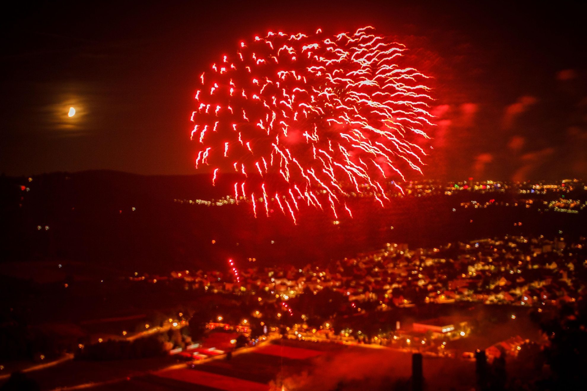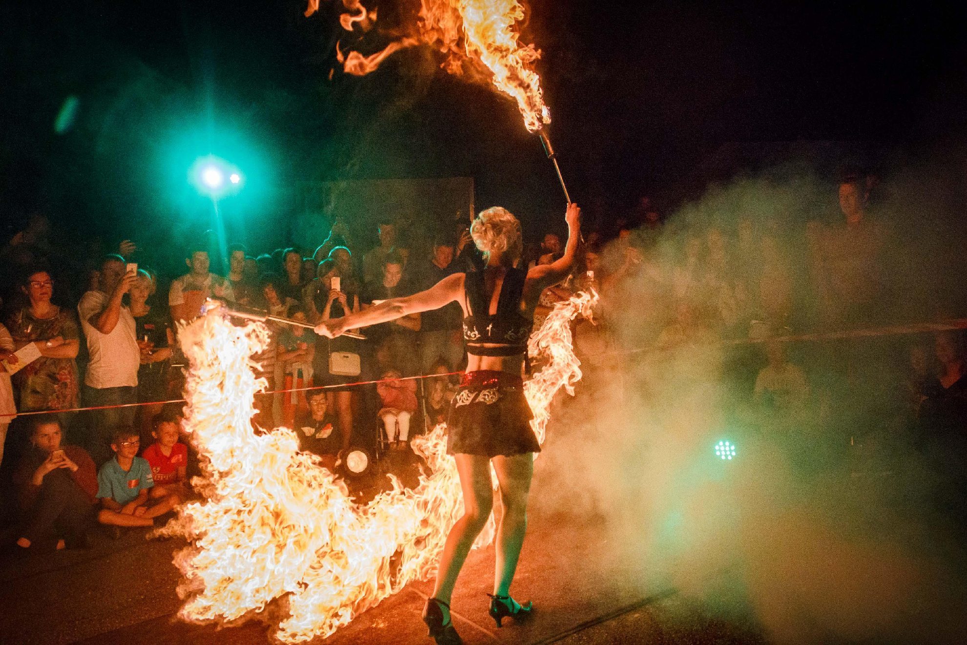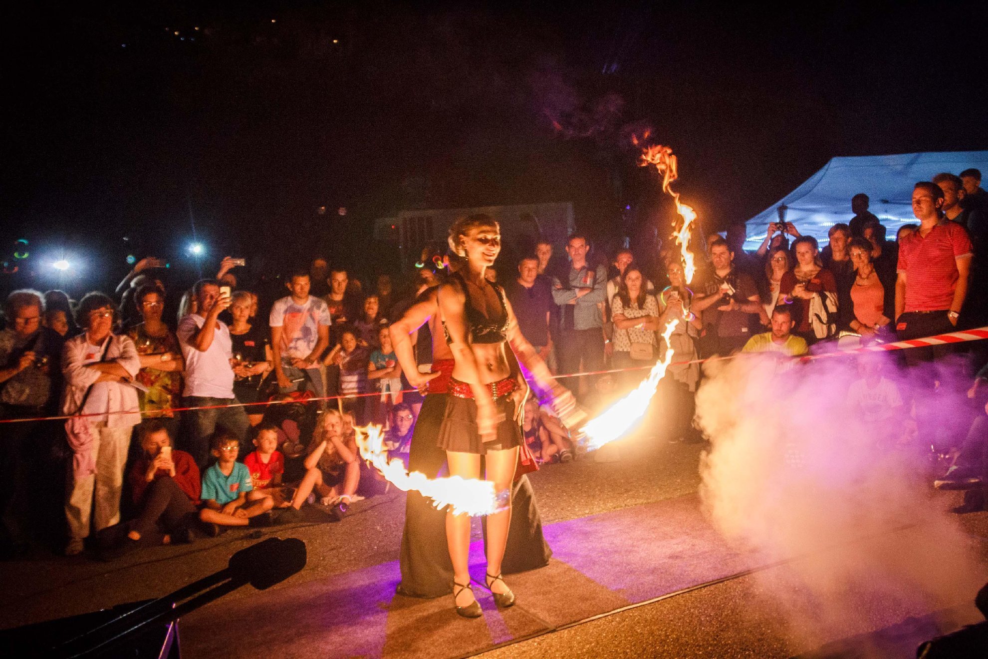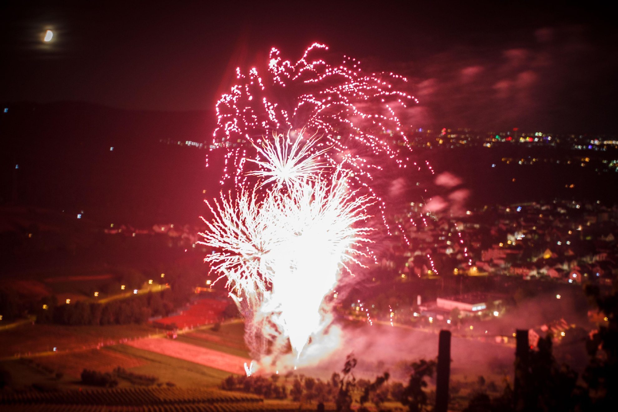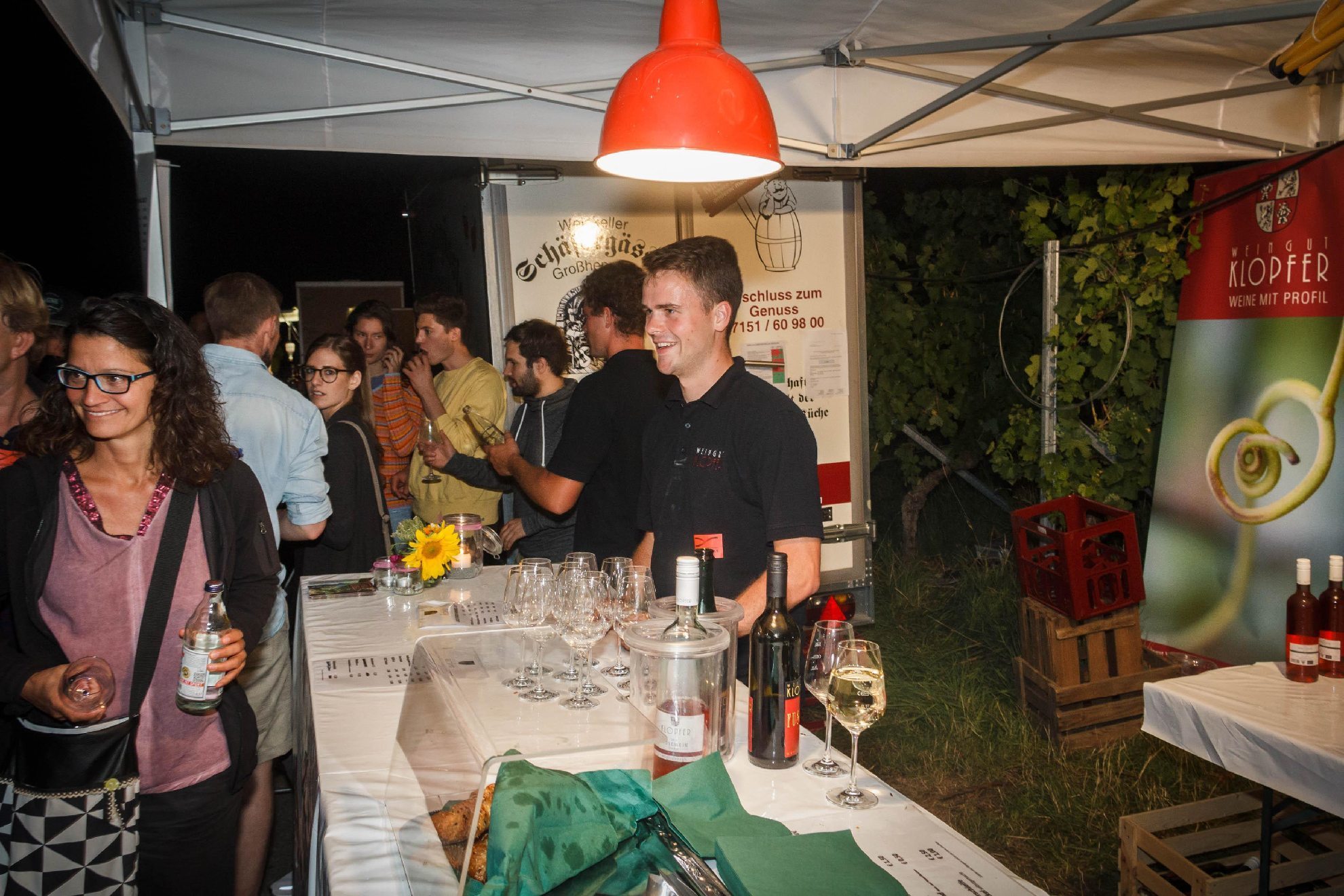 Ganz klar: Einen Anblick wie den, der einem beim Aussichtspunkt des Jazzclubs Armer Konrad oben in den Weinbergen geboten wird, findest du in ganz Deutschland nur ganz selten. Die Bühne mit Blick ins Tal, über Reben, Stäffele und die Lichter Weinstadts, und dann, zum krönenden Finale, das große Feuerwerk des „Pyroweltmeisters“ Joachim Berner, eine gekonnte Open-Air-Collage aus Licht, Blitz, Funken und Farben, eher schön als laut, eher Kunst als Knall. So ähnlich wie ein weiterer Programmpunkt beim „Leuchtenden Weinberg“, die Feuerartistik der Performance-Gruppe „Dance with Fire“ beim Stand „Fruchtkörble“ weiter unten, wo schon den ganzen Abend über die Funken übersprangen.