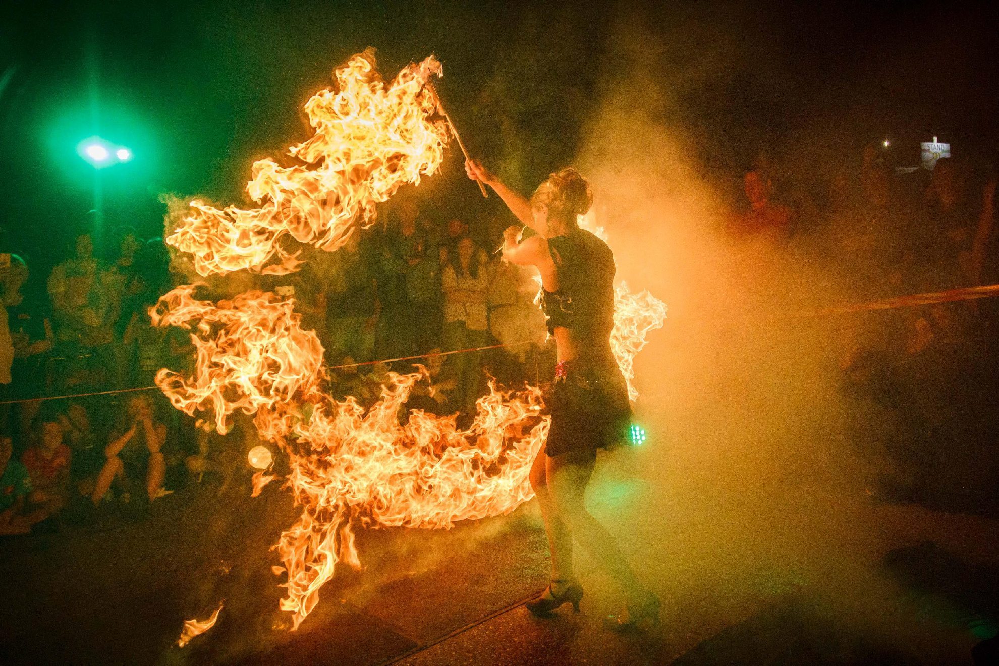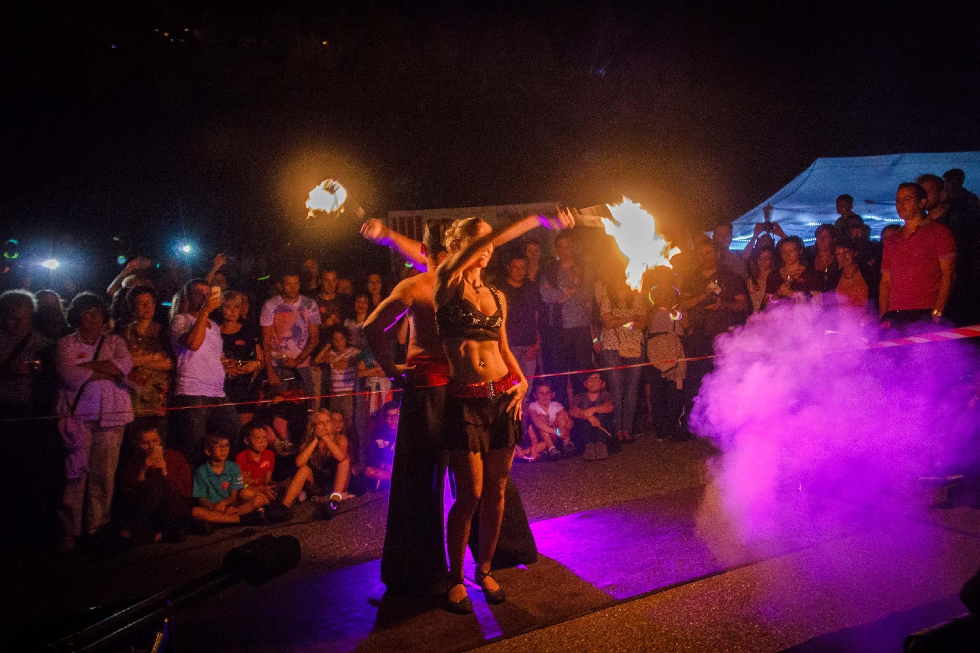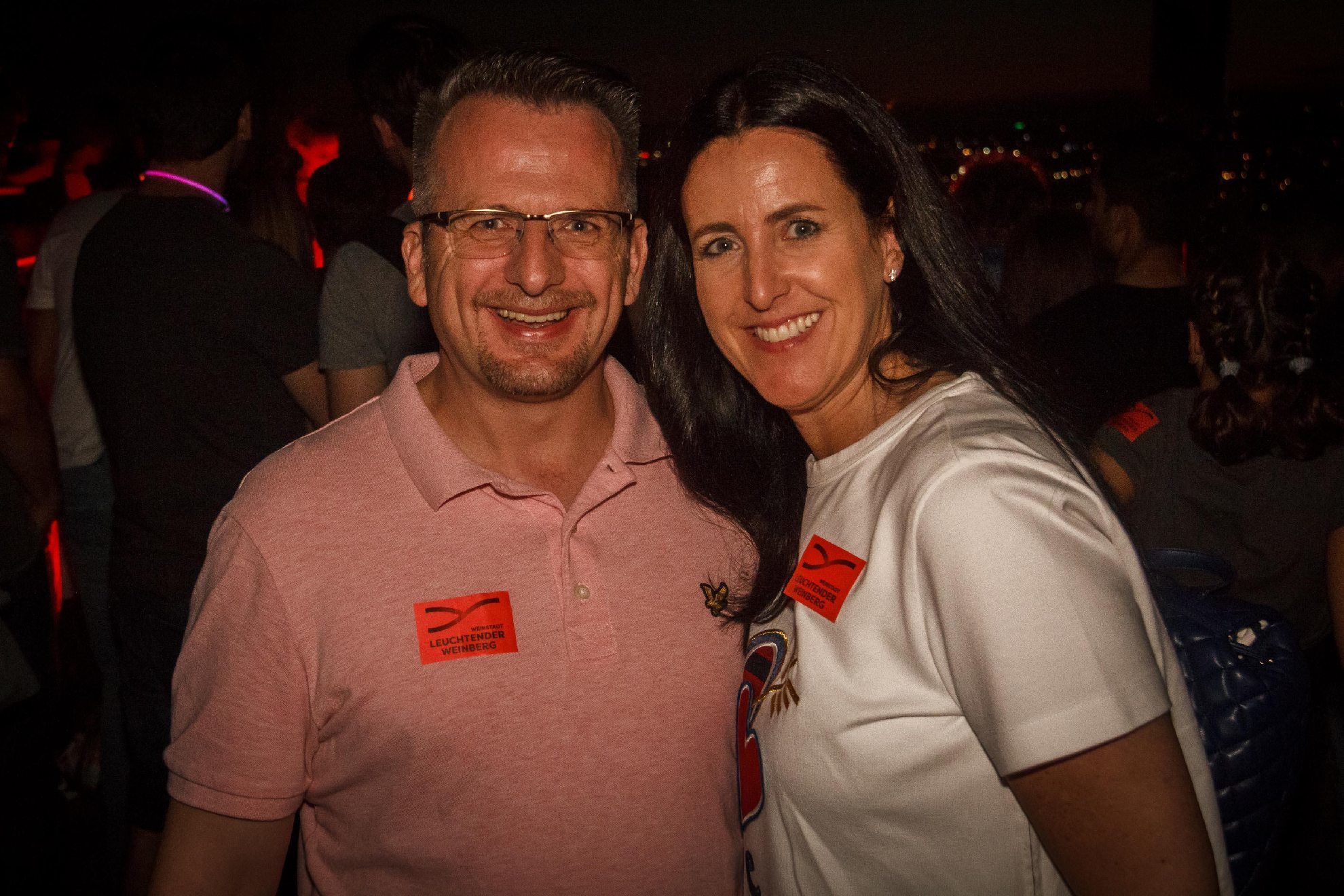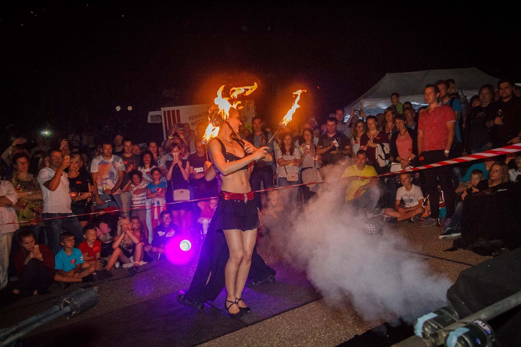 Ganz klar: Einen Anblick wie den, der einem beim Aussichtspunkt des Jazzclubs Armer Konrad oben in den Weinbergen geboten wird, findest du in ganz Deutschland nur ganz selten. Die Bühne mit Blick ins Tal, über Reben, Stäffele und die Lichter Weinstadts, und dann, zum krönenden Finale, das große Feuerwerk des „Pyroweltmeisters“ Joachim Berner, eine gekonnte Open-Air-Collage aus Licht, Blitz, Funken und Farben, eher schön als laut, eher Kunst als Knall. So ähnlich wie ein weiterer Programmpunkt beim „Leuchtenden Weinberg“, die Feuerartistik der Performance-Gruppe „Dance with Fire“ beim Stand „Fruchtkörble“ weiter unten, wo schon den ganzen Abend über die Funken übersprangen.