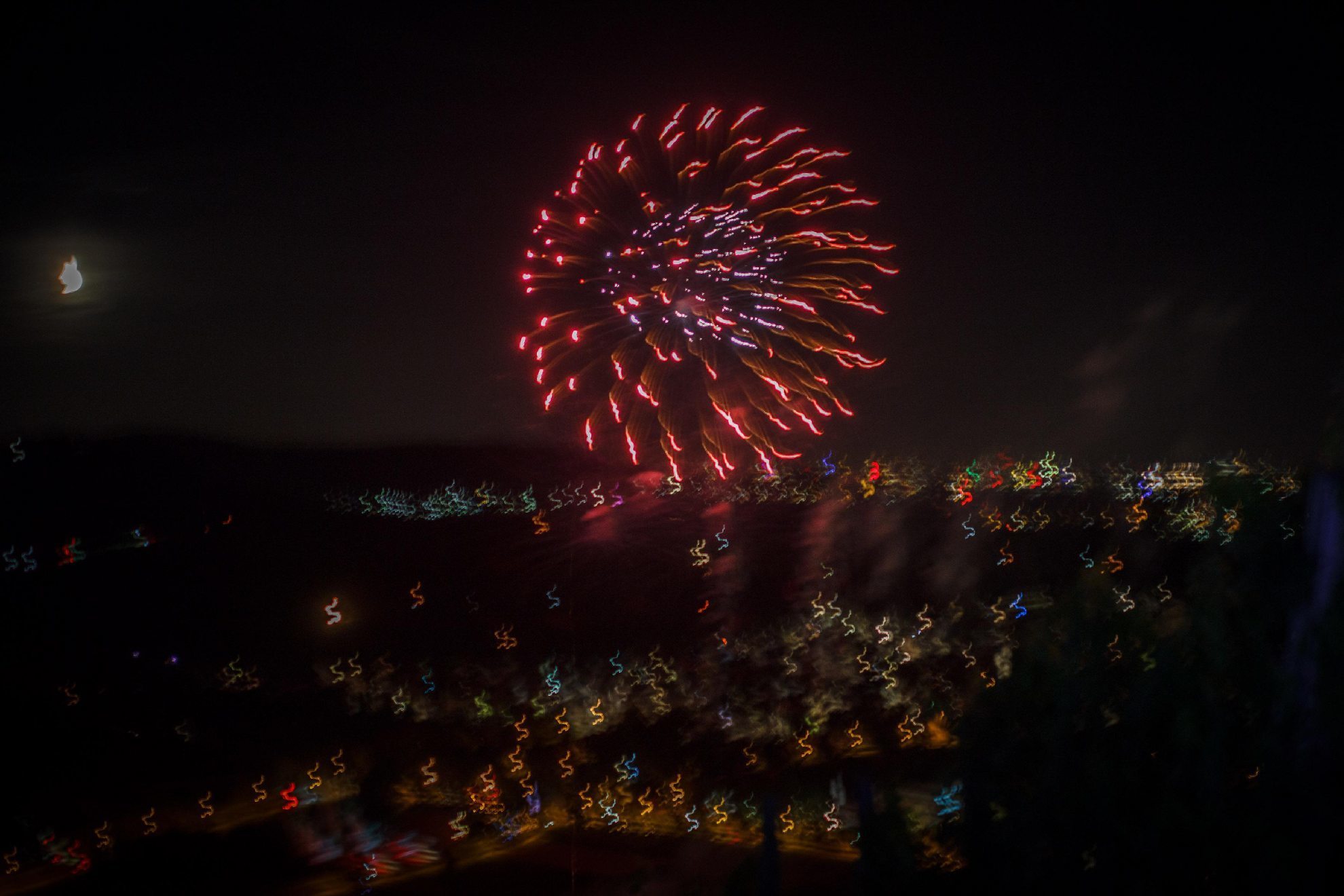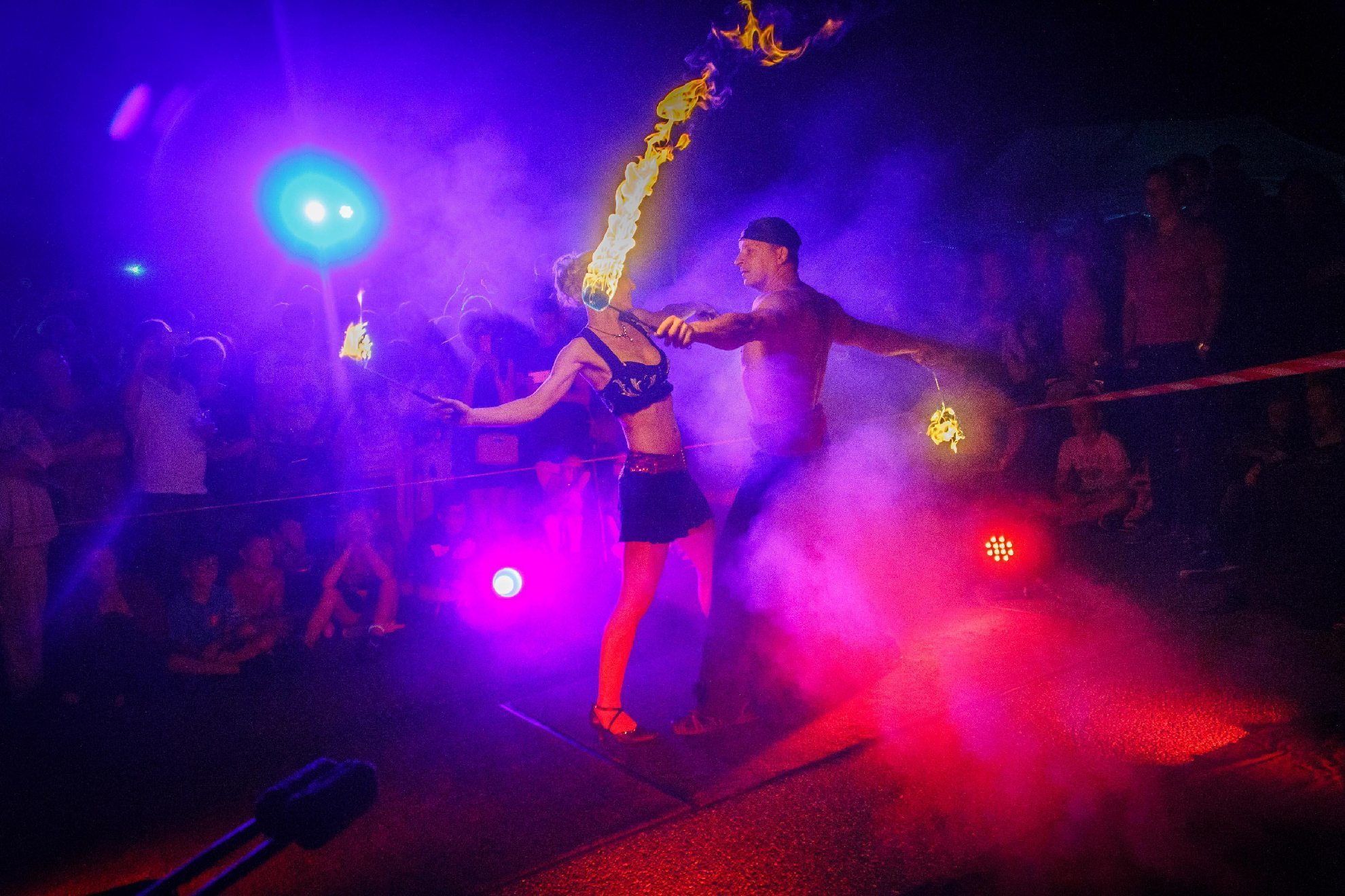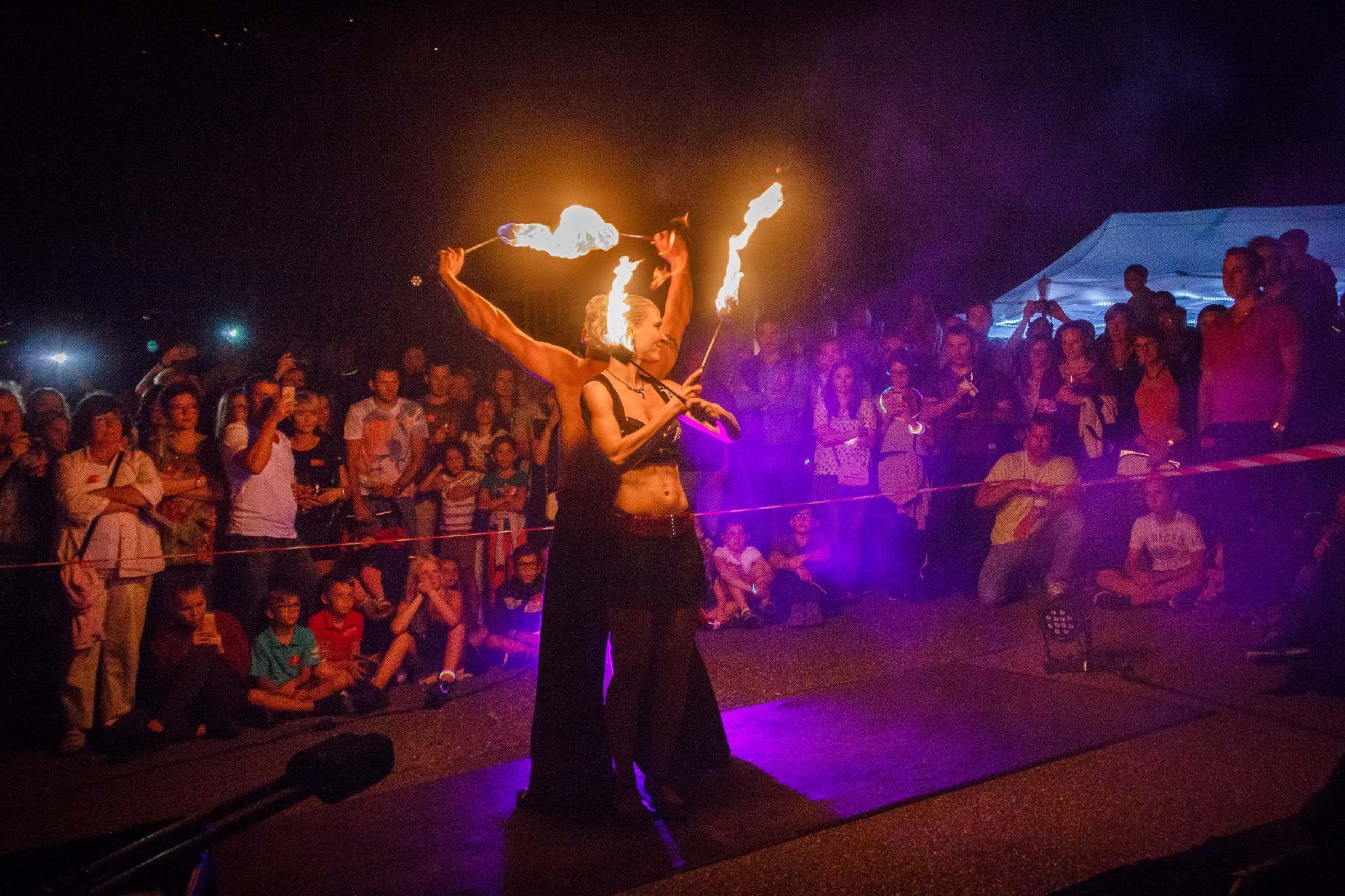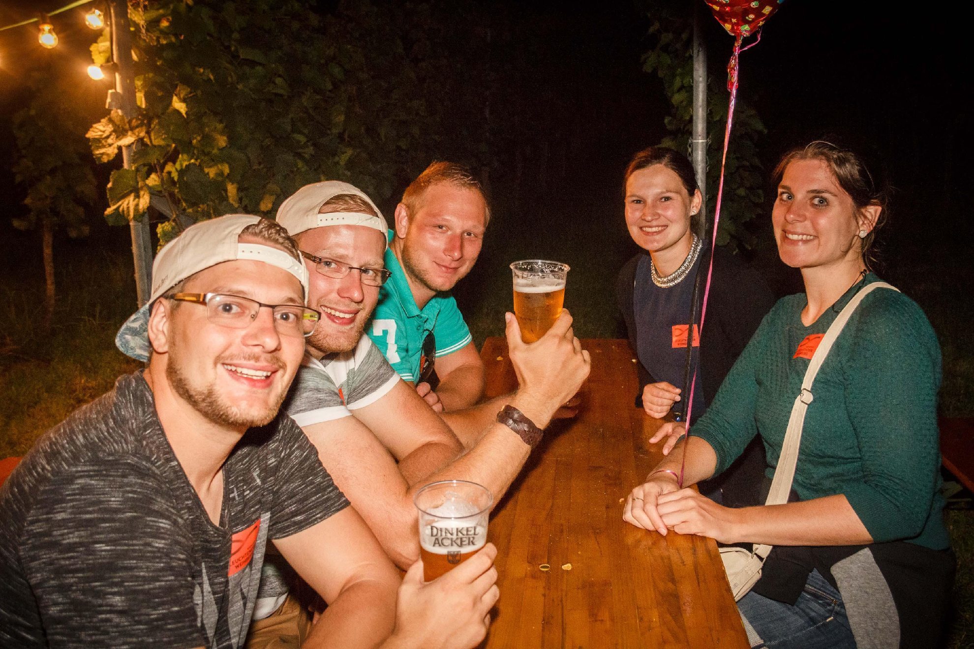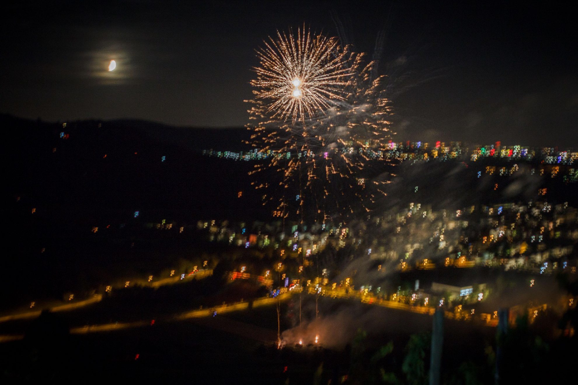 Ganz klar: Einen Anblick wie den, der einem beim Aussichtspunkt des Jazzclubs Armer Konrad oben in den Weinbergen geboten wird, findest du in ganz Deutschland nur ganz selten. Die Bühne mit Blick ins Tal, über Reben, Stäffele und die Lichter Weinstadts, und dann, zum krönenden Finale, das große Feuerwerk des „Pyroweltmeisters“ Joachim Berner, eine gekonnte Open-Air-Collage aus Licht, Blitz, Funken und Farben, eher schön als laut, eher Kunst als Knall. So ähnlich wie ein weiterer Programmpunkt beim „Leuchtenden Weinberg“, die Feuerartistik der Performance-Gruppe „Dance with Fire“ beim Stand „Fruchtkörble“ weiter unten, wo schon den ganzen Abend über die Funken übersprangen.