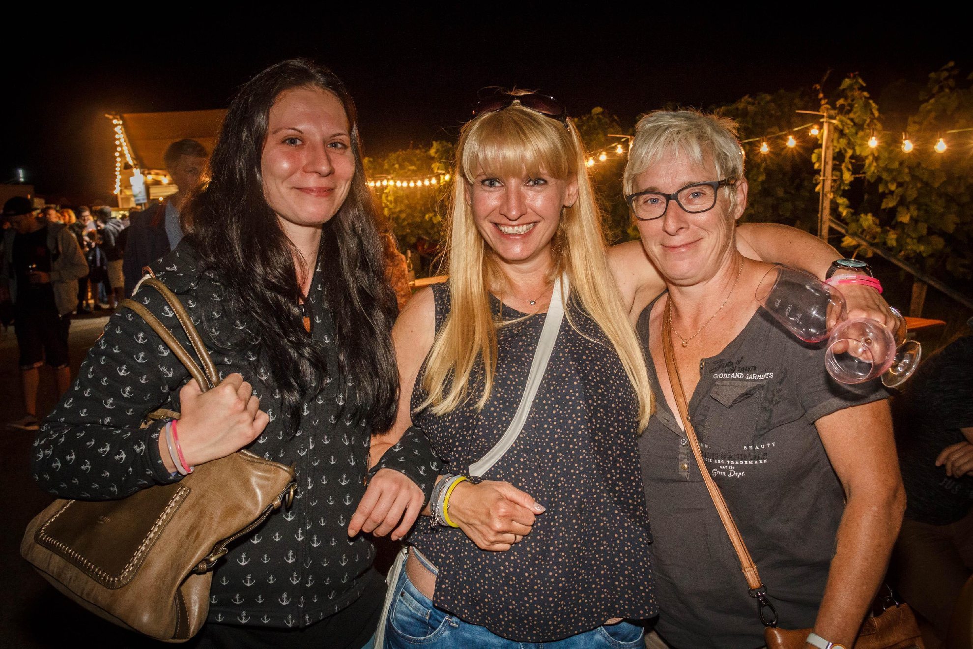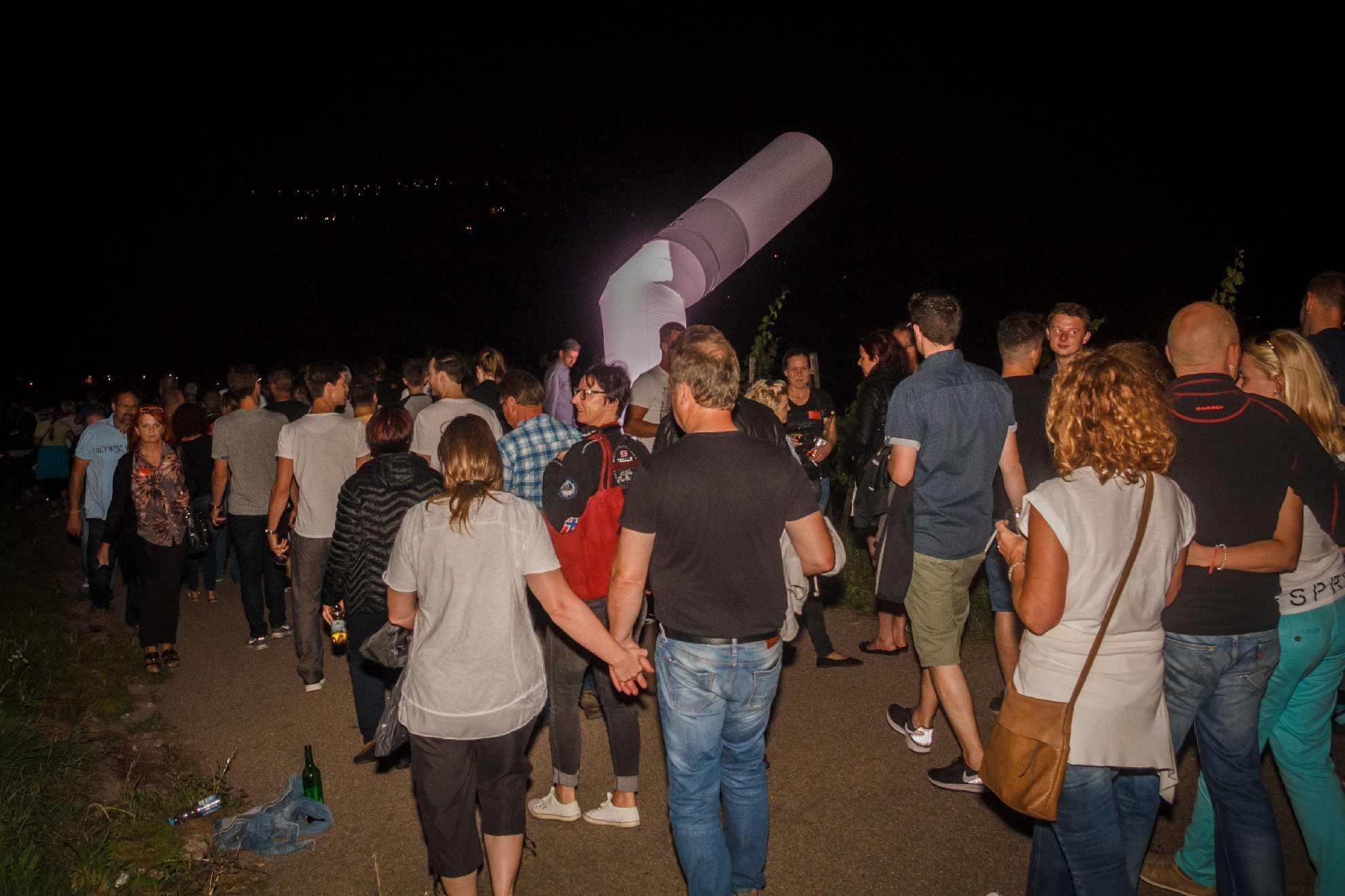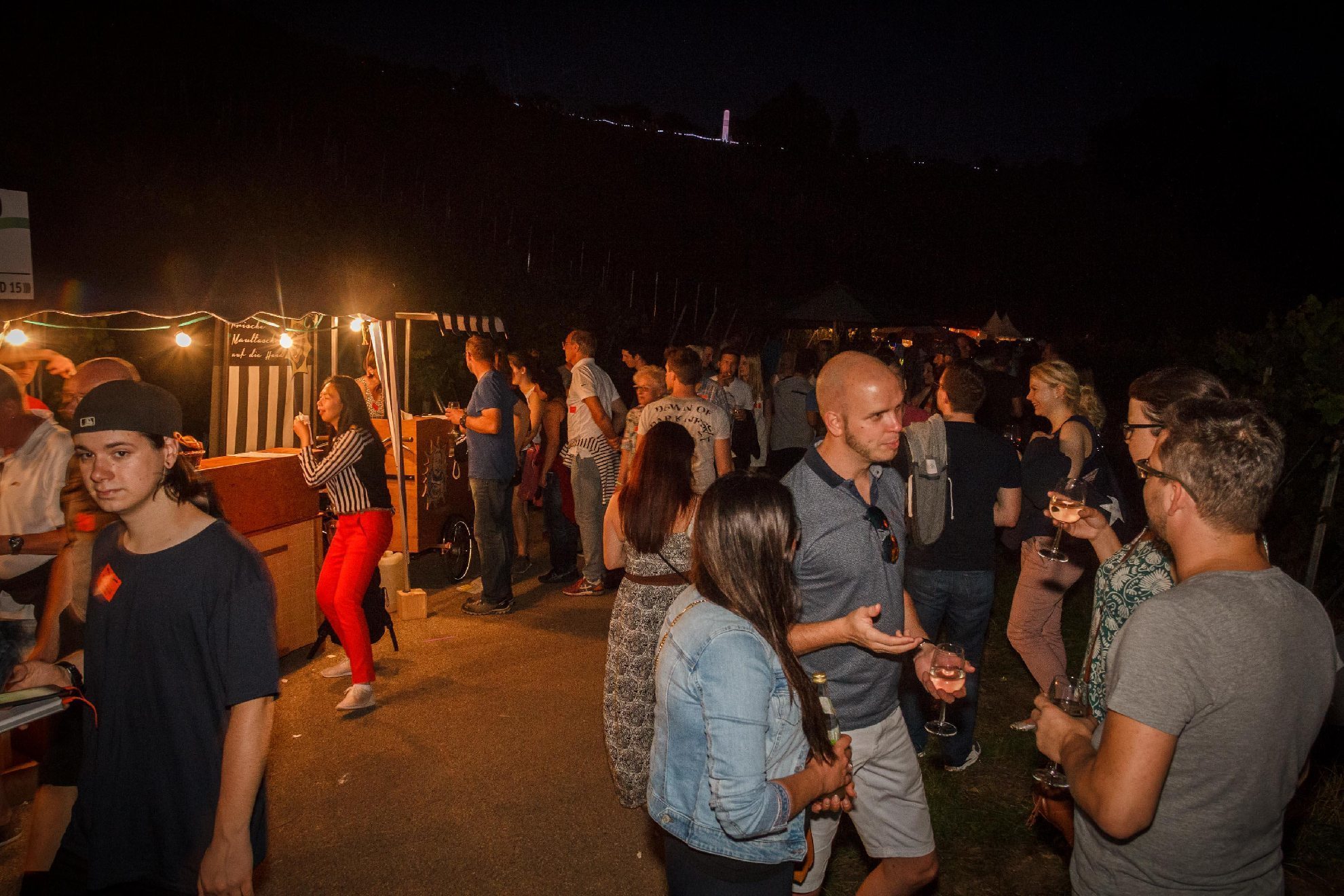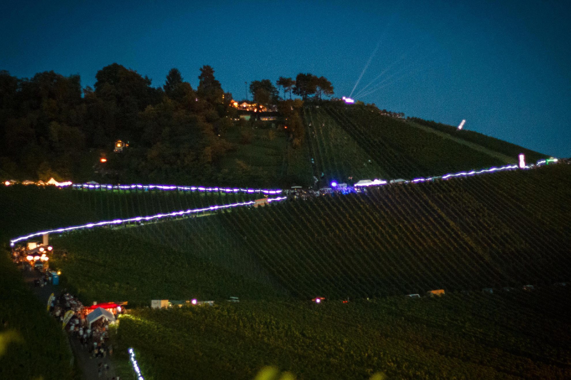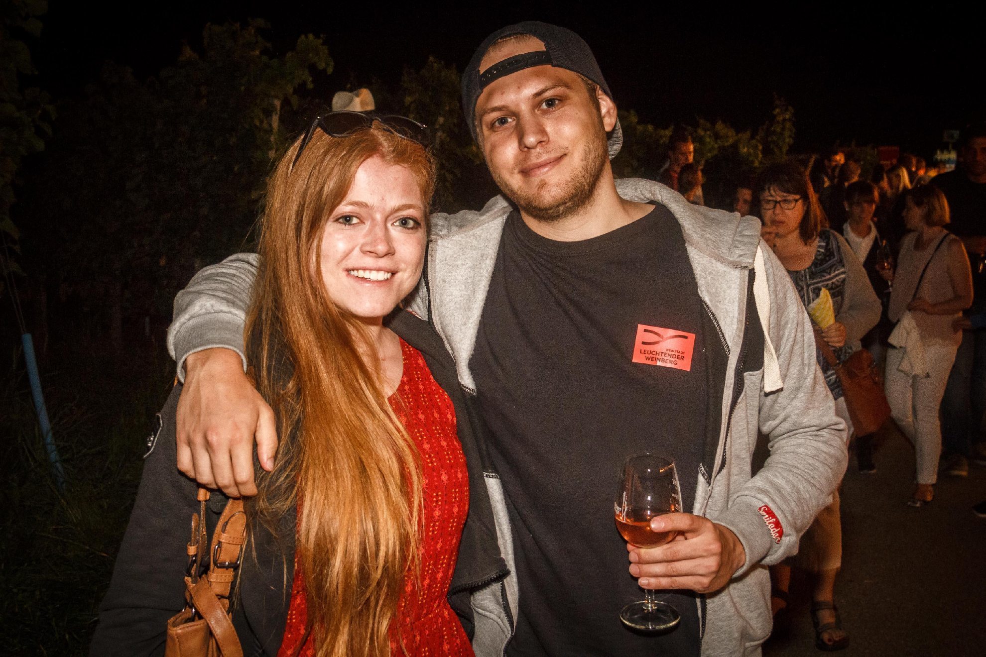 Am Eingang zur JAK-Station, wo vom Gedrängel vor der Bühne noch nichts zu ahnen ist, sitzt die junge Celine Kögel mit einem Partner ganz allein beim Kartenverkauf. Über Funk haben die zwei Helfer gerade erfahren, dass gut 8000 Leute unterwegs sind, mit Option auf mehr. Der „Leuchtende Weinberg“ scheint also wieder ein Magnet zu sein, ein Riesenevent, ein Erfolg für Natur und Kultur.