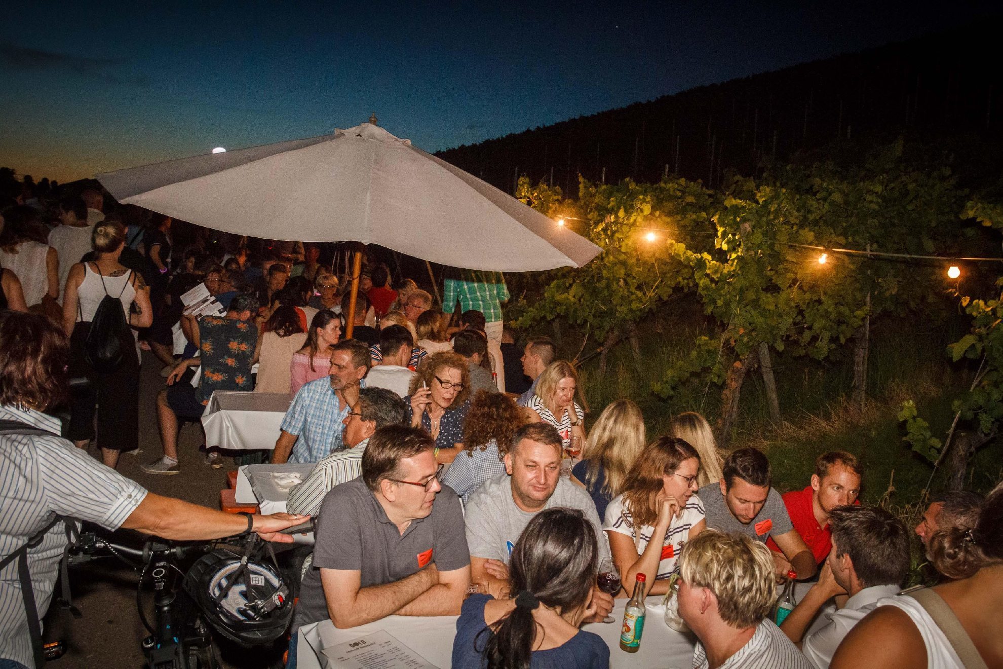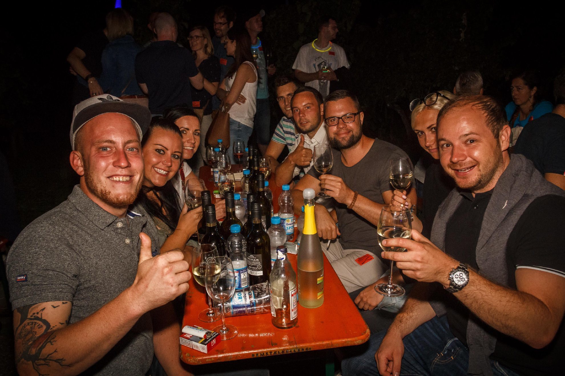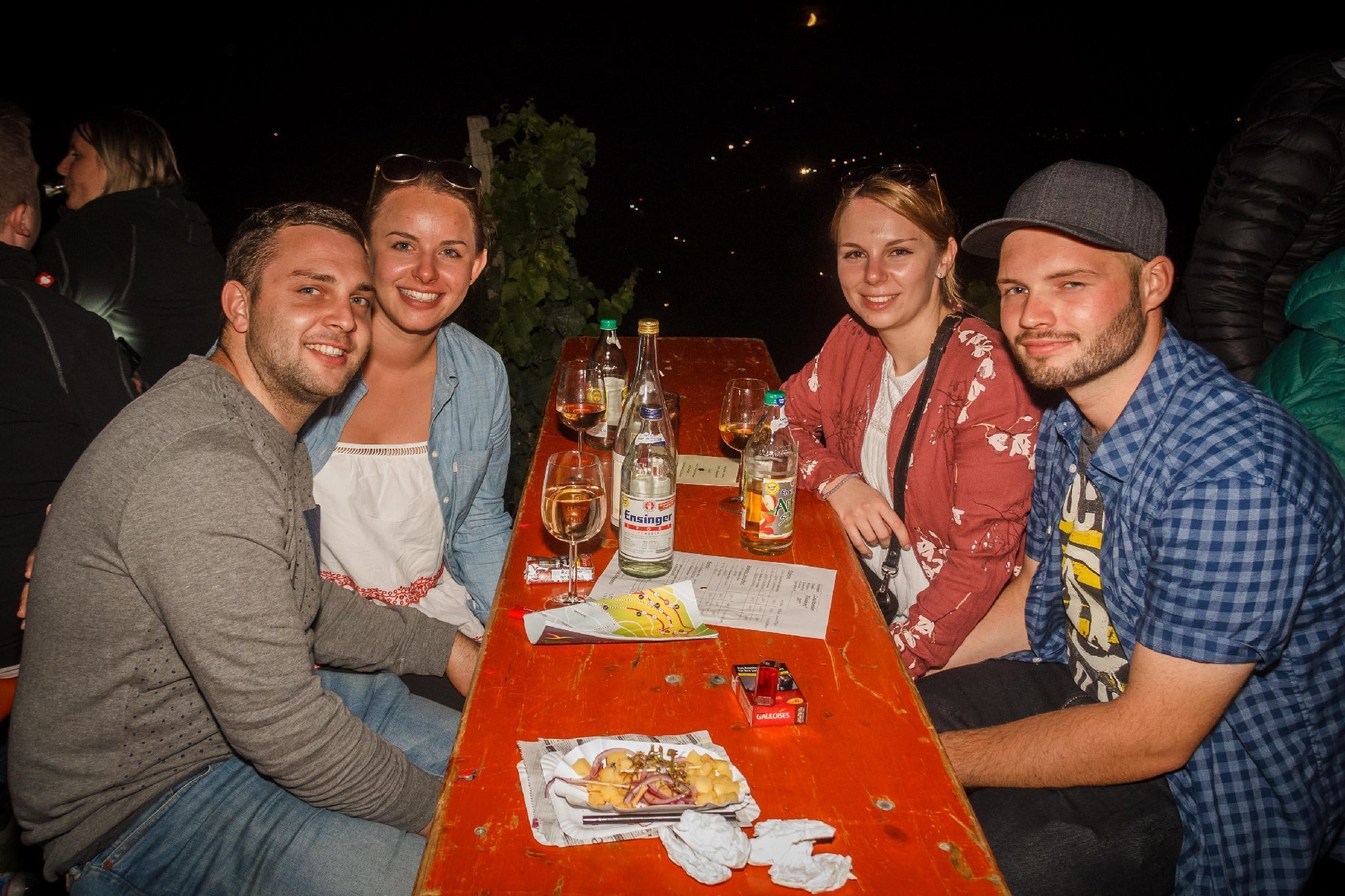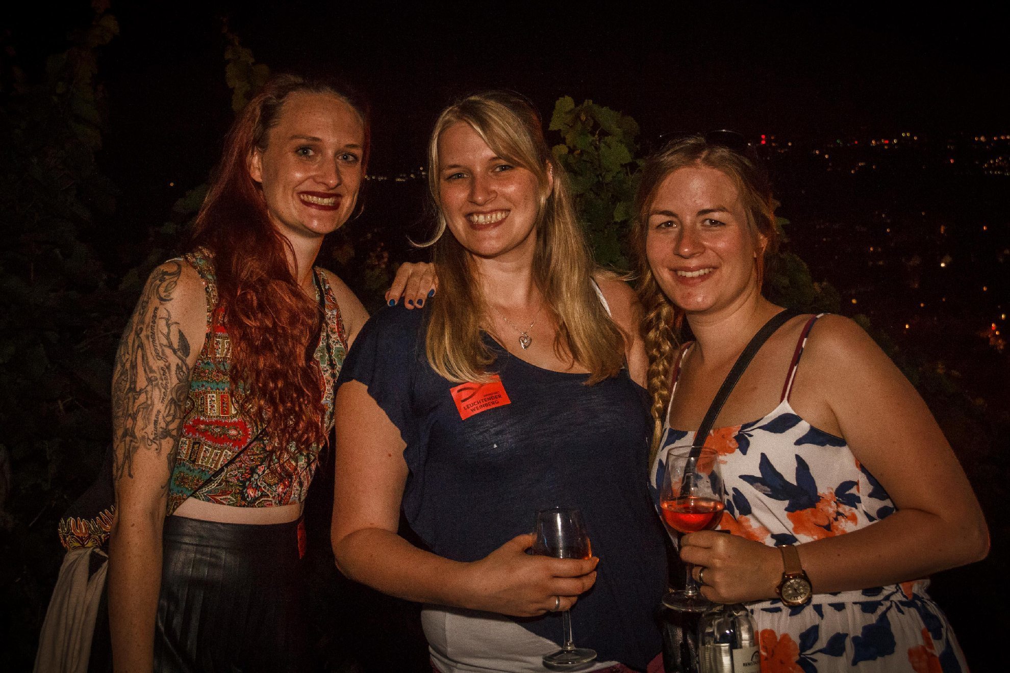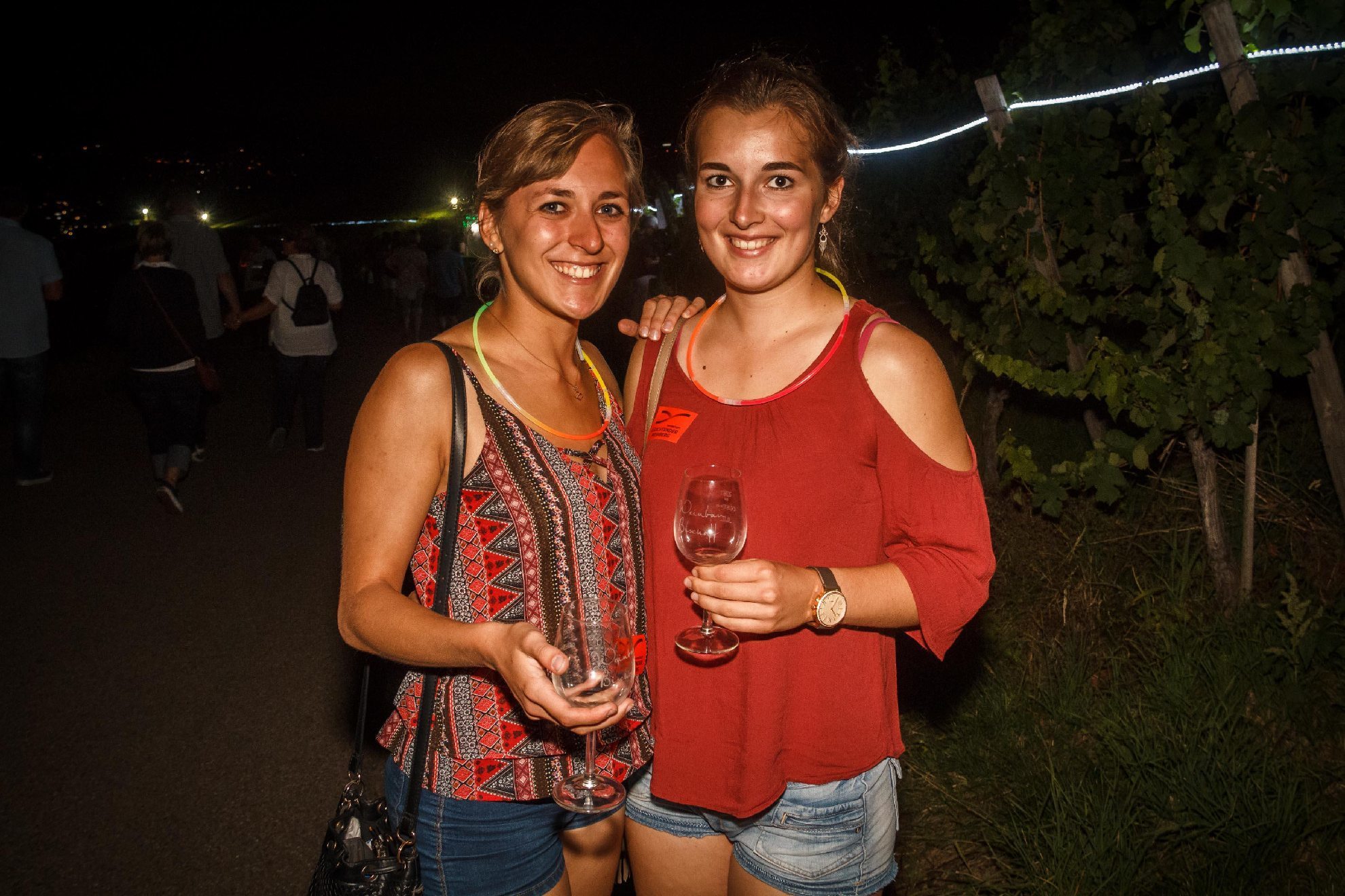 Am Eingang zur JAK-Station, wo vom Gedrängel vor der Bühne noch nichts zu ahnen ist, sitzt die junge Celine Kögel mit einem Partner ganz allein beim Kartenverkauf. Über Funk haben die zwei Helfer gerade erfahren, dass gut 8000 Leute unterwegs sind, mit Option auf mehr. Der „Leuchtende Weinberg“ scheint also wieder ein Magnet zu sein, ein Riesenevent, ein Erfolg für Natur und Kultur.