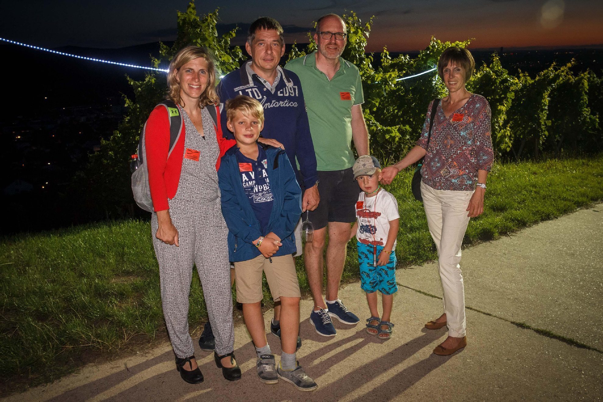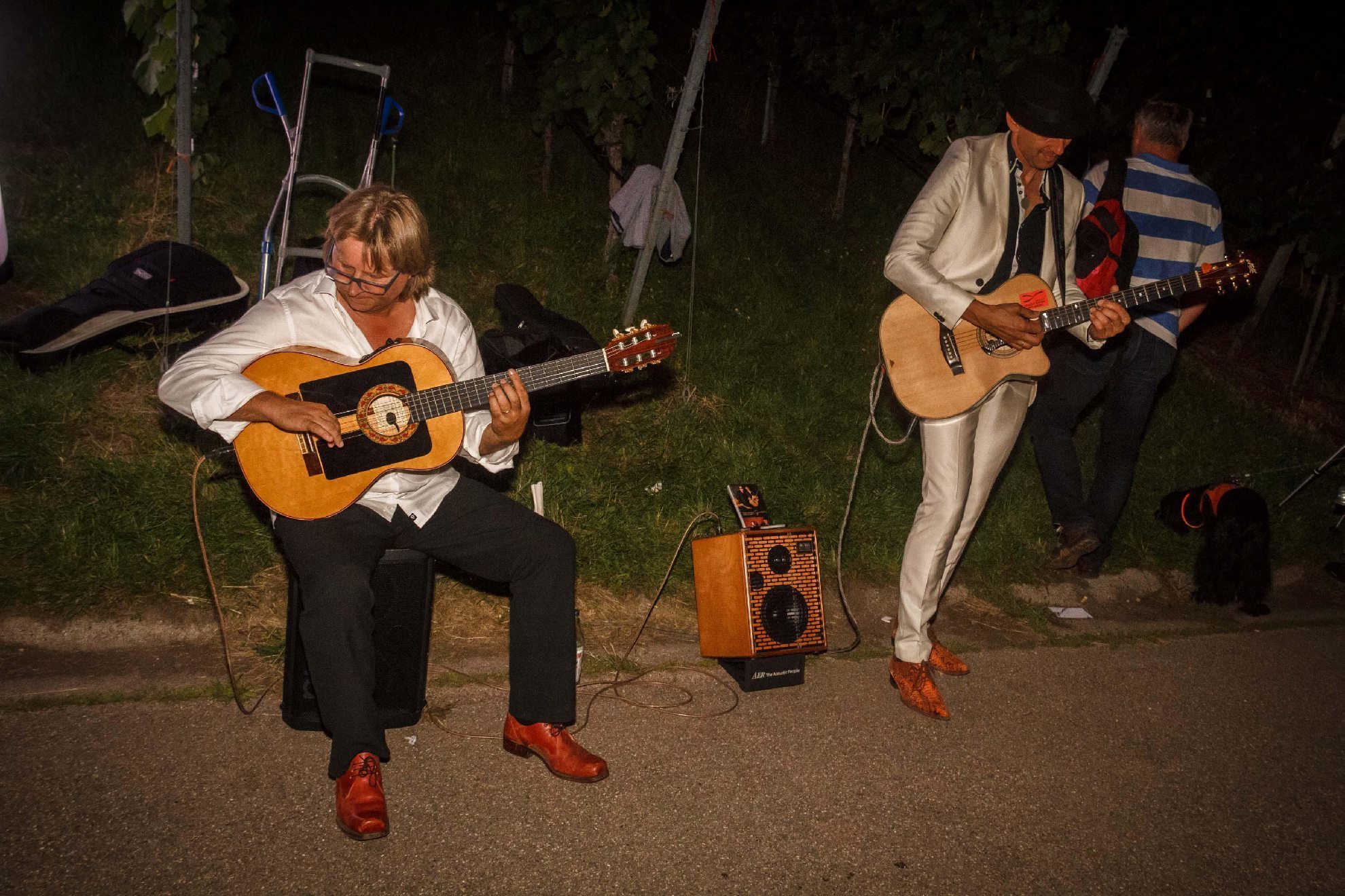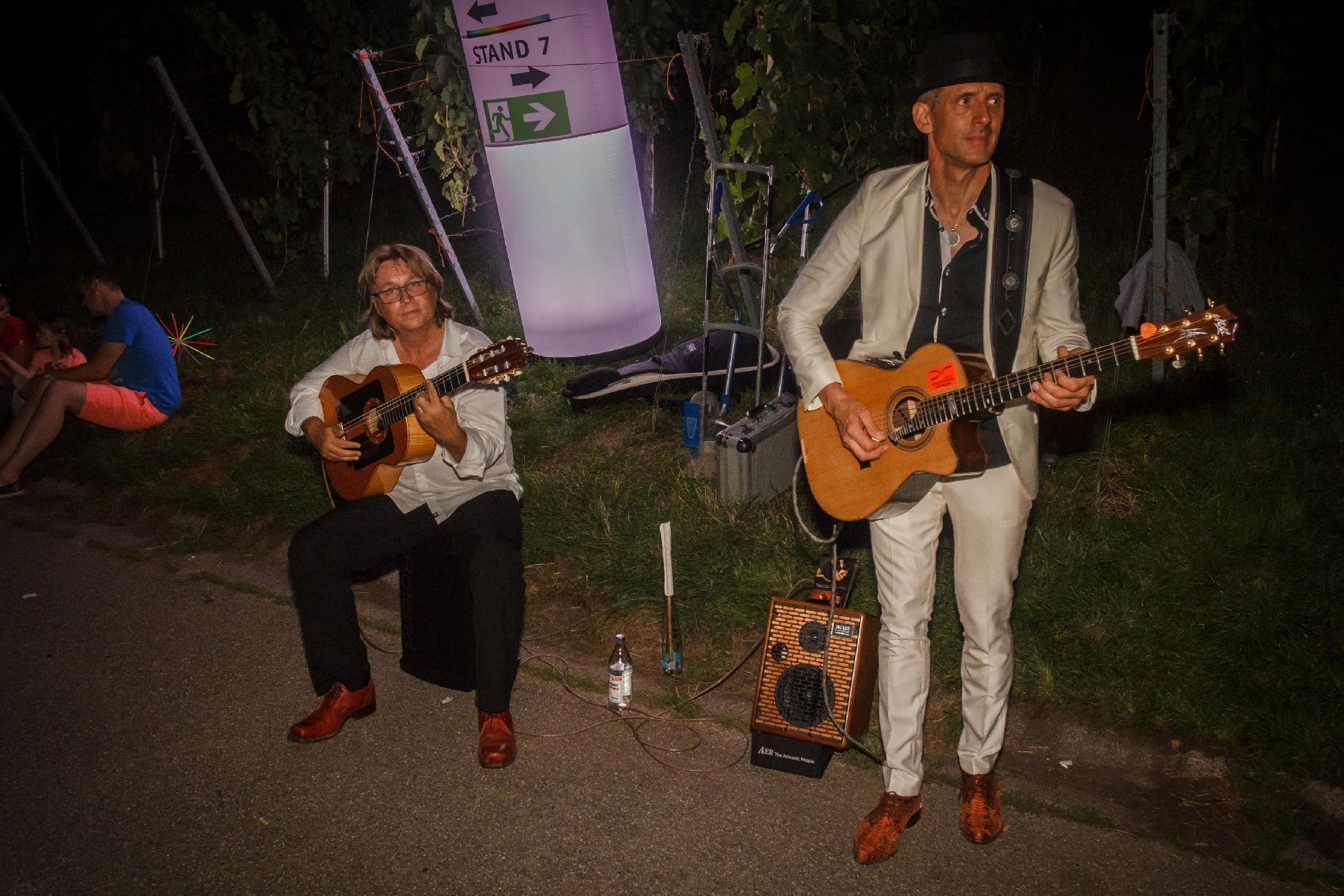 Auf dem Weg dorthin weist ein Leuchtobelisk aus Plastik den Weg zum Open-Air-Kino, wo Woody Allens „To Rome with Love“ läuft, ein gescheiter Film mit geschliffenen Dialogen. Wieder was eher Feinsinniges, so wie auch die meisten der Musiker, die zwischen den 18 Stationen mit Ständen hiesiger Wengerter unterwegs sind, mal hier, mal da, wo gerade Platz genug für einen Spontan-Gig ist. Etwa das Trio Balkanesco mit slawischer Folklore, das Duo „Magic acoustic Guitars“, das Goodlife-Jazztrio oder, als Promi des Abends, Lee Mayall und seine Unplugged-Band, ein Neffe des Altmeisters John Mayall. Außerdem ist ein „Walk Act“ unterwegs, The Gentlemen, Anzugträger auf Stelzen, edel, elegant, auffallend nicht nur durch ihre Größe. Sondern durch die Art der Fortbewegung. Dies trifft auch für die Teilnehmer einer Segway-Tour durch die Weinberge bei Schnait zu, noch so ein besonderes Angebot des Weinstadt-Marketingvereins.