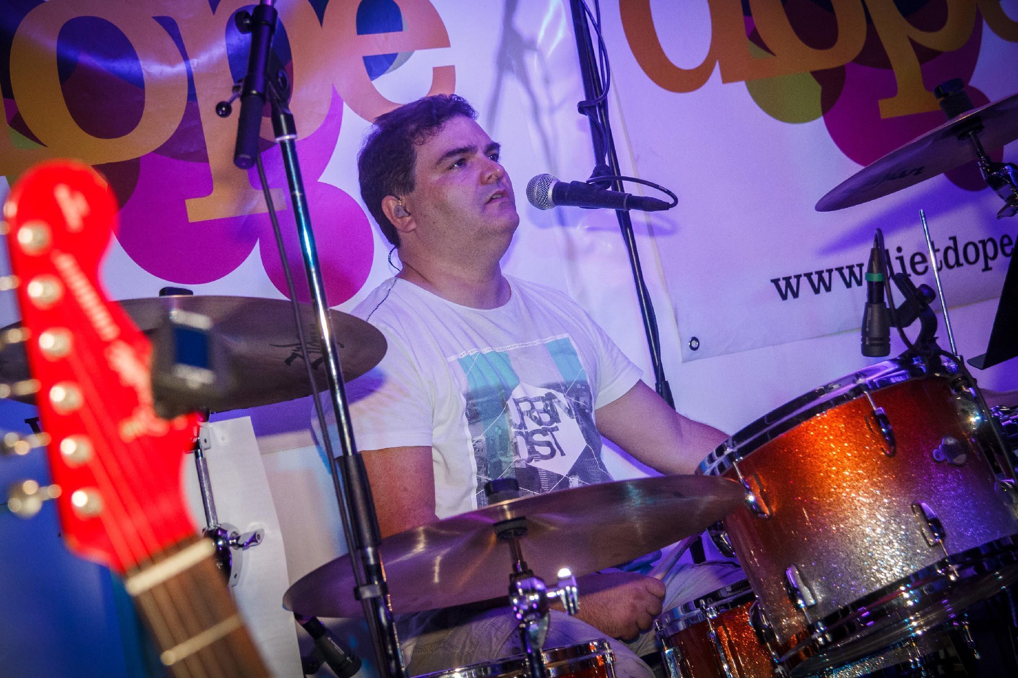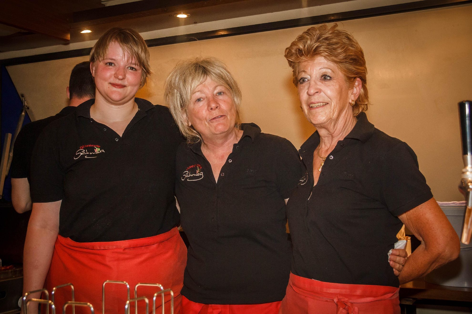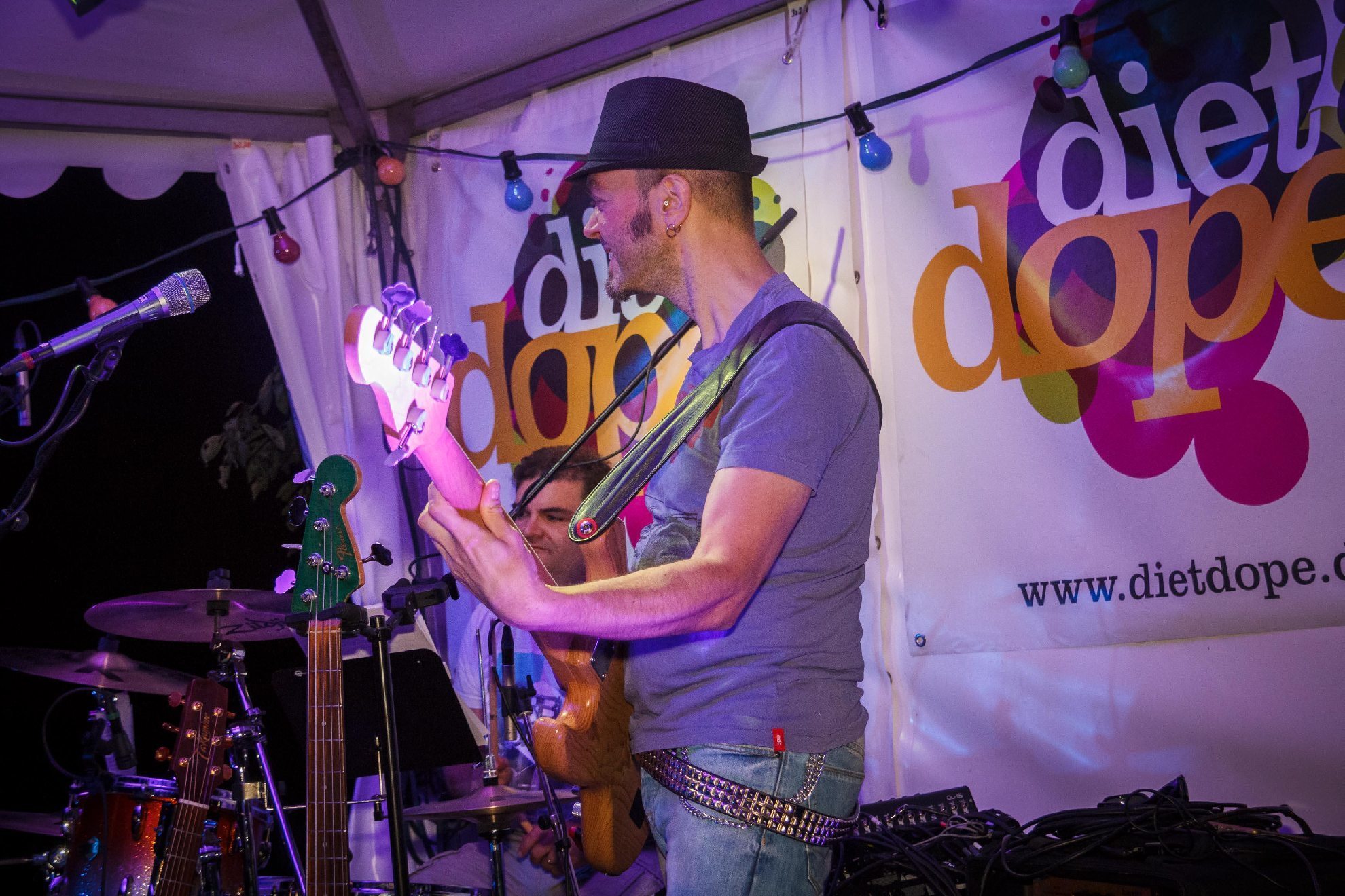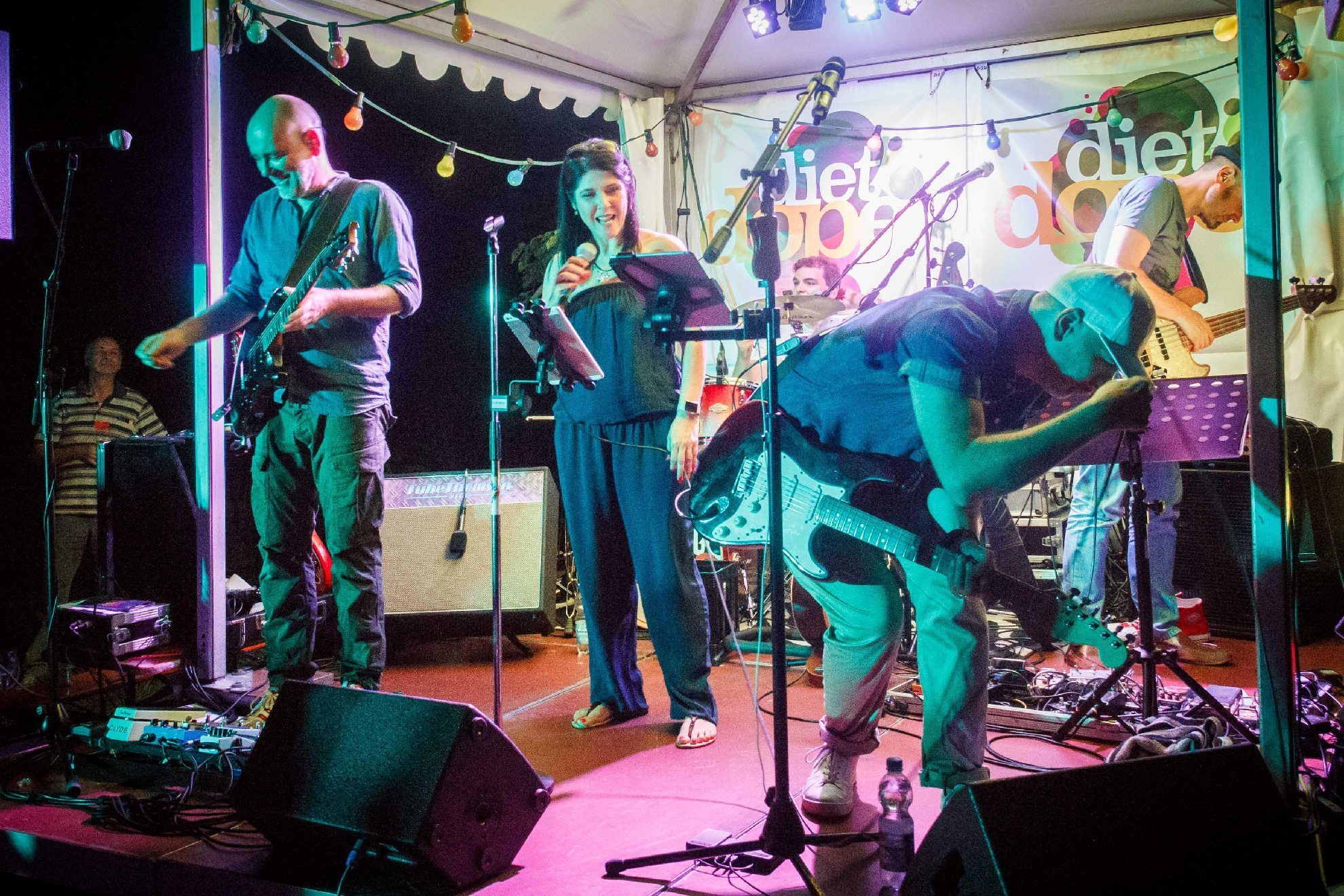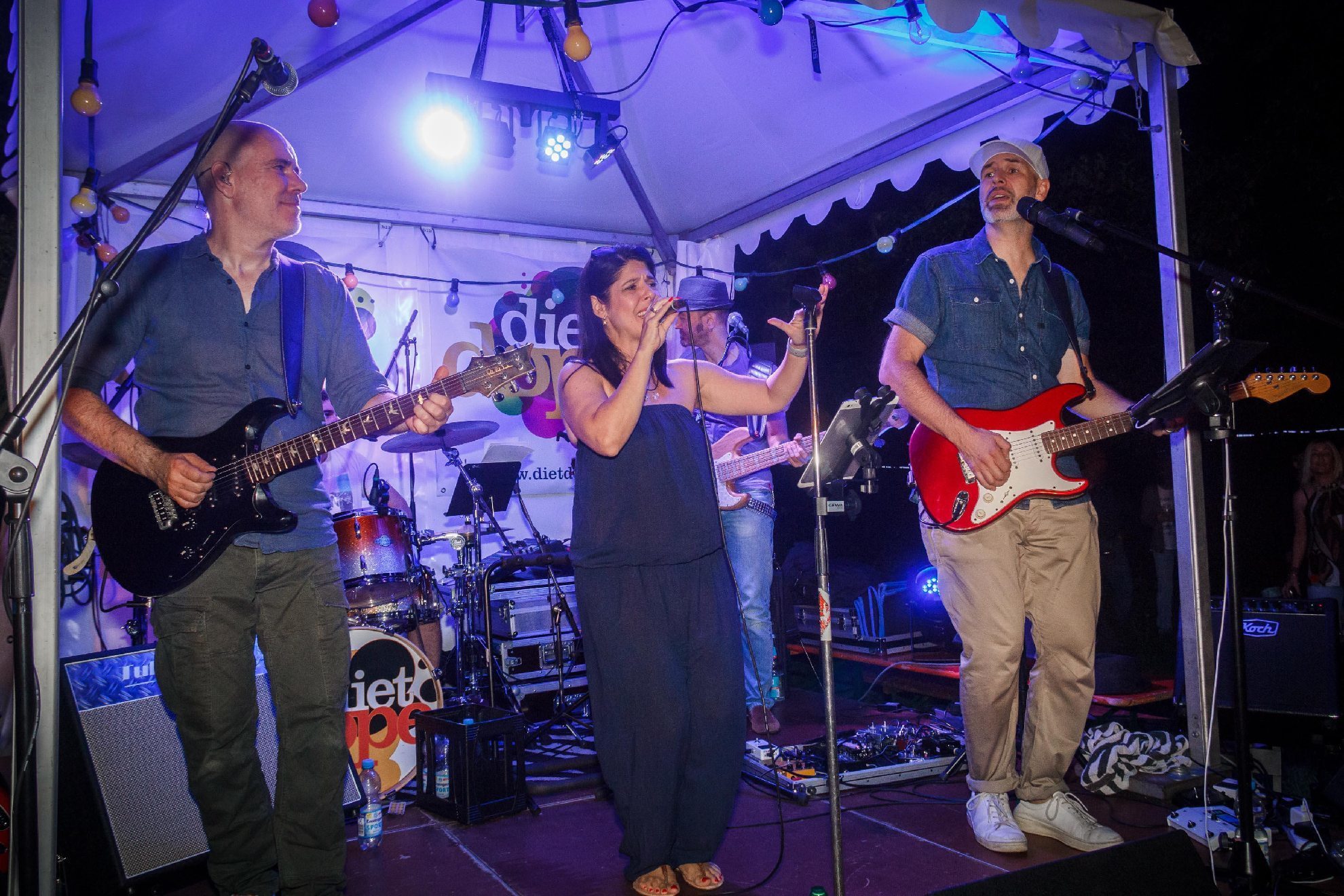 Das Feuerwerk-Finale ist auch für Hartmut Lenz und Alexander Schlesinger vom Jazzclub etwas, das man genießen kann. „Wunderschön“, so Lenz, sei das Spiel mit Farben und Feuer, vor allem an der „Pole Position“, wie Schlesinger den Standort des Clubs oben in den Weinbergen bezeichnet. On top of the world, um’s im Blues-Idiom zu sagen - weiter oben wär’s schon Himmel. Wozu freilich die Band auf der Bühne irgendwie in reizvollem Kontrast steht. Hell’s Hefe, ein Schwaben-Quintett in Blaumännern, das Rock-Klassiker wie „(Living on) Tulsa Time“ einschwäbelt in „Schenk mir no a Woiz’n ei“. Grundsolide, ebenerdig, bodenständig, breitbeinig realistisch und insofern nicht ganz passend zum luftig-himmlischen „Pole Position“-Ambiente. Vor der Bühne drängeln und schieben die Leute, ein paar schaffen es sogar, zu schwofen, Rock’n’Roll-Paartanz. Respekt. Ansonsten kannst du froh sein, wenn du es durch die Menge schaffst, etwa um runter zur nächsten Station zu gehen.