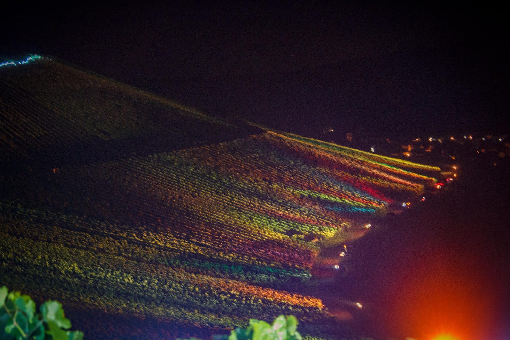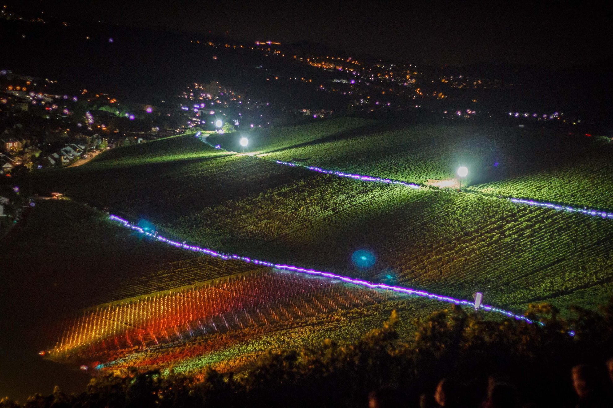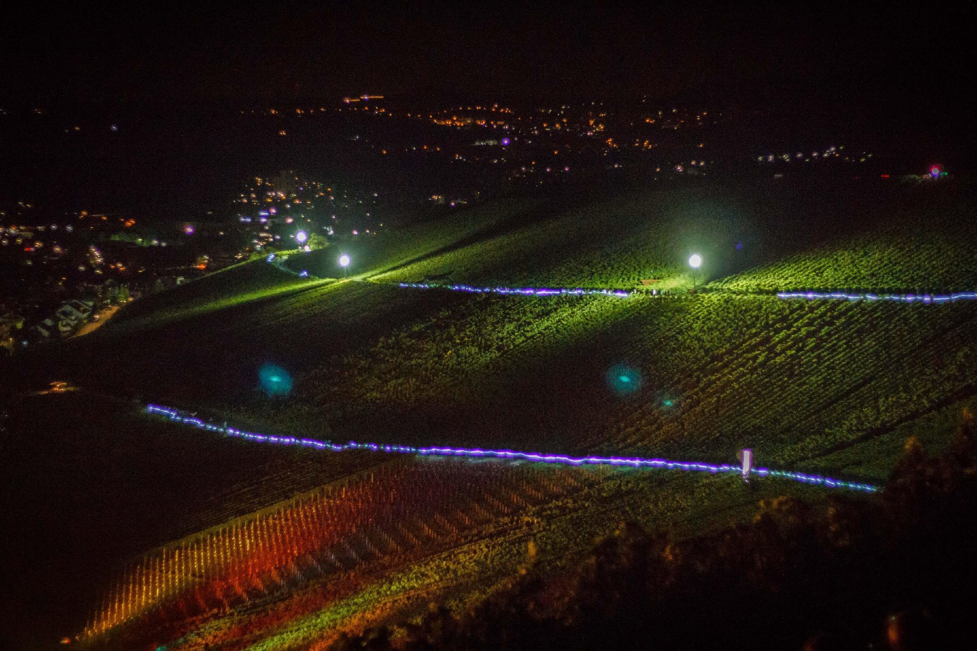 Weinstadt. Leuchtender Weinberg zwischen Burgruine Kappelberg und den „Drei Riesen“. Ohne die Natur wär’s nichts geworden mit der Kultur beim Leuchtenden Weinberg – wenn etwa die Rebflur bei Beutelsbach nicht so schön wär, wie sie nun mal ist. So aber lief es wieder wunderbar. Mit Tausenden Besuchern trotz erhöhter Eintrittspreise und Sicherheitsvorkehrungen.