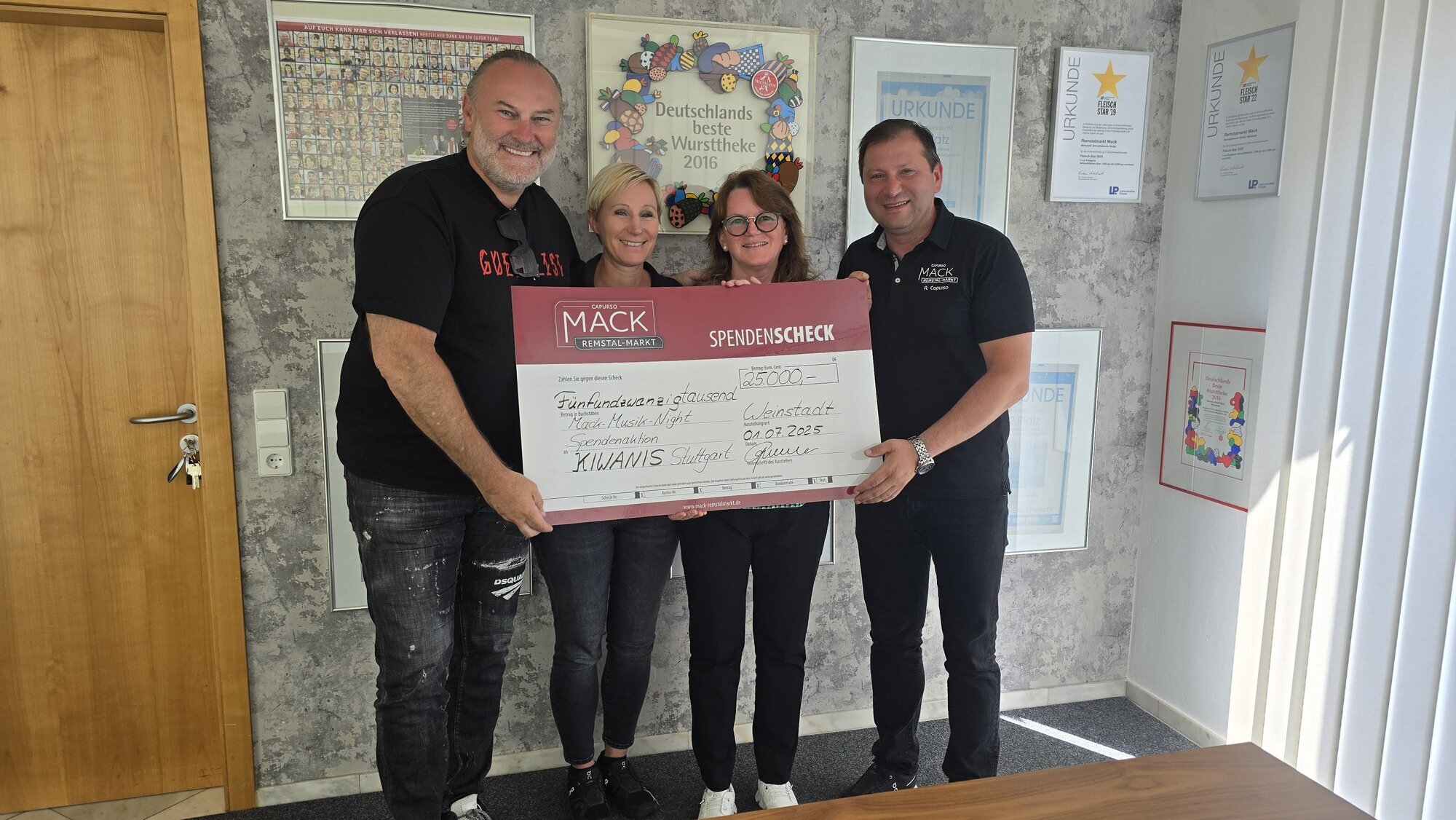 Weinstadt. Bei der Mack-Music-Night 2025 in der Eventlocation „Heppach 80“ in Weinstadt ist ein fünfstelliger Betrag für einen guten Zweck zusammengekommen. Nun wurde der Scheck offiziell übergeben. Veranstaltet hatte die Mack-Music-Night Ende März der Kiwanis-Hilfsfonds Stuttgart mit dem Remstalmarkt Mack aus Endersbach, der zu den fünf Supermärkten von Rocco Capurso gehört.