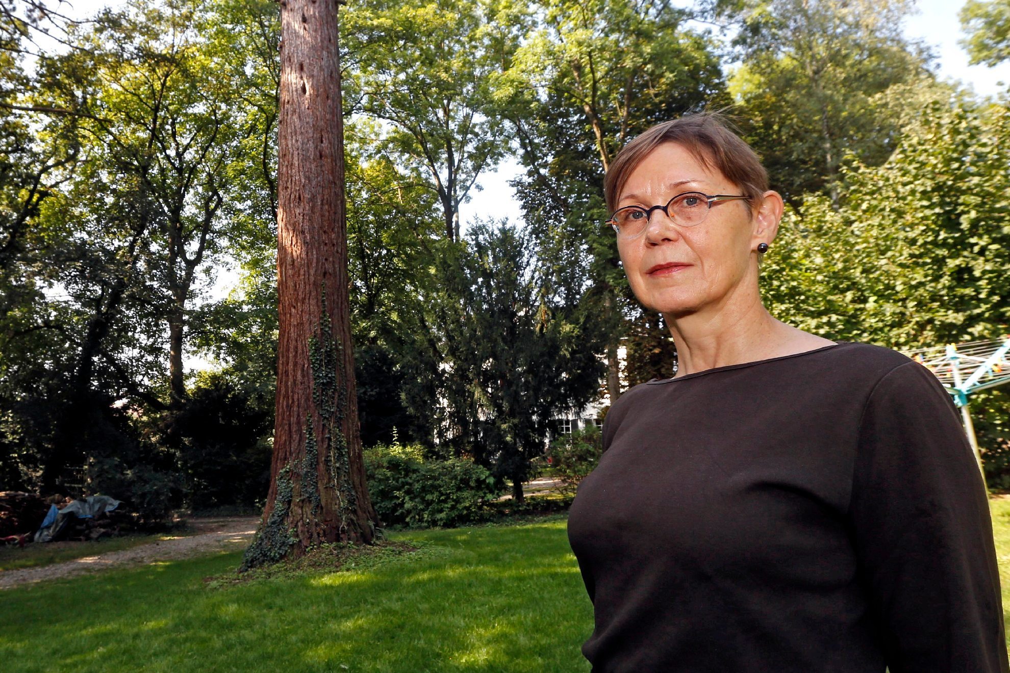 Clementine von Gaisberg vor dem eingekürzten Mammutbaum, der nun in dieser Form im Schlossgarten bleiben soll. Sie verwaltet die Charlotte-von-Gaisberg-Stiftung, der das Großheppacher Schloss und der Garten gehören. © Palmizi / ZVW