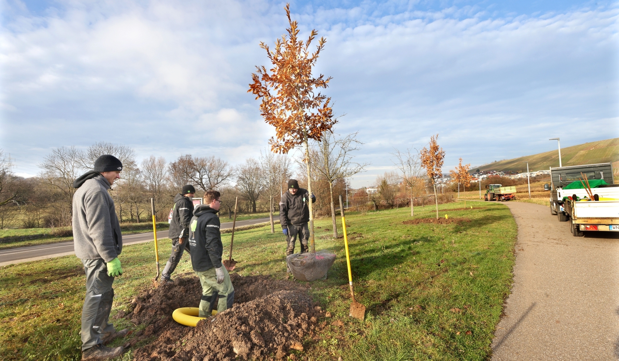 Endlich sind die ersten davon da: 130 „Zukunftsbäume“, zehn Jahre alte Bäumchen sechs verschiedener Sorten, die hoffentlich auch dem extremer werdenden Klima trotzen sollen, spendet die Uni Hohenheim der Stadt Weinstadt. Es ist Teil eines Experiments. Die Bäume sind durchnummeriert und die Wissenschaftler aus Hohenheim wollen an den ausgepflanzten Bäumen beobachten, wie sie sich über die Jahre an ihren Standorten entwickeln. Für Weinstadt ist es eine Möglichkeit, ihrem Ziel von 1000 Bäumen