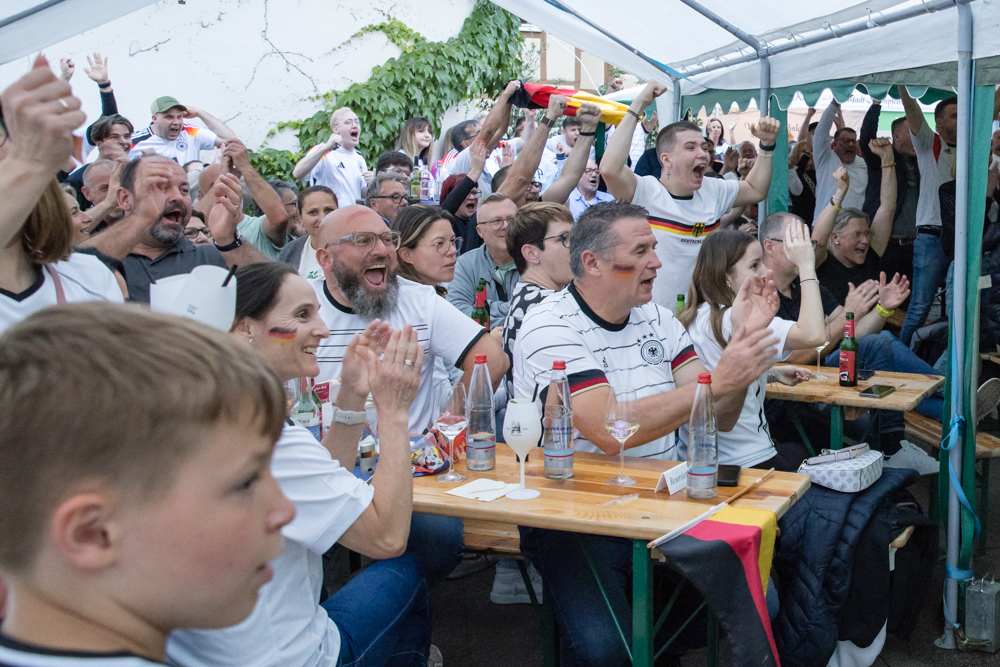 Wo sind eigentlich die Fähnchen an den Autos? Bisher sind kaum welche zu sehen. Auf dem Hof des Weinguts Kuhnle in Weinstadt-Strümpfelbach dagegen herrscht bereits schwarz-rot-goldene Stimmung: Die Menschen im bunt gemischten Publikum tragen Hüte, Trikots, Girlanden um den Hals oder haben sich eine Fahne umgehängt. Mit Schweinsteiger, Kroos, Führich, Mittelstädt und Matthäus sind sogar ein paar (ehemalige) Nationalspieler dabei – wenn es nach den Namen auf den Trikots geht.