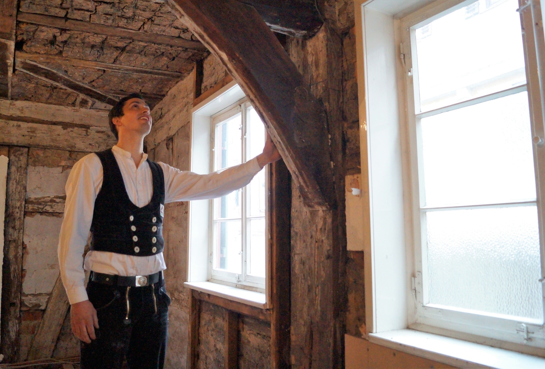 Fachmann Benjamin Fleck begutachtet das Holz im Erdgeschoss des Rathauses, das 1591 errichtet wurde. Der Balken, den er berührt, enthält Eichen- und Fichtenholz. © Holger Niederberger / Stadt Wein