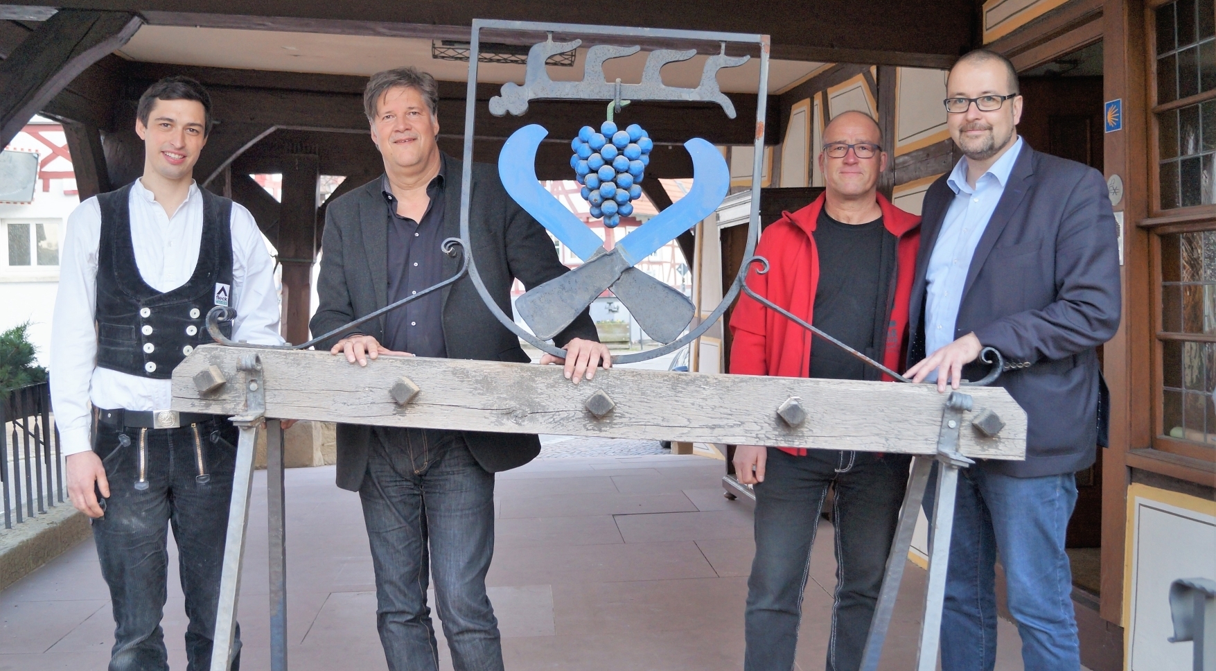 Von links: Benjamin Fleck, Baubürgermeister Thomas Deißler, Ralph Kögel (Hochbauamt) und Oberbürgermeister Michael Scharmann vorm Rathaus-Eingang. Das Kunstwerk, das sie extra fürs Bild herausgeholt haben, stand einst im Garten des früheren Strümpfelbacher Heimatmuseums.