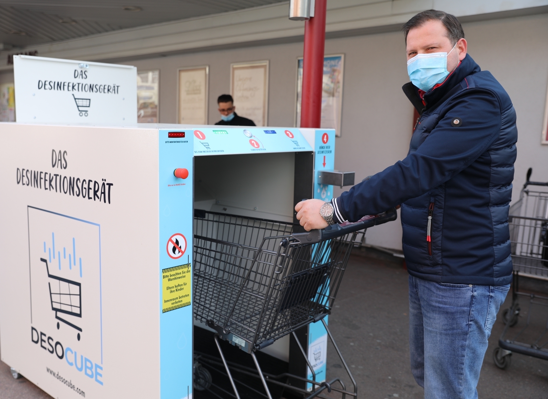 Vor dem Remstalmarkt Mack in Endersbach steht eine ganz besondere Einkaufswagen-Garage: Der rechteckige Kasten ist ein Desinfektionsgerät. Kunden können dort ihren Wagen hineinstellen und über eine Bedienleiste das Programm starten – dann wird der gesamte Wagen mit Desinfektionsmittel eingestäubt.