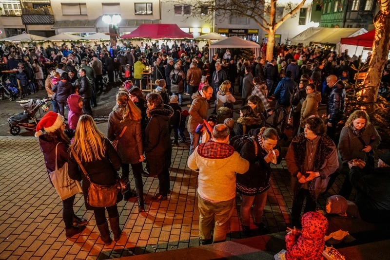 Nach den musikalisch von der Bläsergruppe untermalten Begrüßungsworten Pfarrer Rainer Köpfs und des Vorsitzenden des Sponsoringteams Gerhard Ehmann gehörte die Bühne ganz und gar der Grundschule. Mucksmäuschenstill war es auf dem weihnachtlich beleuchteten Marktplatz und schier kein Durchkommen, so dicht standen Eltern, Großeltern und Geschwister, als die Kinder und Lehrer unter Leitung von Direktorin Michaela Schönau ihre brandfrische CD mit Weihnachtsliedern vorstellten.