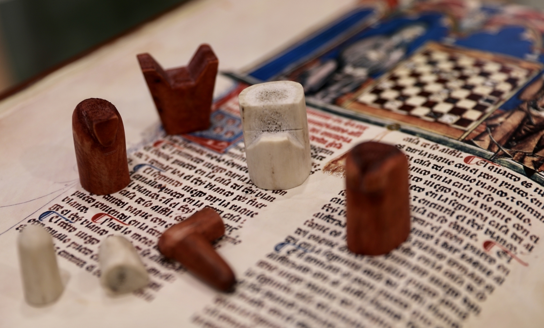 Schachfiguren und das Buch der Spiele: Im „Codex Alfonso“ sind in lateinischer Sprache die Regeln mittelalterlicher Spiele festgehalten. © Büttner / ZVW