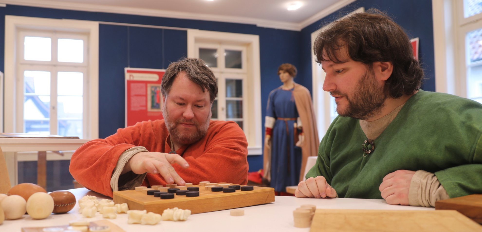 Der absolute Renner im Mittelalter: das Mühle-Spiel. Verschiedene Varianten sind überliefert, darunter die heute noch übliche Spielweise, aber auch das kleine Mühle, das mehr nach dem Tic-Tac-Toe-Prinzip funktioniert. „Mühle wurde seit der Antike immer und überall gespielt, man hat zum Beispiel auf der Marmorplatte des Throns in Aachen ein Spielbrett gefunden. Die makaberste Stelle für einen Mühle-Brett-Fund war auf einem Sarg“, erzählt Torsten Nägele. Das Problem mit dem handlichen kleinen Mühle-Spiel: „Es gewinnt eigentlich immer der, der den ersten Stein setzt“, verrät Jens Nägele.