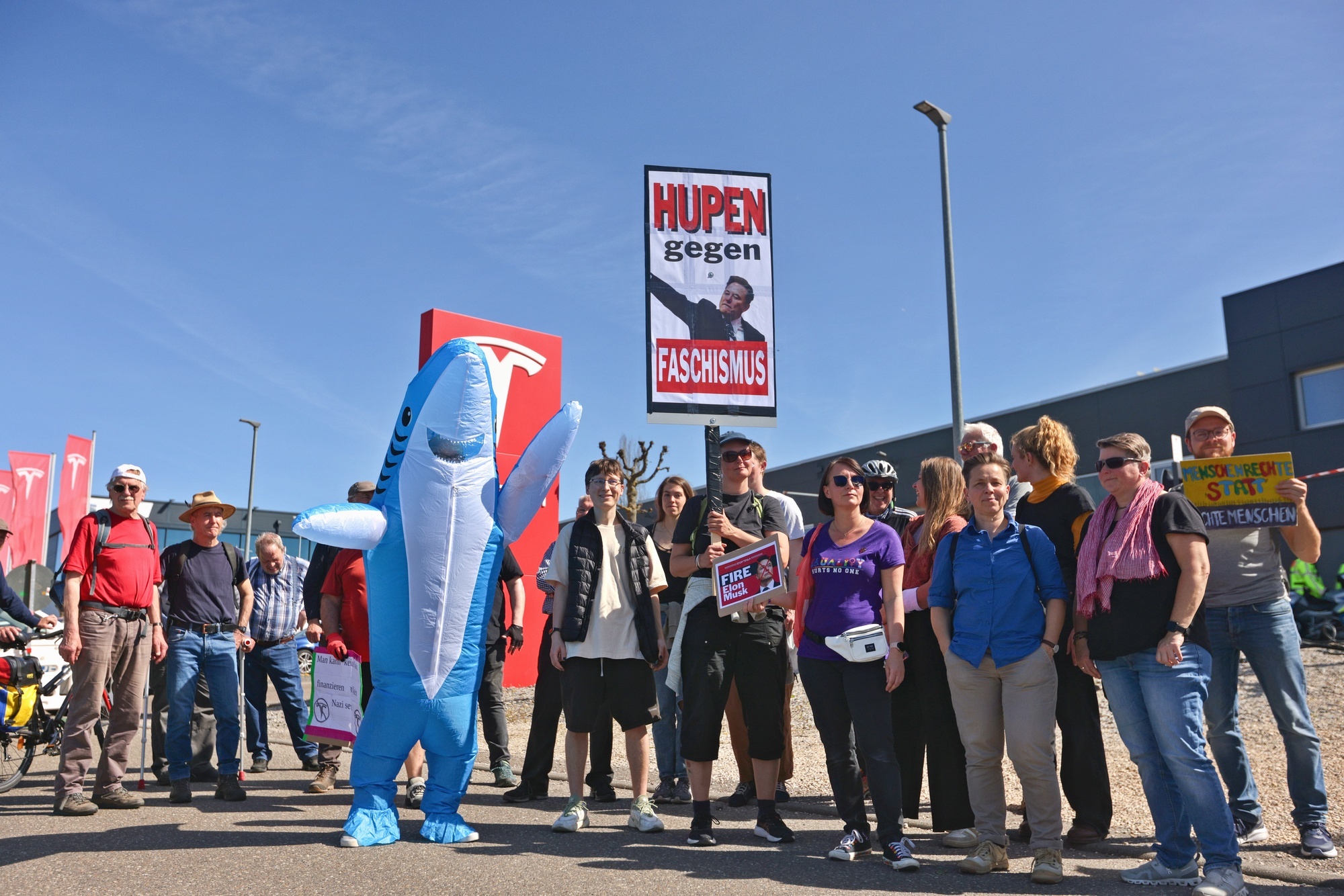 Weinstadt. „Die Bösen können machen, weil sich die Guten nicht wehren“, sagt Peter Bauer aus Schnait am Samstagmittag (12.4.) vor dem Bahnhof in Endersbach. Das soll sich ändern, deshalb ist er aus Protest gegen den „Wildwest-Kapitalismus“ mit dem Fahrrad hierhergekommen und läuft mit in dem kleinen Demonstrationszug, der von der Bahnhofstraße über den Kreisverkehr am Viadukt und vorbei an den Einkaufszentren bis zum Tesla-Autohaus in der Heerbergstraße zieht.