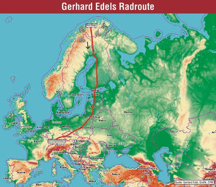 Bei Sonnenschein und 20 Grad Celsius hat Gerhard Edel schon öfter ein Zelt aufgebaut – allerdings war es da nie gleichzeitig Mitternacht. So ist das eben im Sommer am Rand des Polarkreises, wenn die Tage lang und die Nächte extrem kurz sind. Auch die Heimsuchung durch Mücken hat dort eine ganz andere Qualität. „Das ist eine Plage da unten“, sagt Gerhard Edel. Selbst wer sich mit Autan einsprüht, bekommt trotzdem noch genug Stiche ab. Aber der 70-Jährige ist keiner, der sich darüber beschwert, er hat ja gewusst, dass bei langen Radtouren Abstriche beim Komfort normal sind. Er hatte 25 Kilo schweres Gepäck bei sich, musste Kälte und Regen ertragen – und über weite Strecken einen äußerst üblen Gegenwind. Durchhalten lässt sich das nur mit einem starken Willen. „Man muss sich immer motivieren“, sagt Gerhard Edel. Er weiß schließlich aus Erfahrung, dass sich das letztlich auszahlt – auch dank all der Menschen, die er diesmal wieder auf seiner Tour kennengelernt hat. Menschen, denen er nie begegnet wäre, wenn er einfach nur von Hotel zu Hotel gefahren wäre. „Wir haben nie gewusst, wo wir übernachten.“