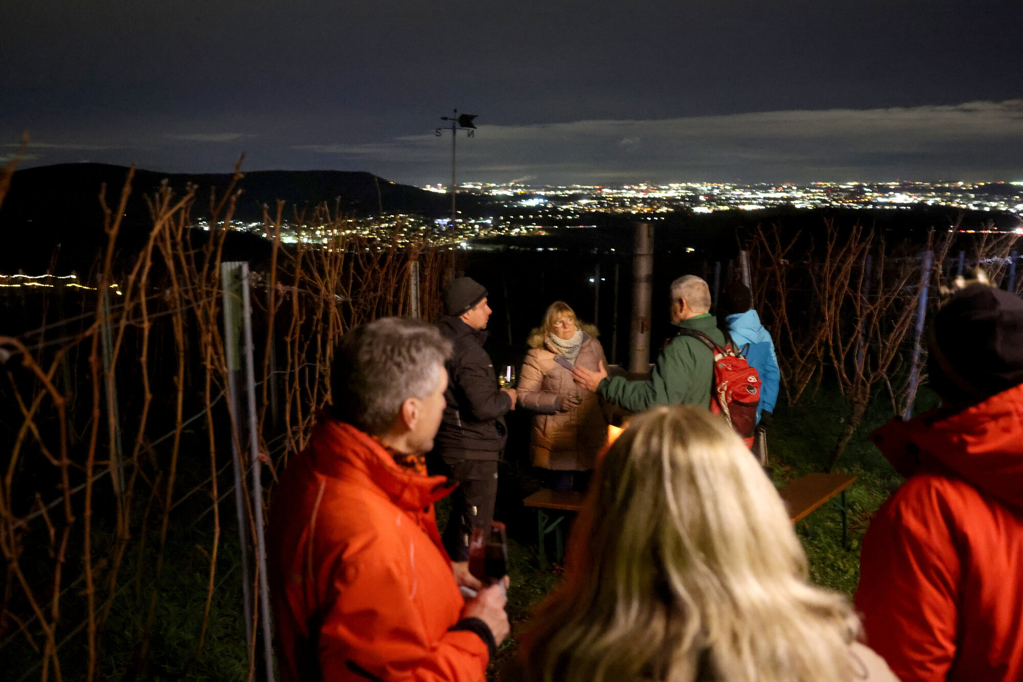 Weinstadt. Es war die Nacht der kleinen Lichter. Bei der zweiten Auflage des neuen Veranstaltungsformats Weinwinter in Weinstadt waren in den Rebflächen am Karlstein vor allem Stirnlampen und Handys gefragt, um zu den Wengerthäusle von Corina Oesterle und der Familie Kuhnle zu kommen. Denn anders als beim Start Ende Oktober 2025 war es diesmal am Montag schon kurz nach 17 Uhr richtig dunkel - kuhnacht. Und der Zugang zum Beispiel vom Parkplatz beim Landgut Burg in Richtung