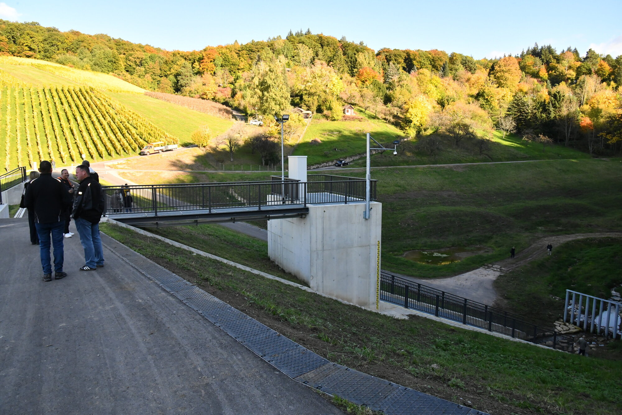 Weinstadt-Strümpfelbach. “Hier entsteht kein Stausee“: Oberbürgermeister Michael Scharmann hat bei der Einweihung des neuen Hochwasser-Rückhaltebeckens Schachen am Ortsrand von Strümpfelbach klargemacht, dass diese Idee nicht verfolgt werden kann. Mancher hatte schon gehofft, dass hier dann mit einem Stausee ein Tretbootverleih möglich wäre. Warum das nicht geht und was es eigentlich mit den komischen Flecken unten an der Mauer des Erdbauwerks Richtung Freibad auf sich hat,