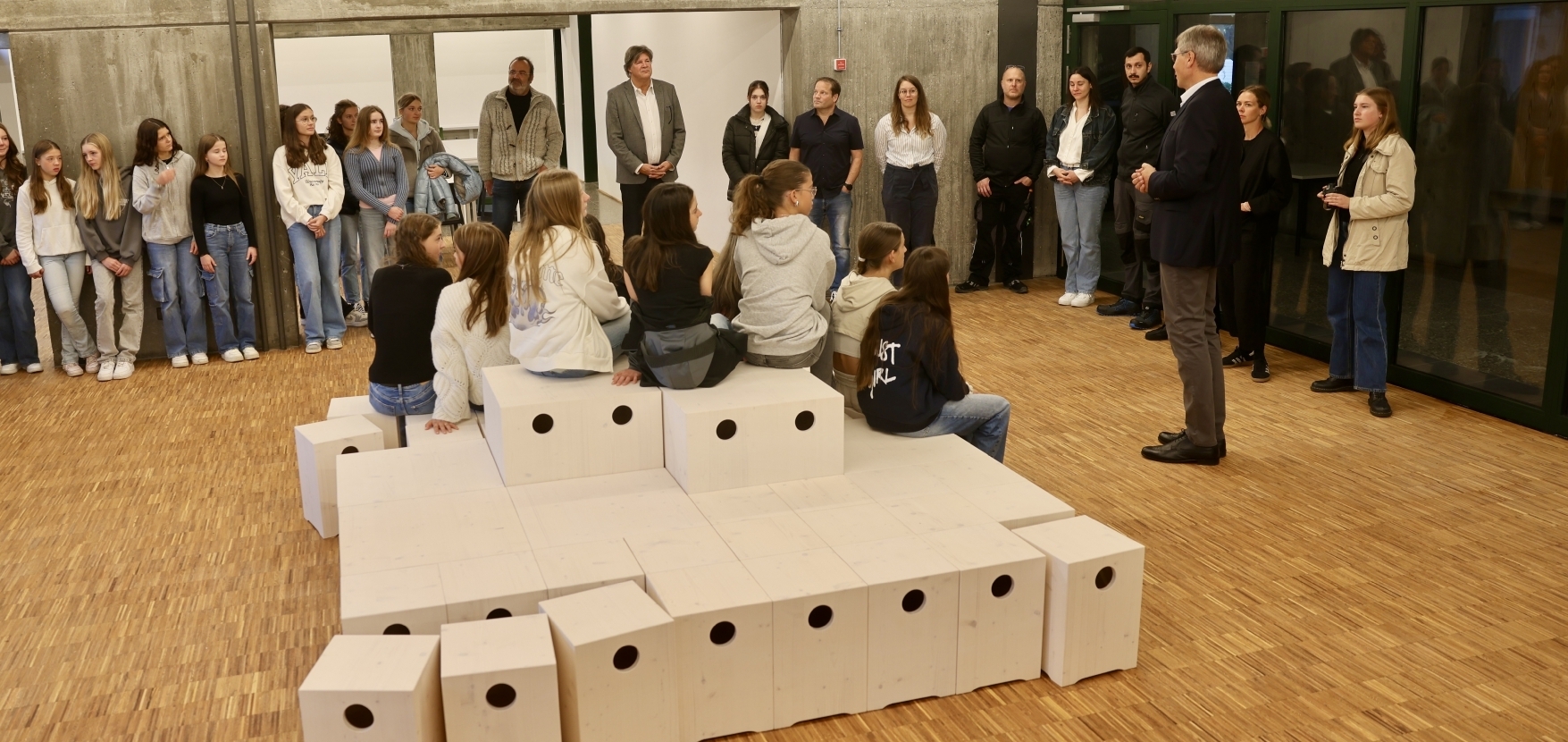 „Da hat die Stadt wirklich Geld in die Hand genommen“: Matthias Wenzke, Rektor des Remstal-Gymnasiums Weinstadt (RGW), freut sich über den frisch sanierten Schüleraufenthaltsraum. Am Montag, 30. September 2024, wurde er offiziell eingeweiht, im Beisein von Vertretern der Stadt und des zuständigen Architekturbüros „Studio Ö“ aus Großheppach. Viele Jahrzehnte hatte sich in dem Aufenthaltsraum nicht wirklich etwas verändert. Es hallte stark, von außen konnten die Lehrer nicht reinsehen und
