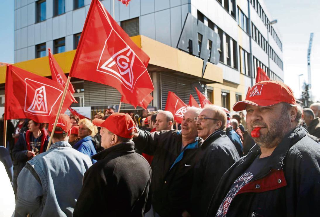 „Ich bin dagegen, Depp zu sein, ich bin dagegen, nett zu sein zu manchen Menschen, die meinen, sie müssten respektlos sein, bin gegen Bosse, die meinen, um der Chef zu sein, muss man eklig sein“: Das Lied „Widerstand“ von Gentleman wummert aus der Lautsprecherbox, die roten Fahnen tanzen im Wind unterm blauen Himmel, die Sonne sticht durch den Stoff, die Trillerpfeifen tröten, 200 Leute sind zusammengeströmt vor dem ATB-Tor, Werkbankveteranen und junge Burschen, eine Frau mit Kinderwagen – und sogar Niko, der weiße Westhighlandterrier, trägt eine IG-Metall-Mütze.