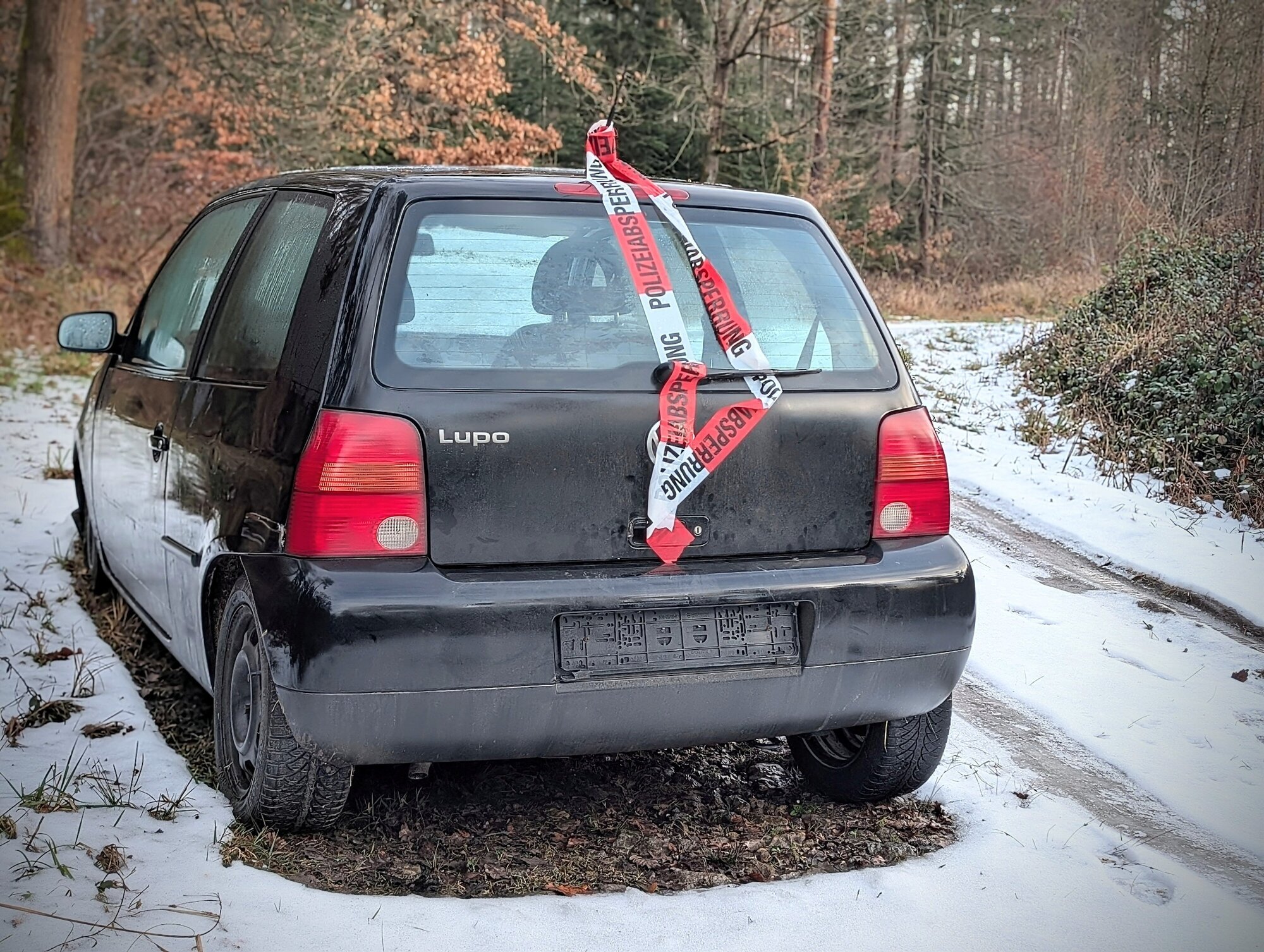 Diese Frage dürfte sich manch Autofahrer zuletzt gestellt haben - zumal ein rot-weißes Polizeiabsperrungs-Flatterband von der Antenne am Heck herunterhängt. Außerdem fehlen an dem VW Lupo beide Kennzeichen. Was beim näheren Hinschauen außerdem