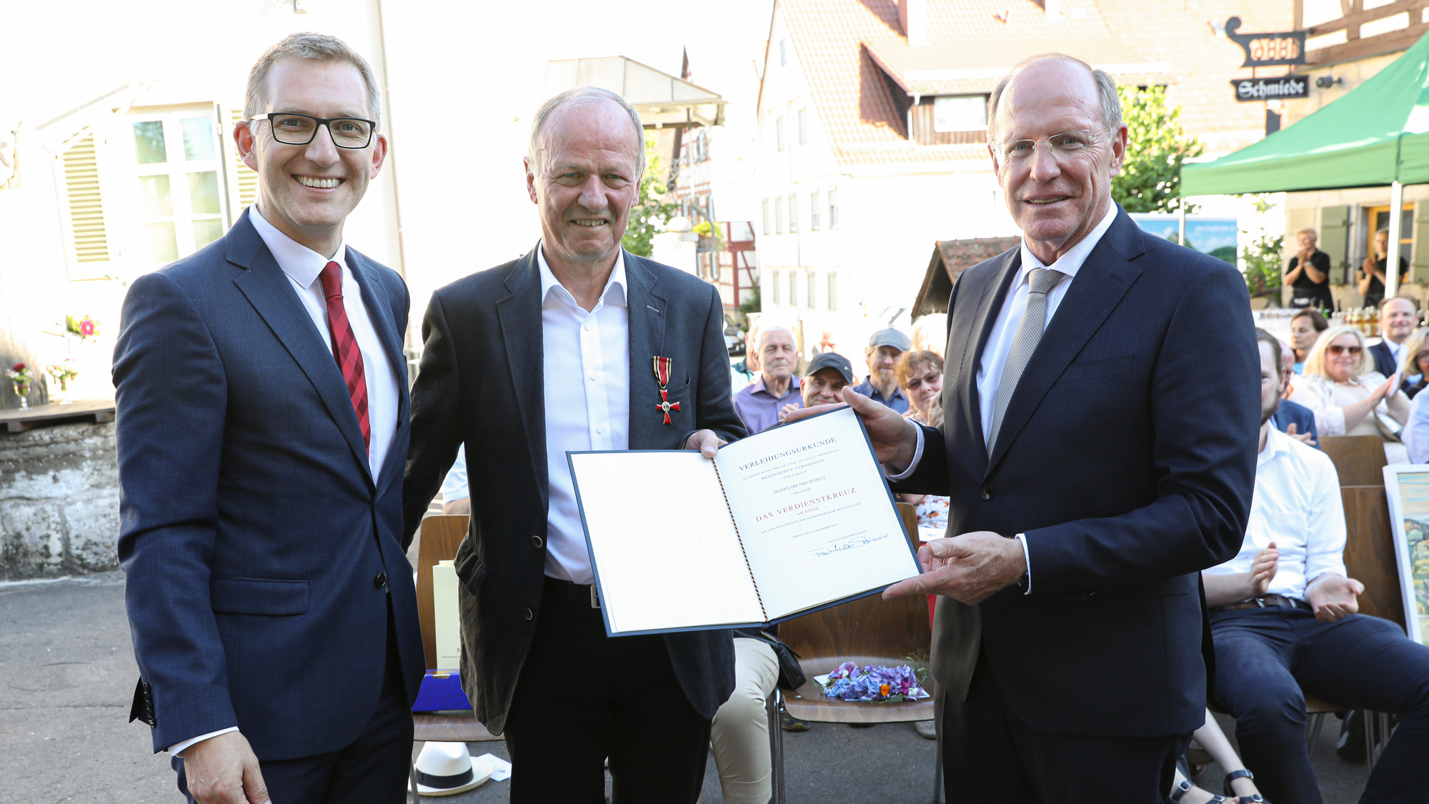 Besser hätte das Wetter nicht sein können und würdiger auch nicht der Rahmen der Veranstaltung. Dieter Frey, langjähriger Vorsitzender des Historischen Vereins Welzheimer Wald, hat am Freitagabend im Museumshof aus den Händen von Staatssekretär Wilfried Klenk das Bundesverdienstkreuz bekommen. Damit würdigt der Bundespräsident der Bundesrepublik Deutschland das außerordentliche ehrenamtliche Engagement des Welzheimers.