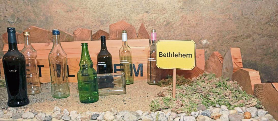 Gerhard Rulle aus Kaisersbach-Weidenhof zeigt eine Krippe, die er zur Hochzeit von seinen Eltern bekommen hat. „Josef war ein Zimmermann“, ist auf einem Schild einer Vitrine zu lesen. Dort sind all die Handwerkssachen zu sehen, die früher für die Krippenherstellung benötigt wurden. „Unsere Ausstellung sollte nicht bierernst verstanden werden“, betont Roland Birkle und zeigt auf eine Flascheninstallation, die eine Krippe darstellen soll. Eine andere Darstellung greift auf Holzscheite und Holzbalken zurück.