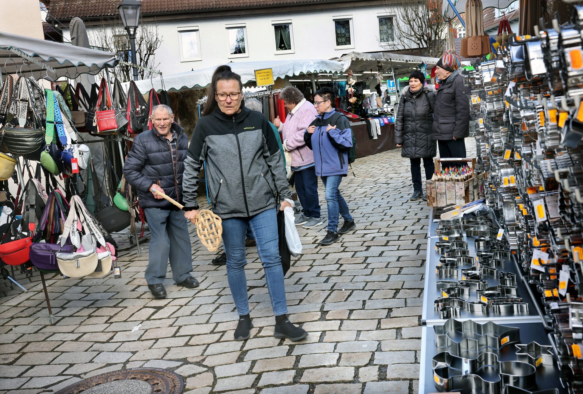 Die Laune der Marktleute und auch der über den Kirchplatz schlendernden Besucherinnen und Besucher ist gut. Das Wetter ist frisch, aber größtenteils sonnig. Und dennoch: Der Andrang in Welzheim könnte um die Mittagszeit größer sein. Meint zumindest der eine oder die andere, die hier ihren Stand aufgebaut haben, und an Essbarem, Nützlichem und Dekorativem alles zu verkaufen, was die Seele eines Krämermarktes eben ausmacht: viel Kram.